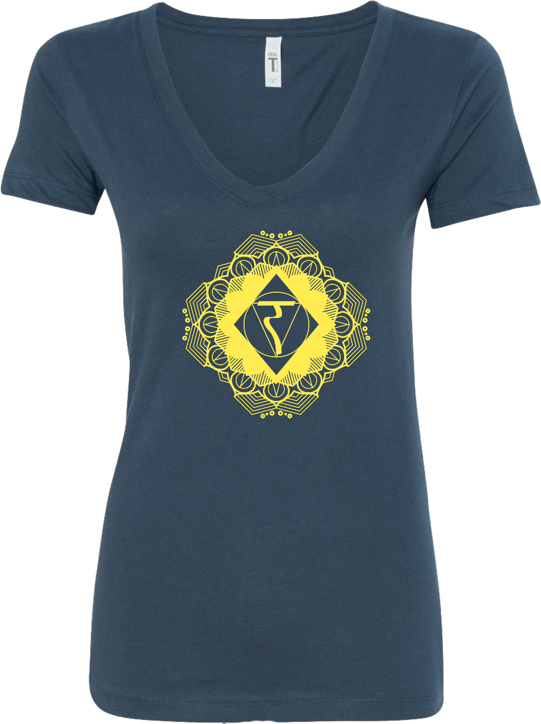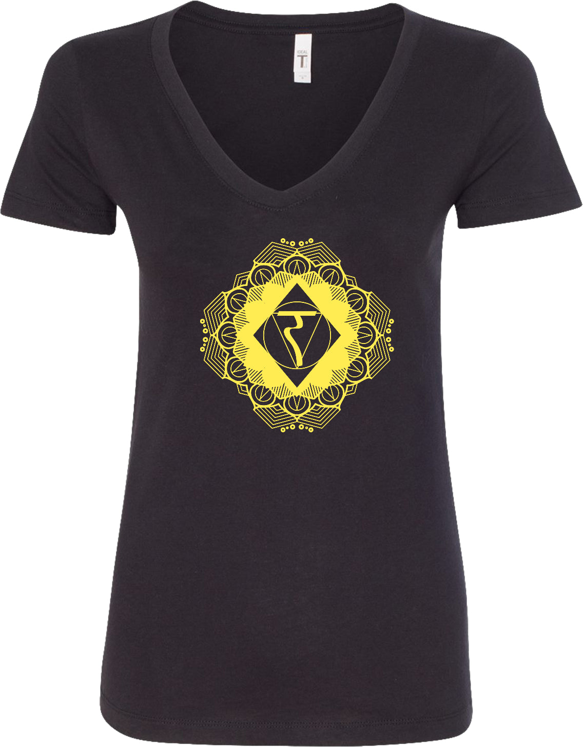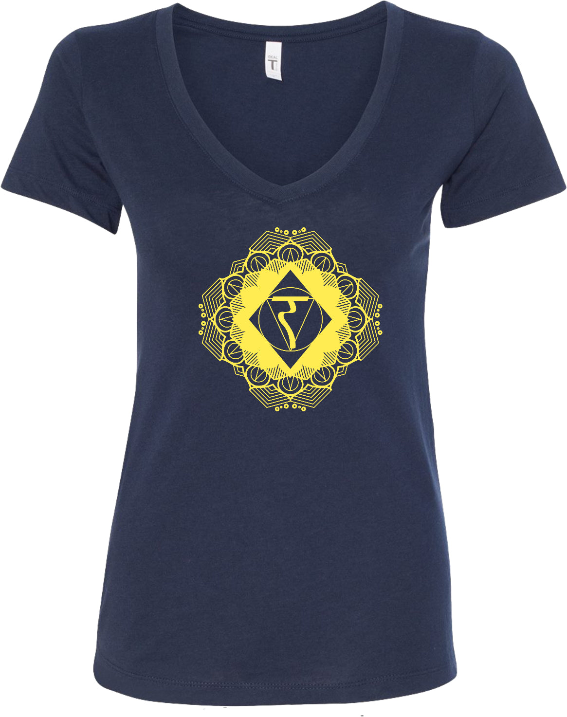 - A ladies blended v-neck t-shirt featuring a cool version of the third primary chakra, Manipura