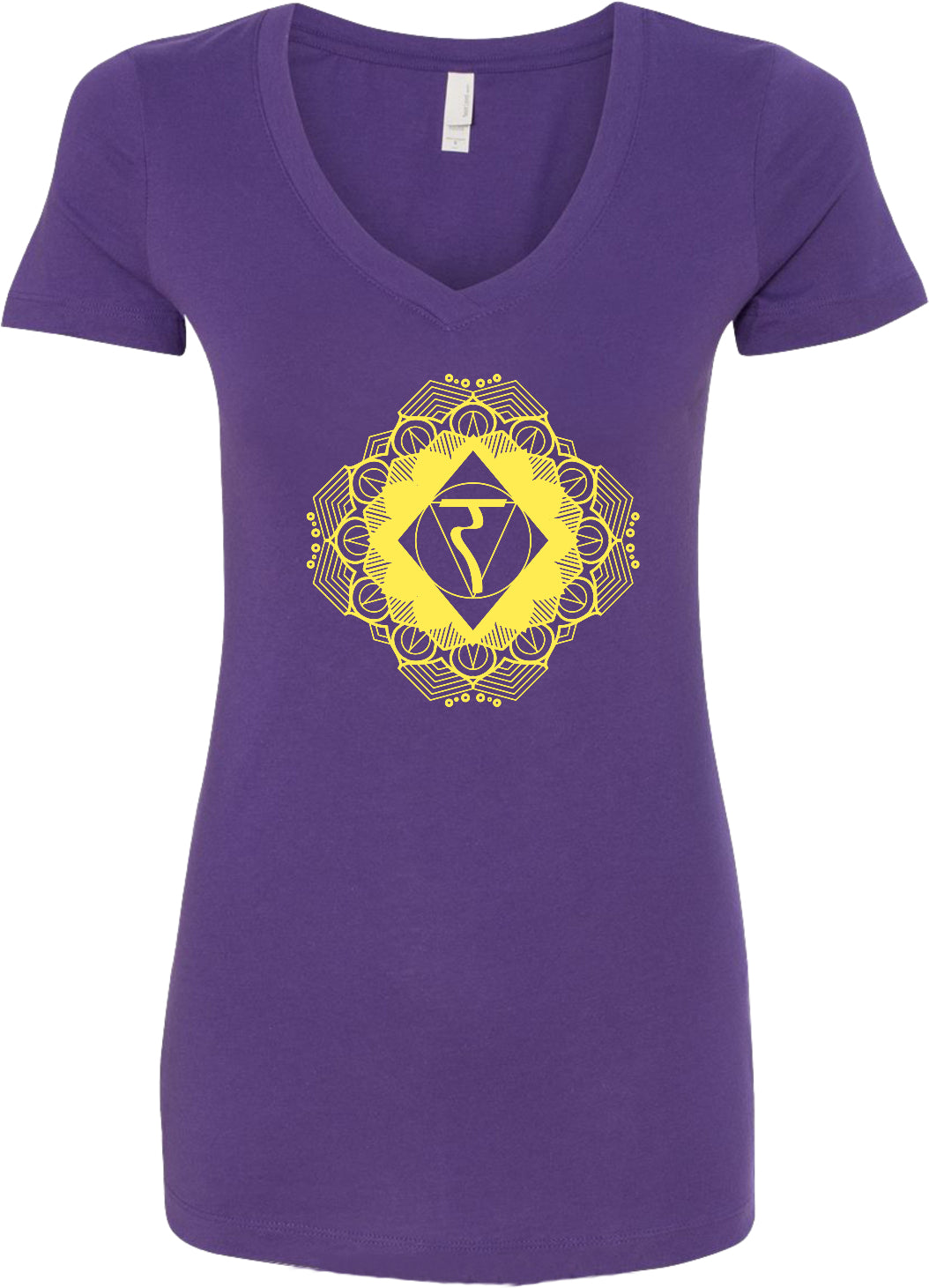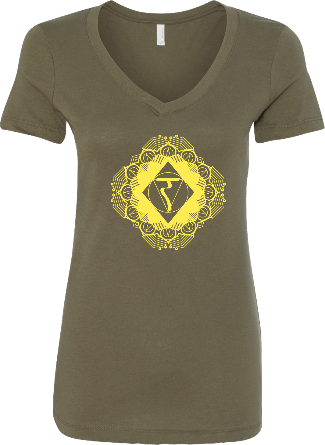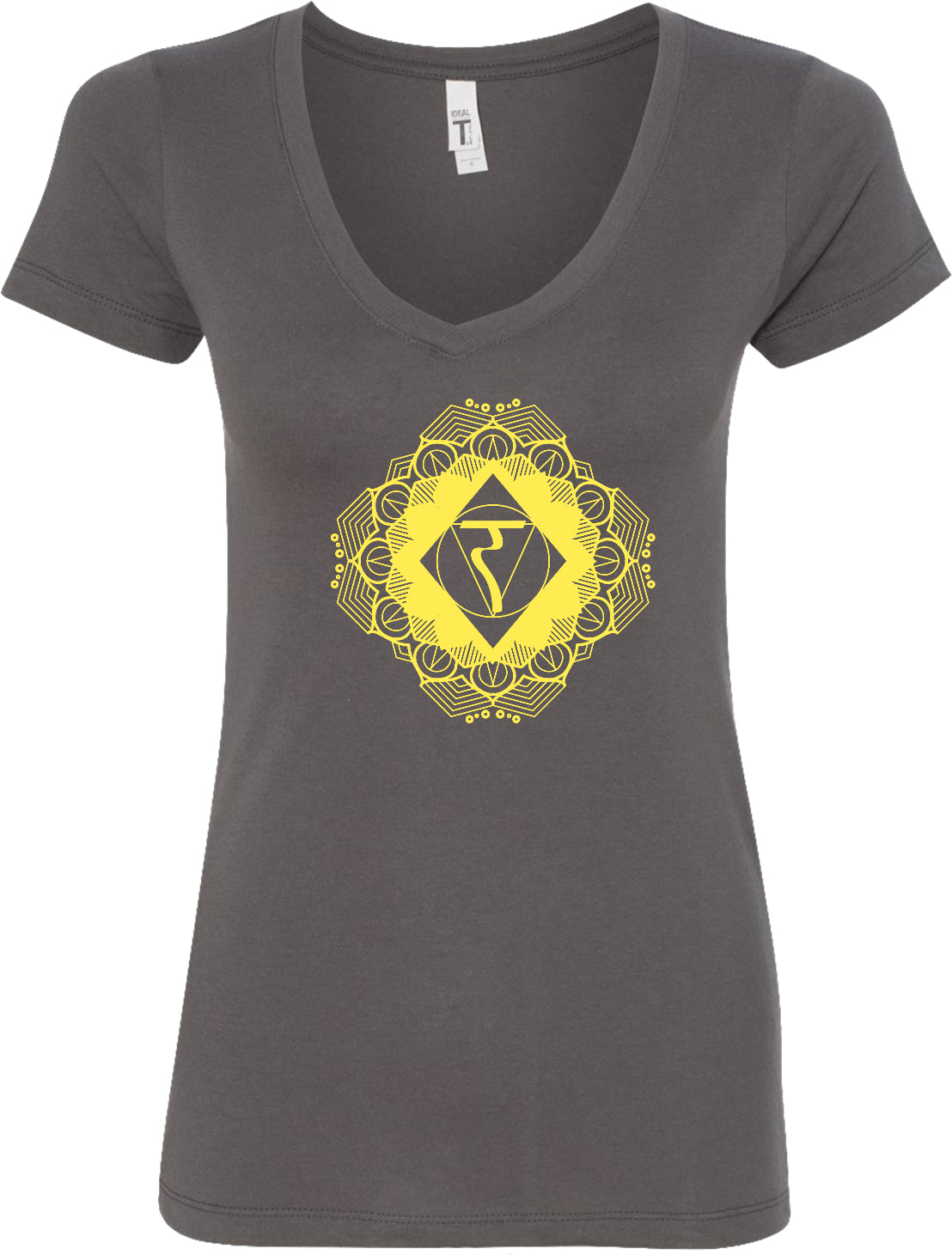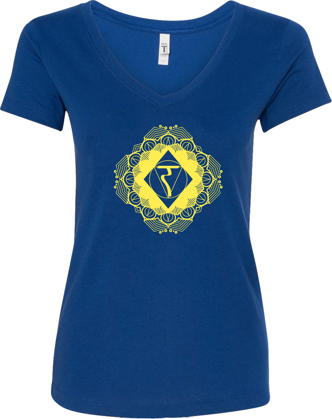 - A ladies blended v-neck t-shirt featuring a cool version of the third primary chakra, Manipura
