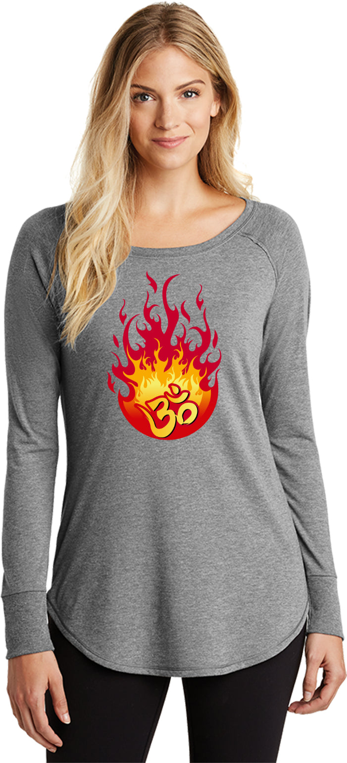 - A ladies tri blend long sleeve shirt featuring the aum symbol on fire