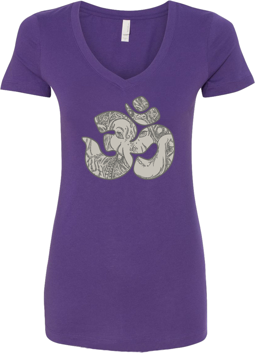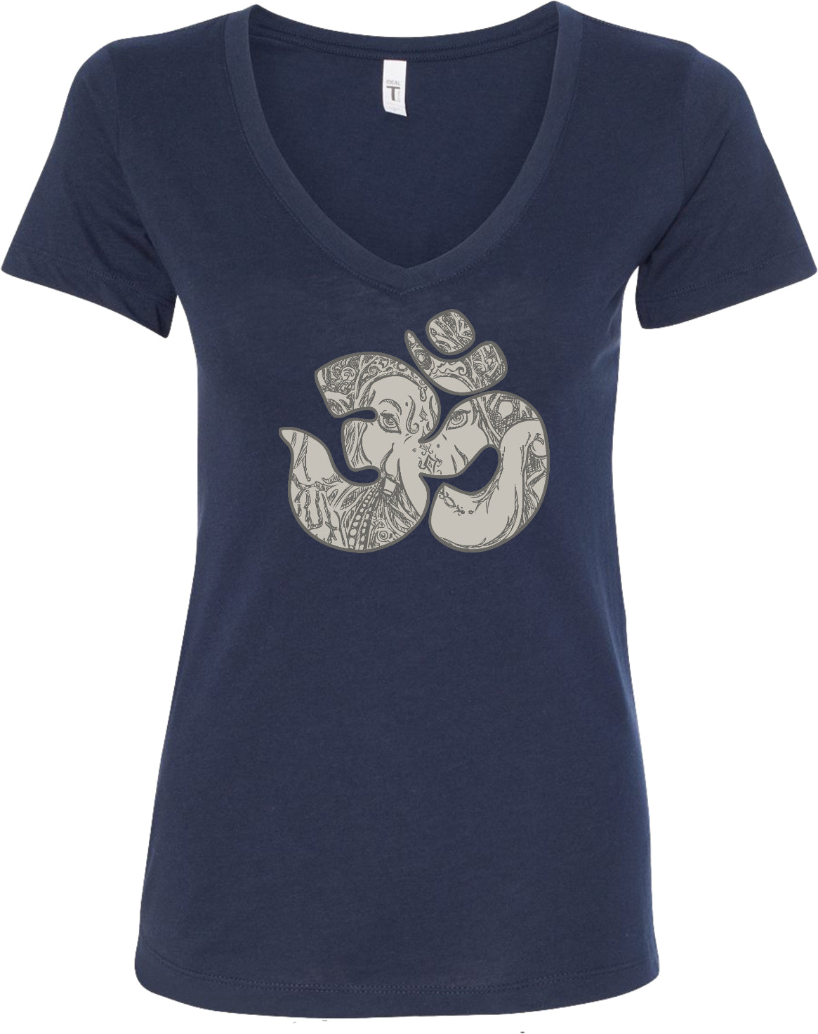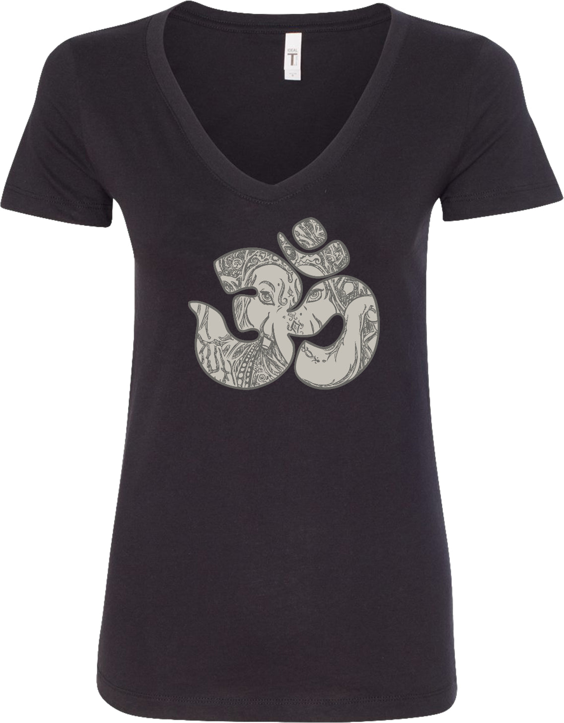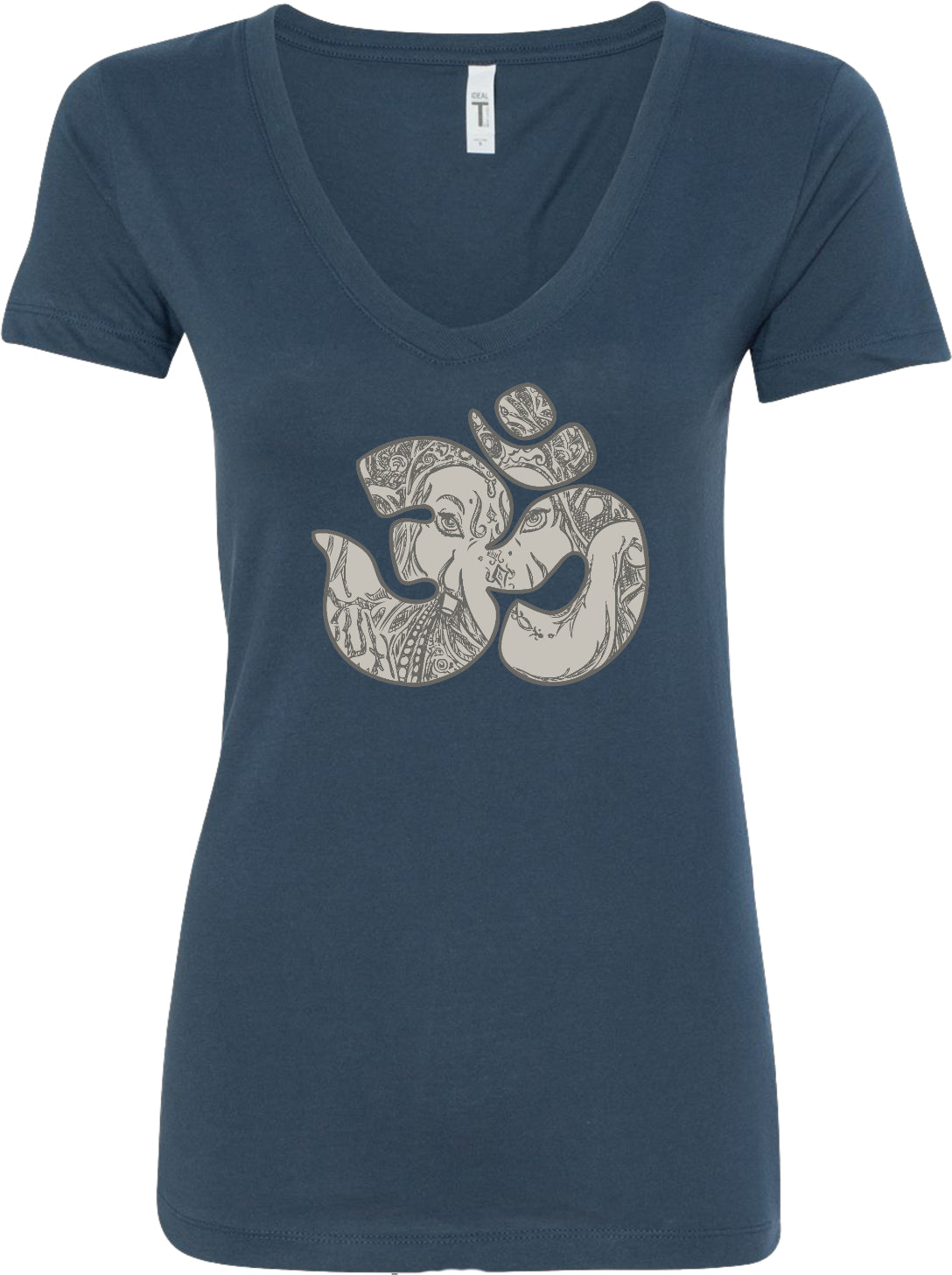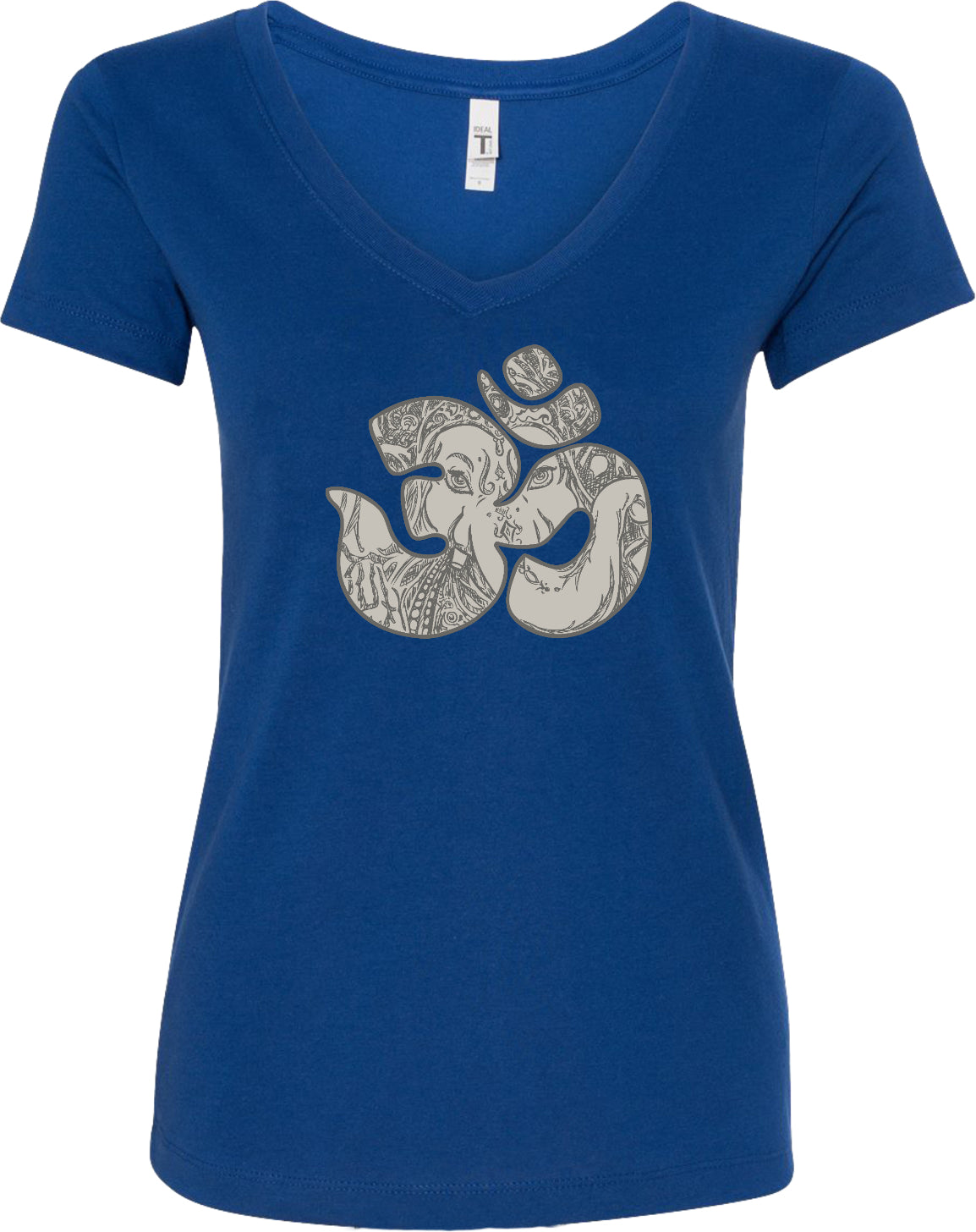 - A ladies blended v-neck t-shirt featuring the wise Ganesha inside of the sacred aum symbol