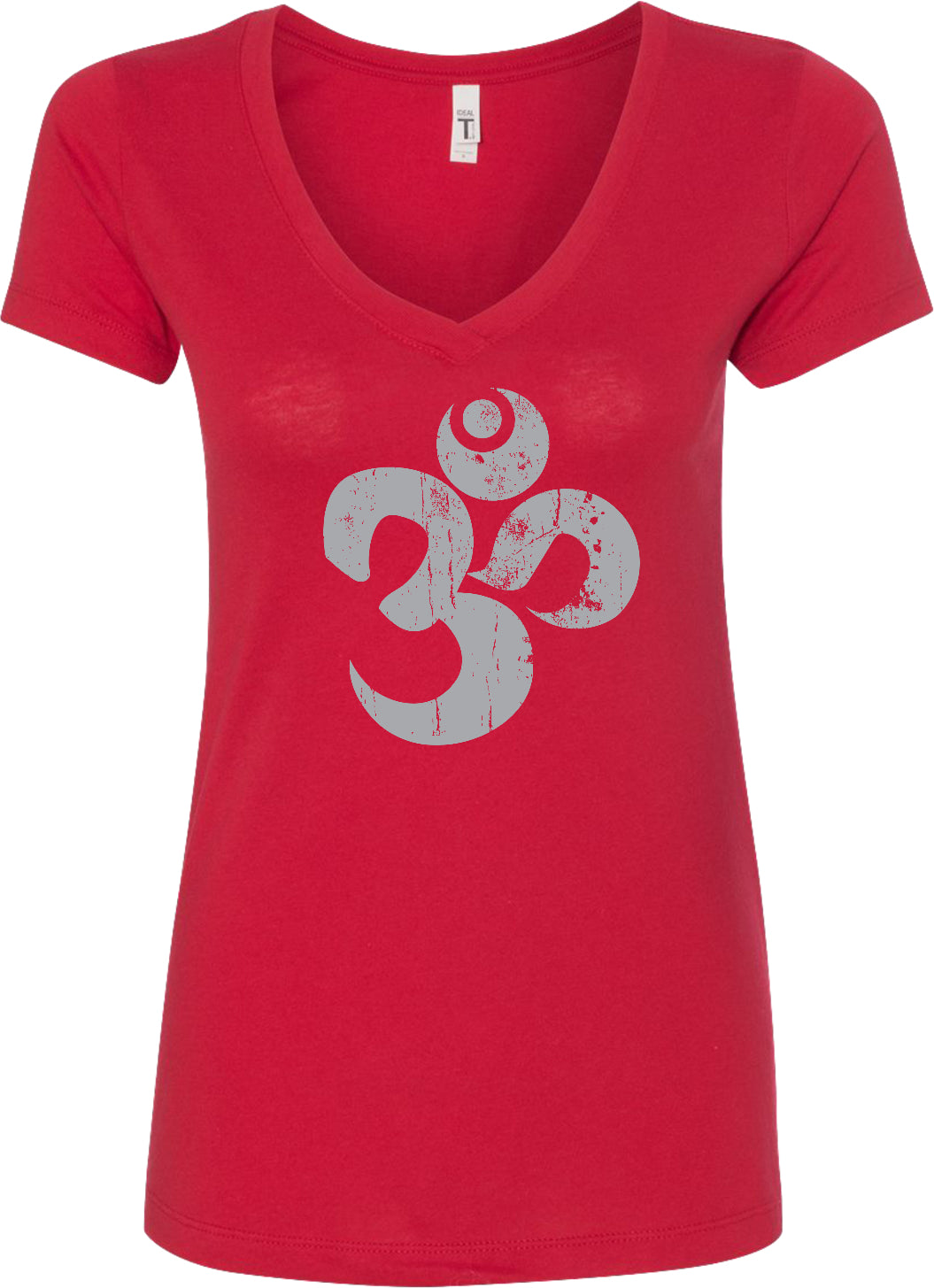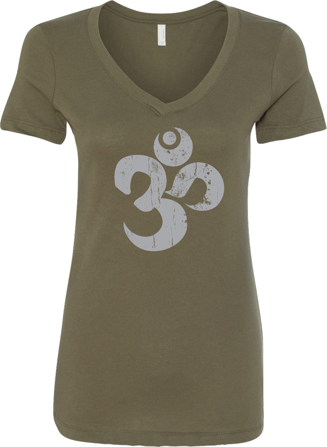 - A ladies blended v-neck t-shirt featuring a grey vintage aum symbol
