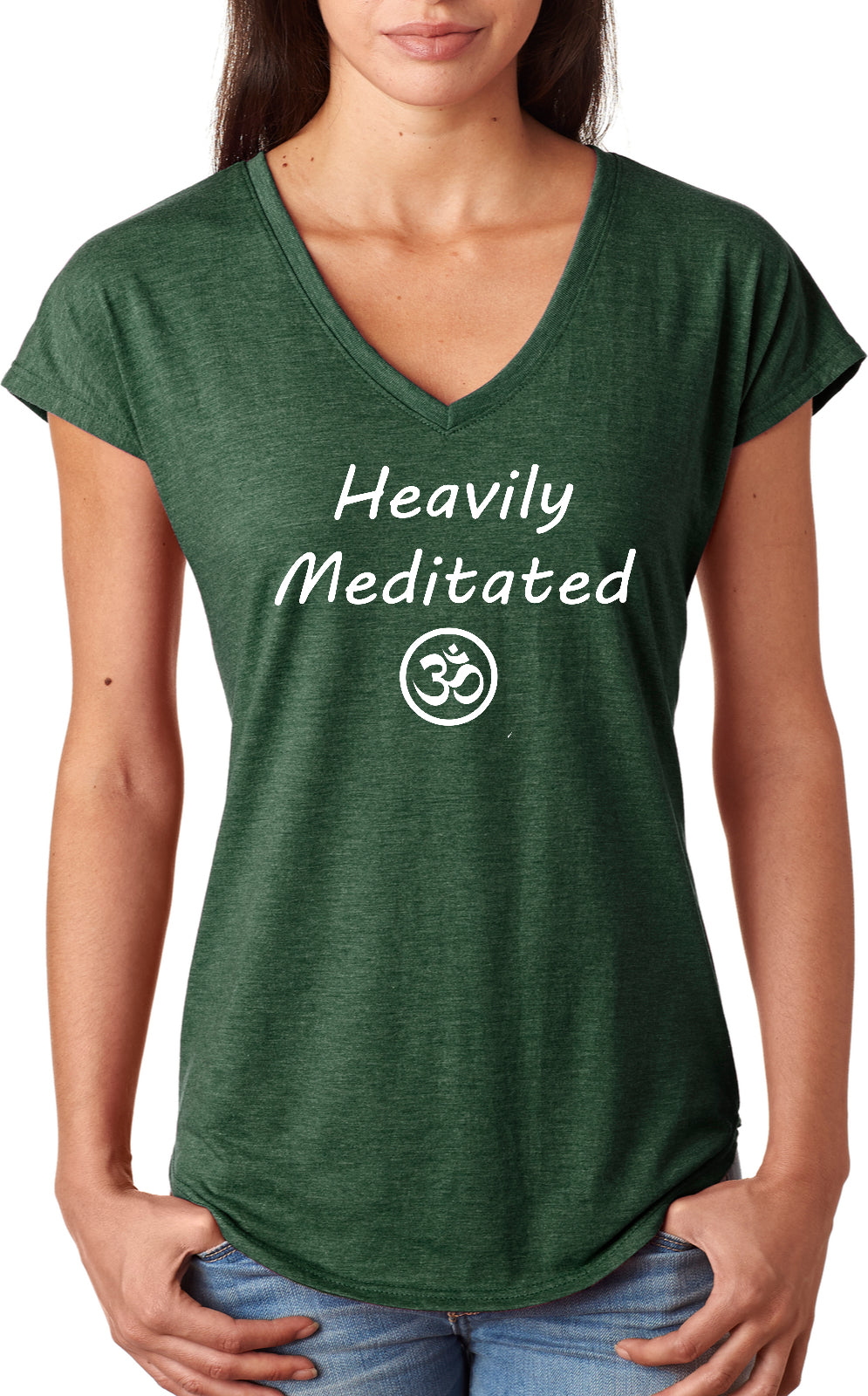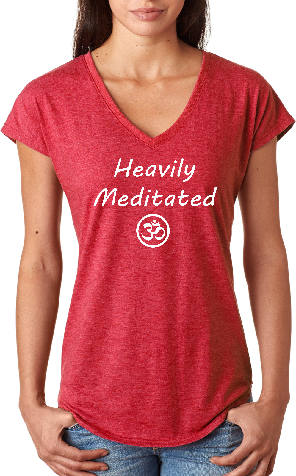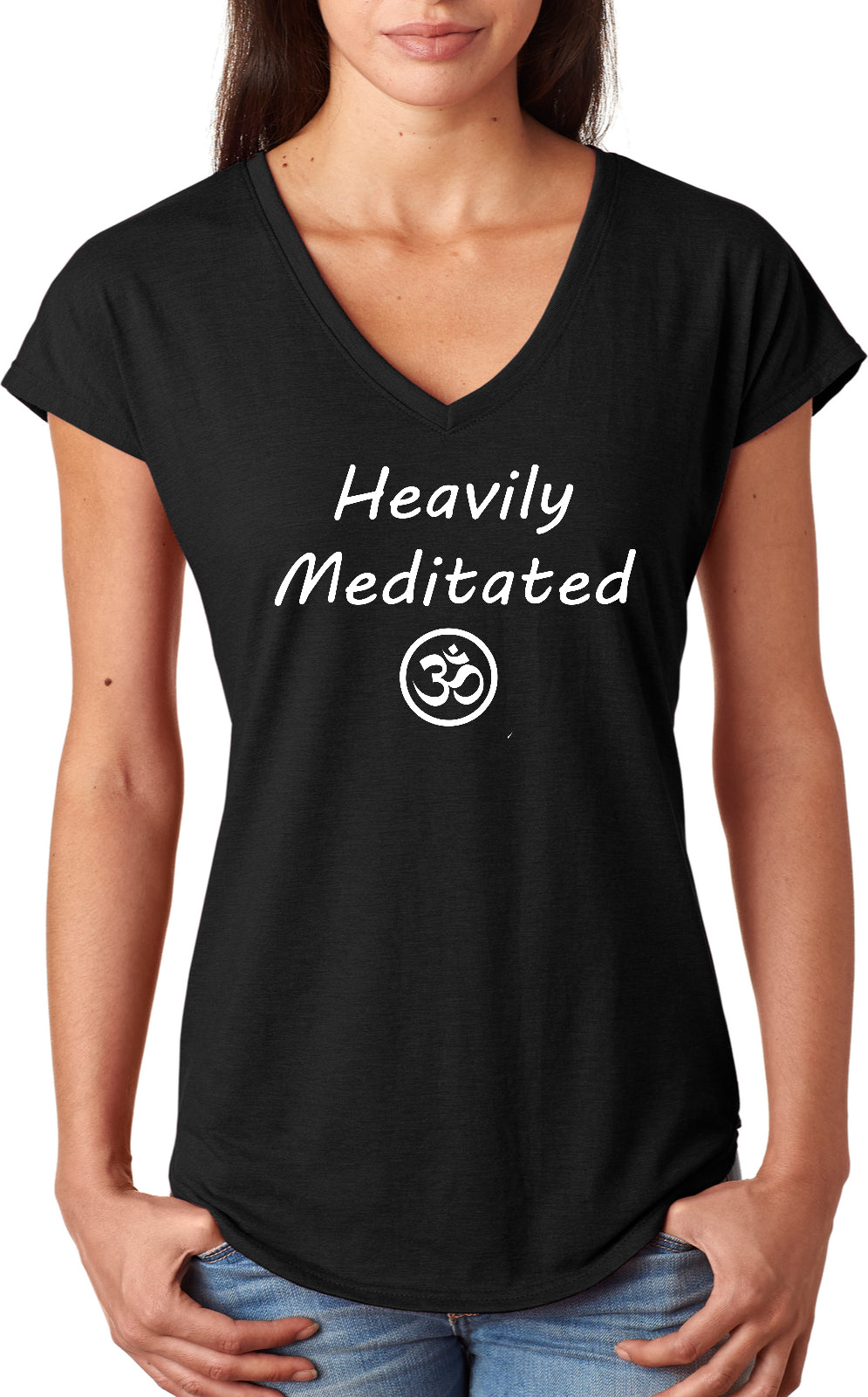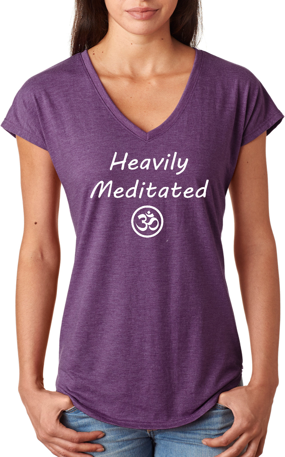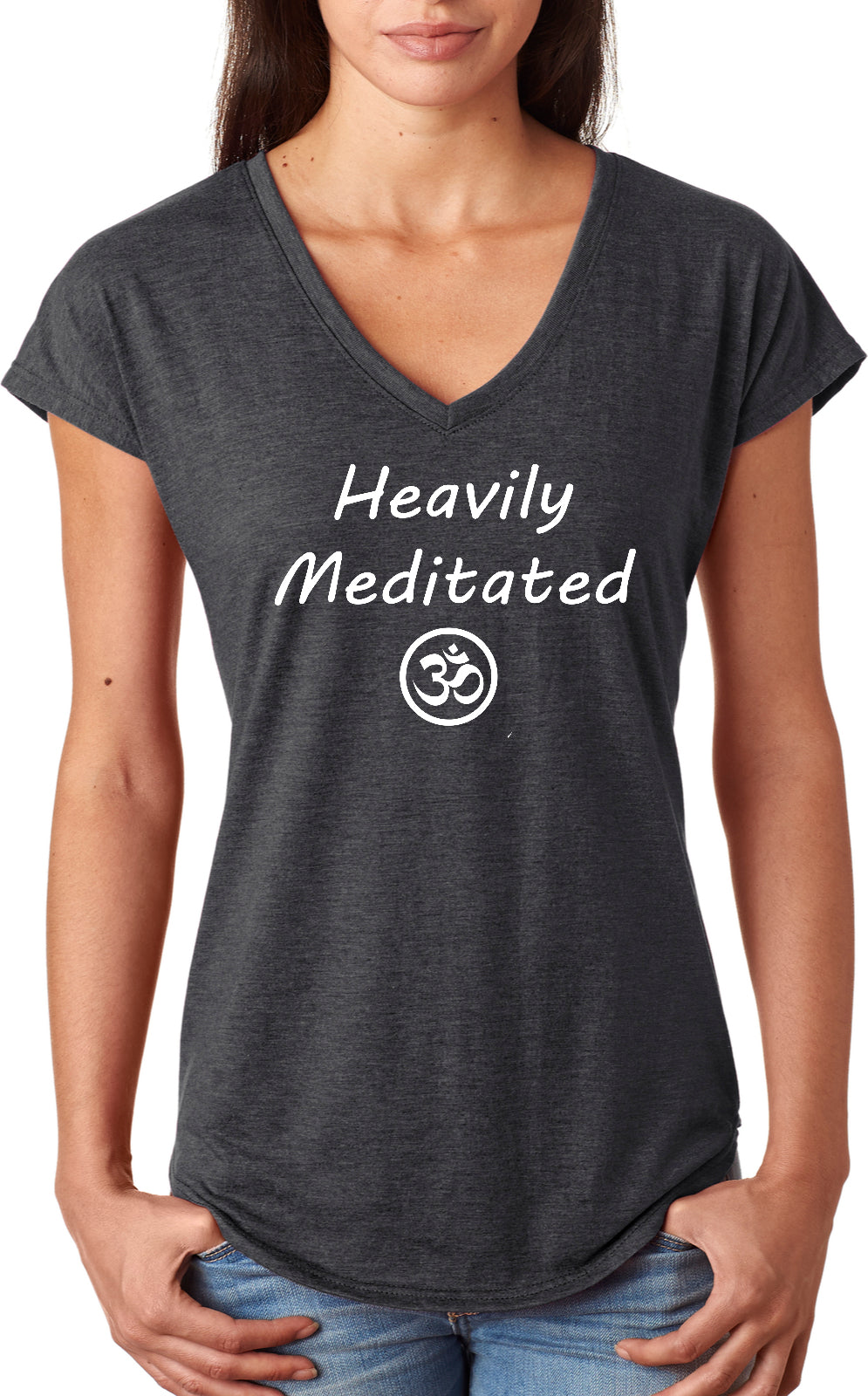 - A ladies tri blend v-neck t-shirt featuring the saying Heavily Meditated with the sacred aum symbol underneath