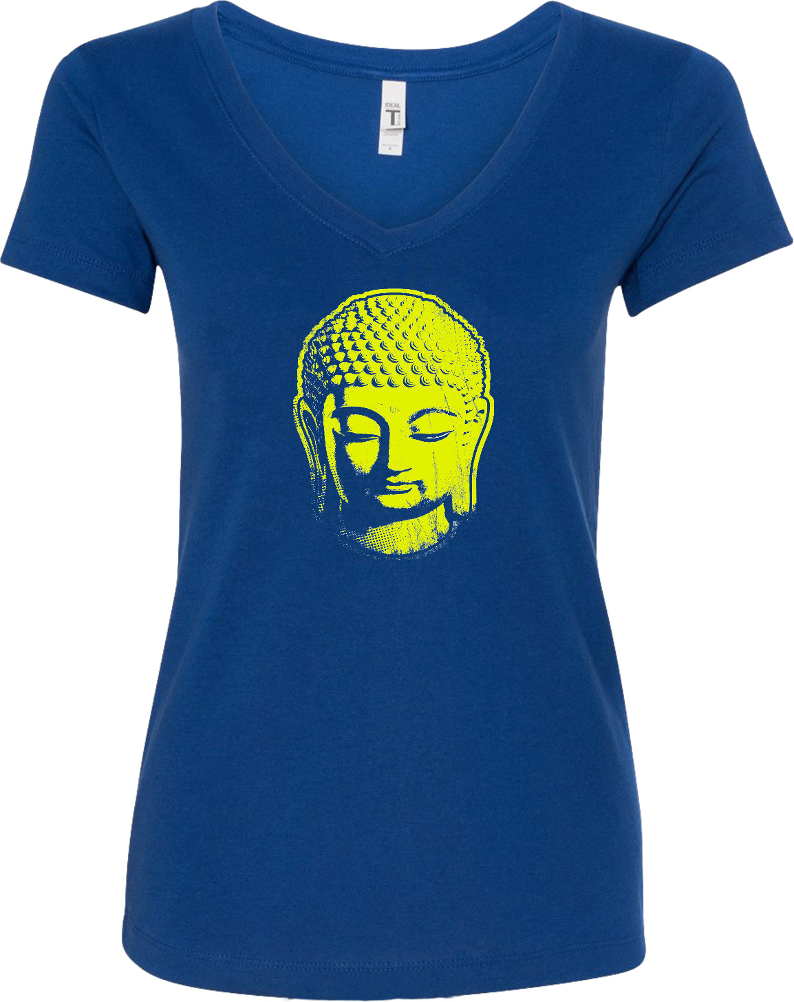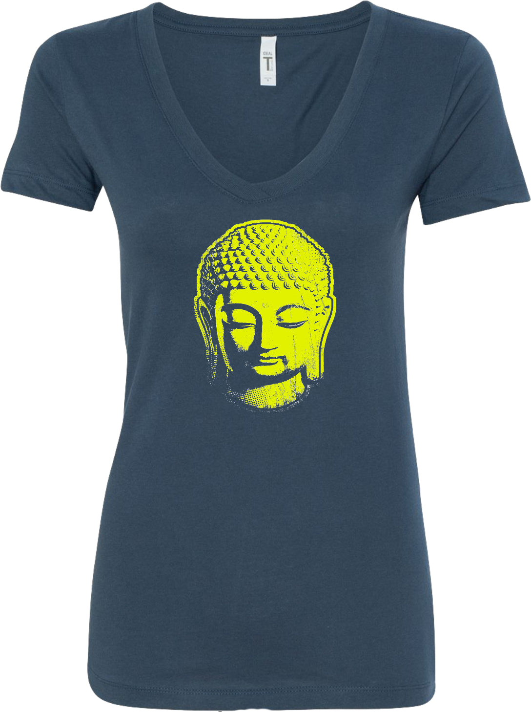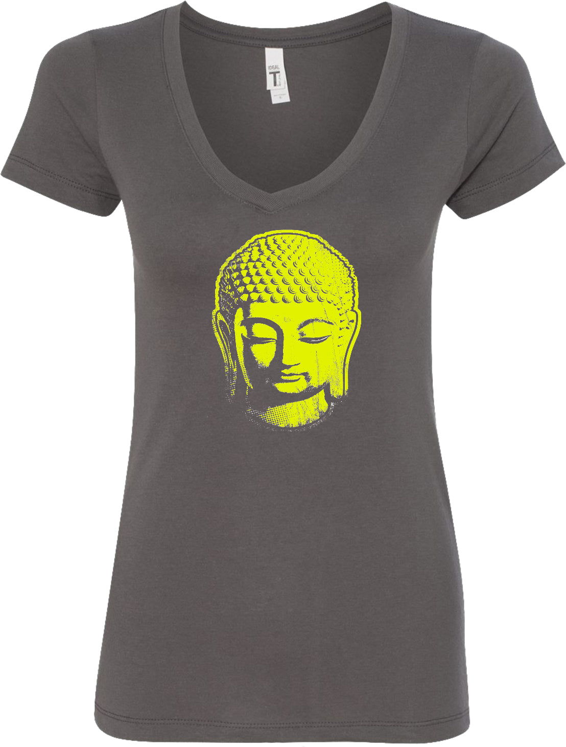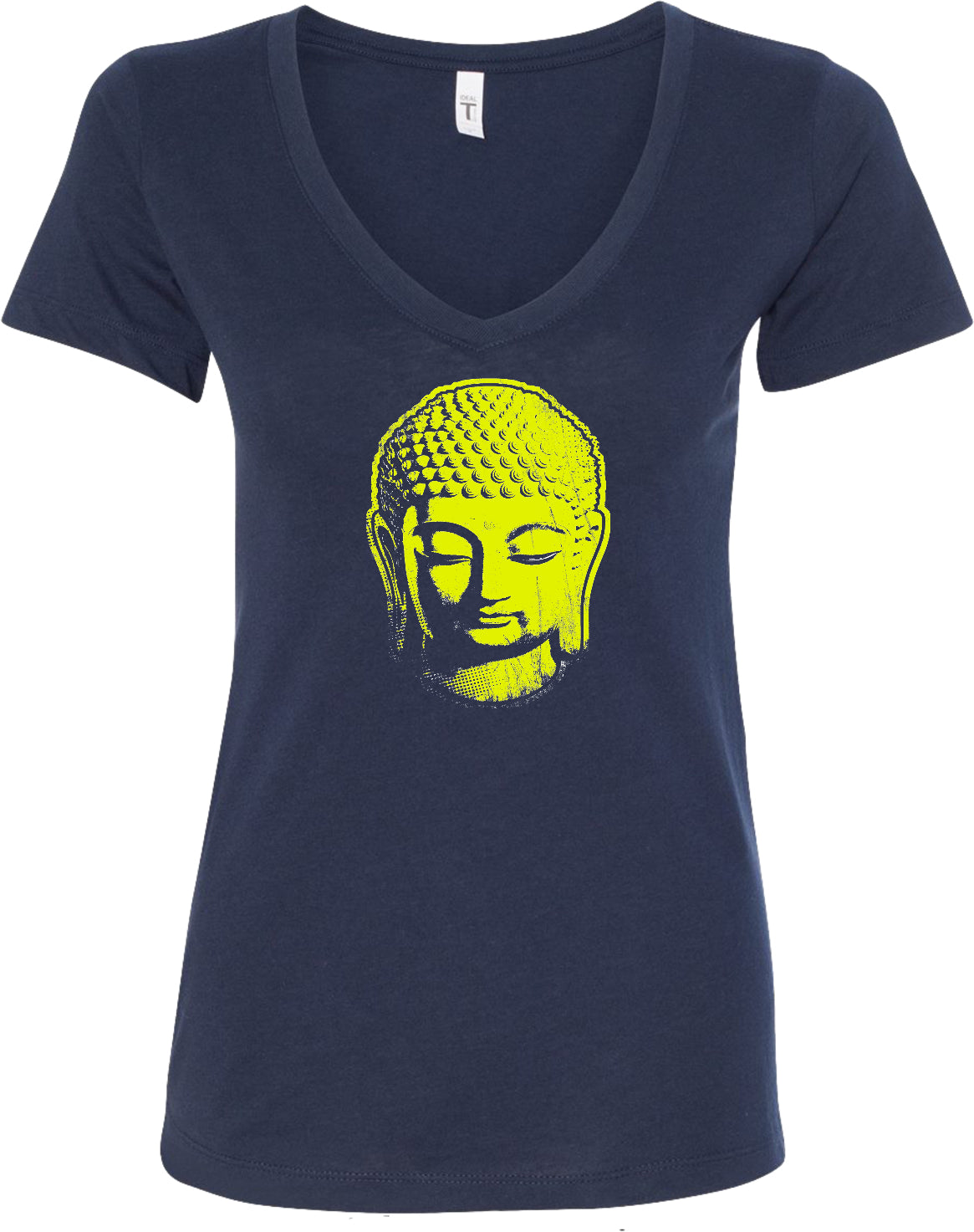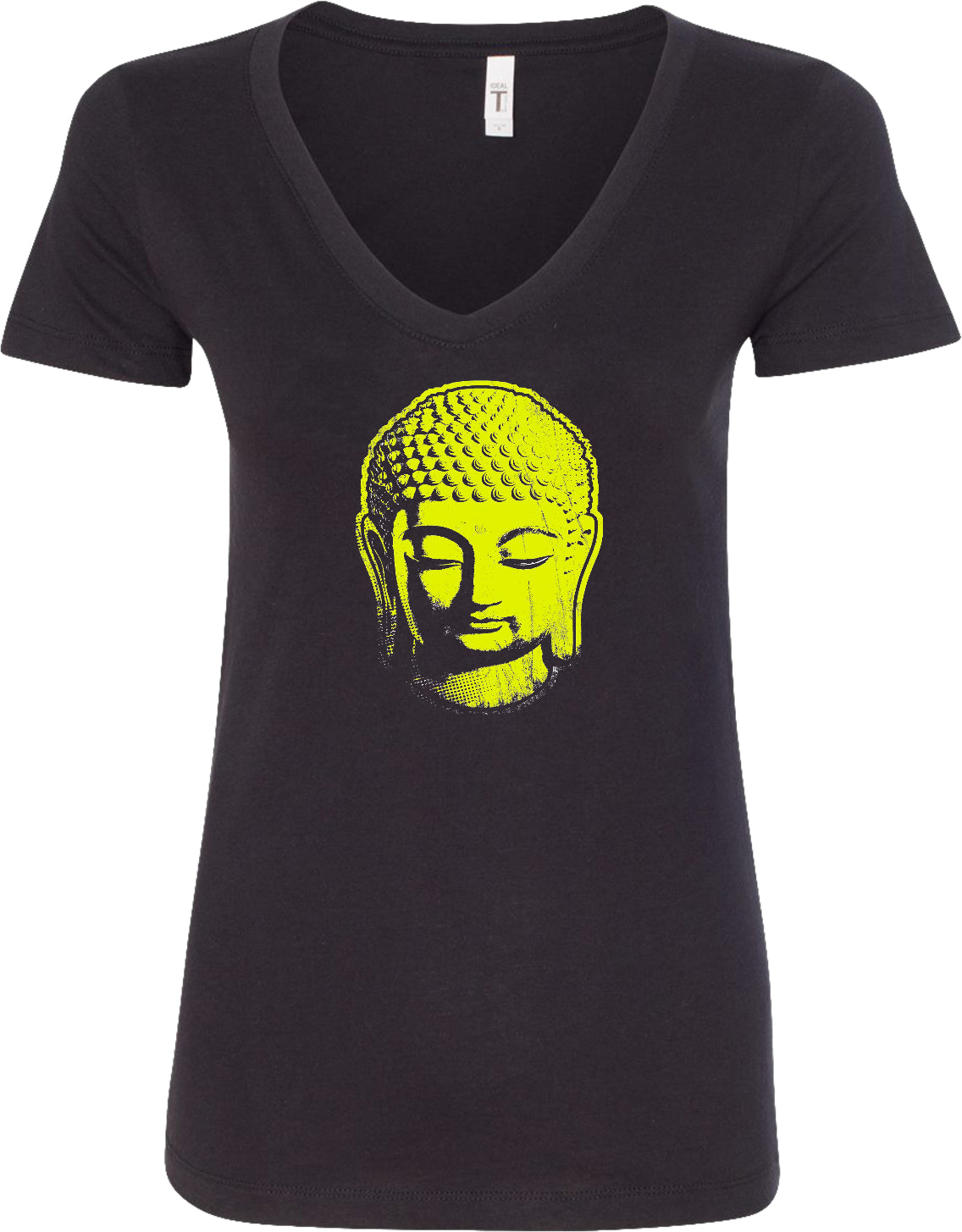 - A ladies blended v-neck t-shirt featuring a neon yellow Buddha Head