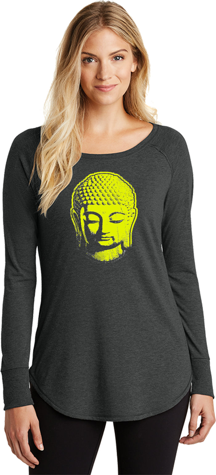 - A ladies long sleeve tunic t-shirt featuring a neon yellow Buddha Head
