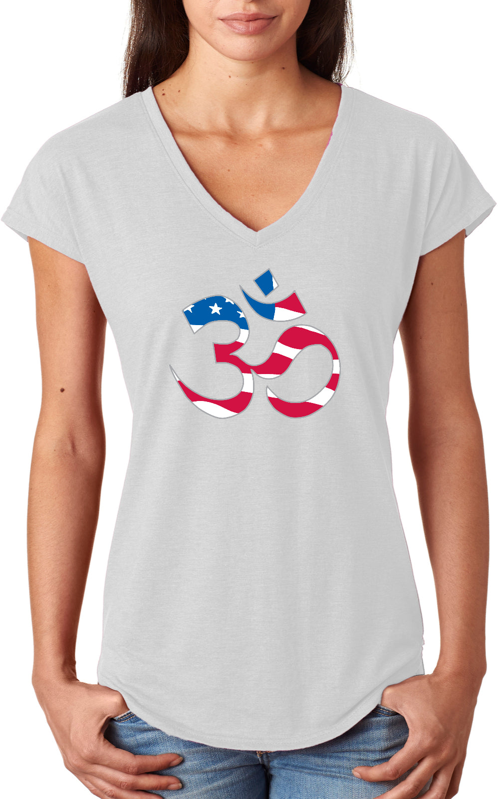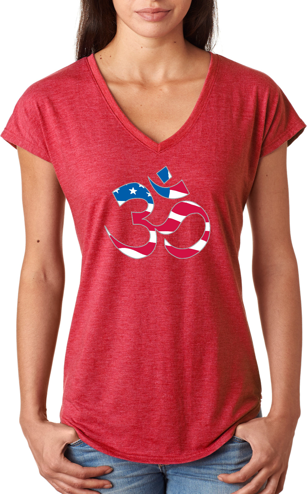 • A ladies tri blend v-neck t-shirt featuring a patriotic aum symbol