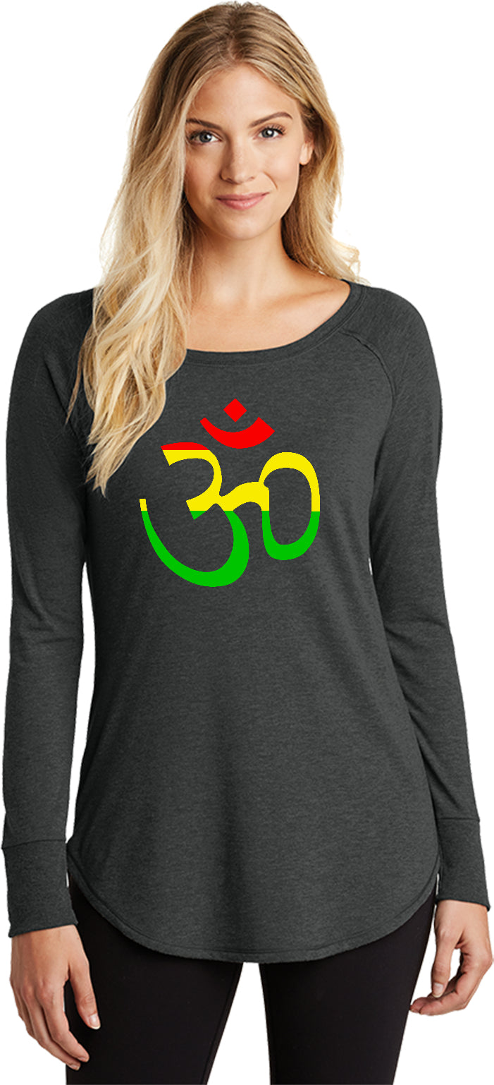 - A ladies tri blend long sleeve shirt featuring a rasta colored aum symbol