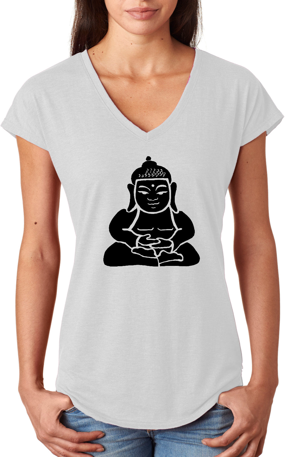 • A ladies tri blend v-neck t-shirt featuring Buddha