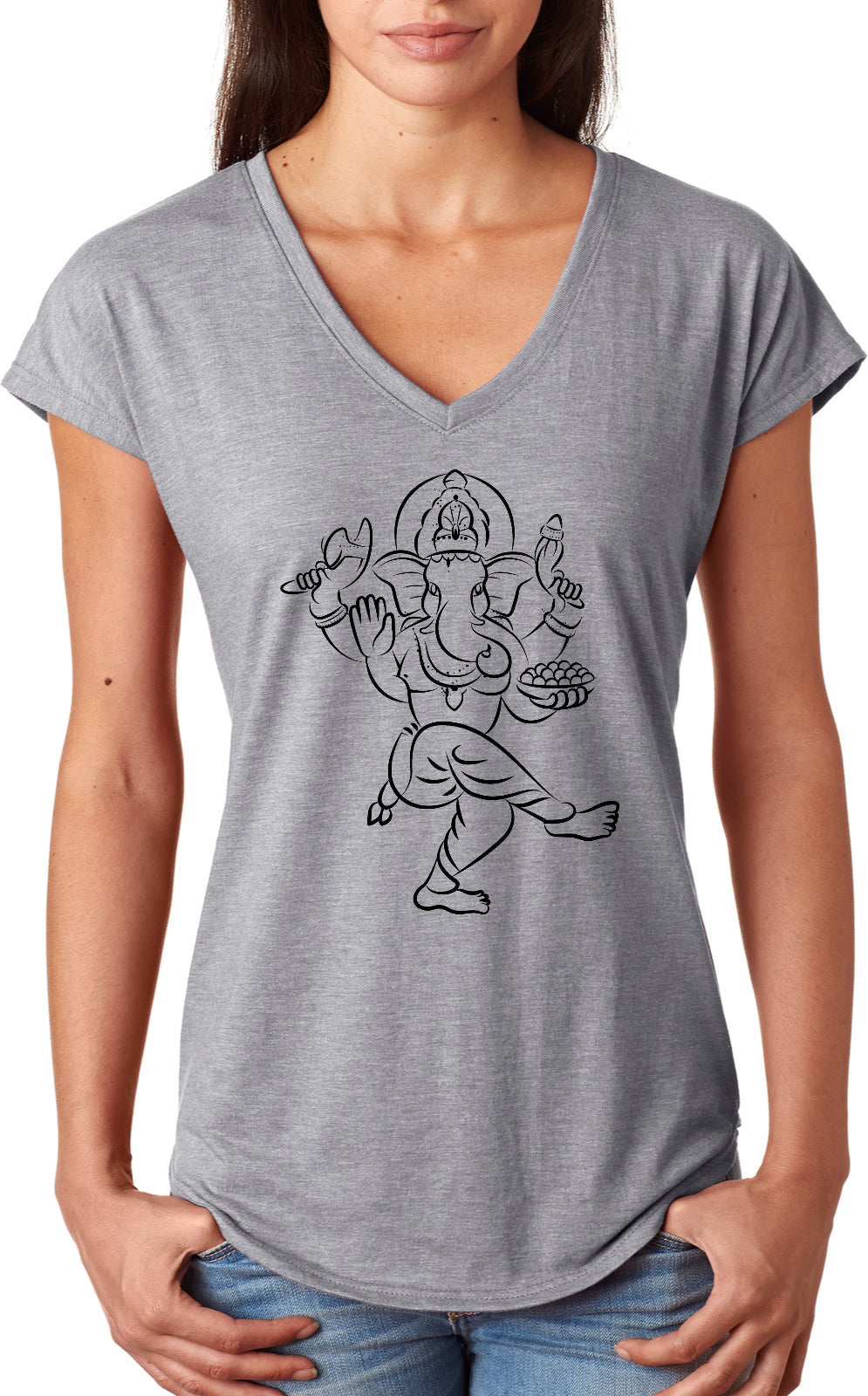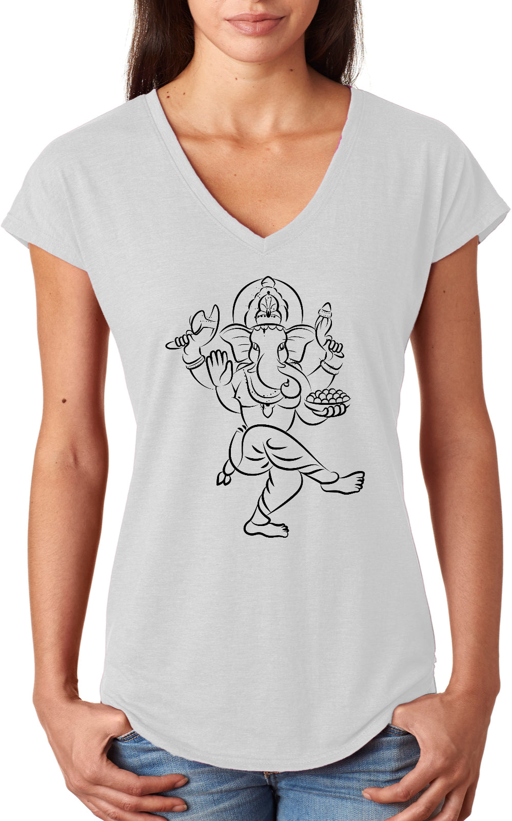 - A ladies tri blend v-neck t-shirt featuring a cool sketched version of Ganesha