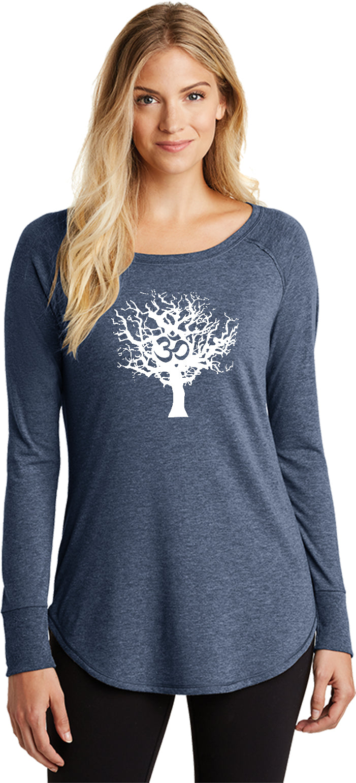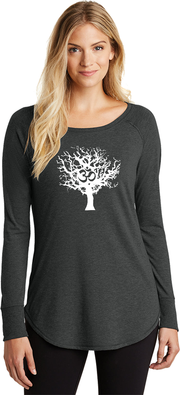 - A ladies long sleeve tunic t-shirt featuring the Tree of Life with the sacred om symbol in the middle