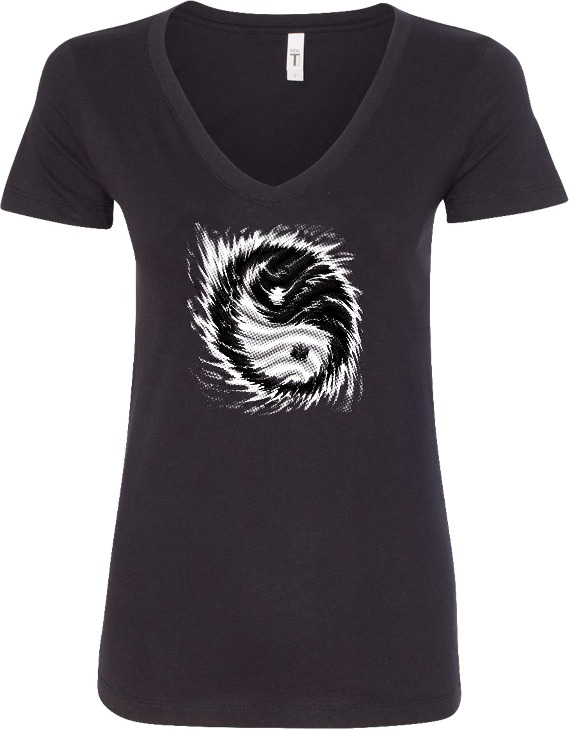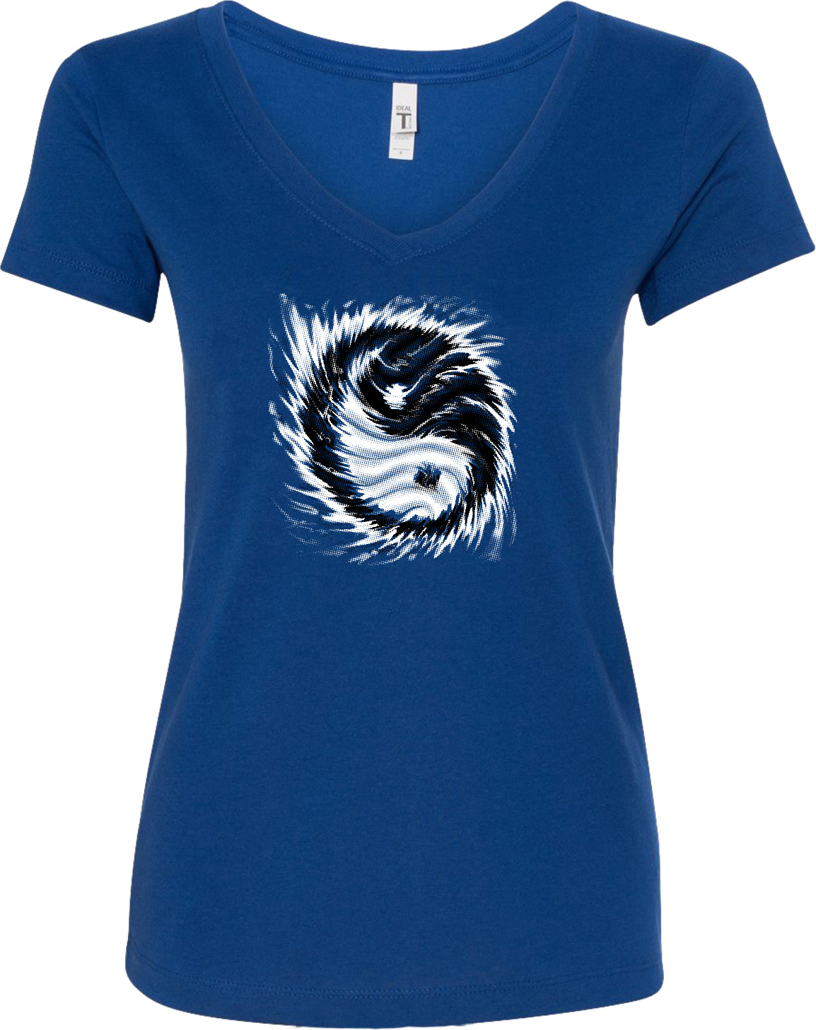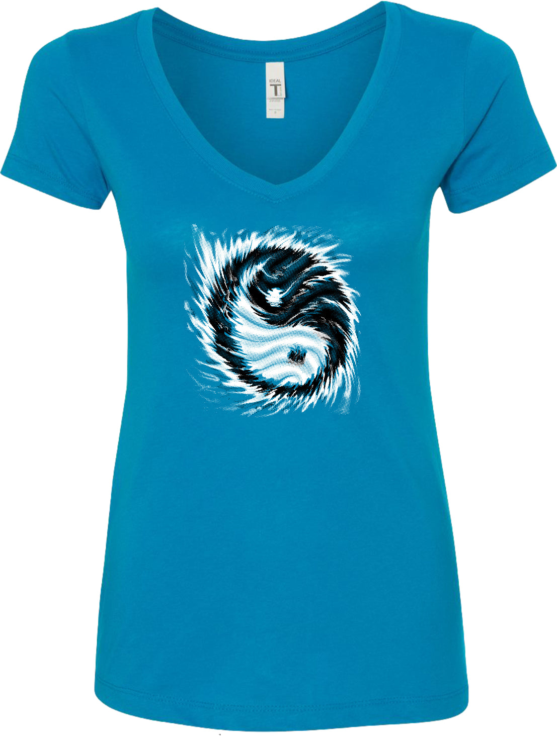 - A ladies blended v-neck t-shirt featuring the yin yang sun