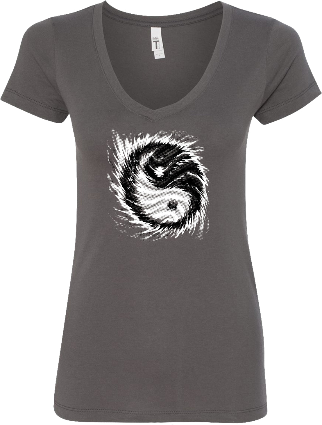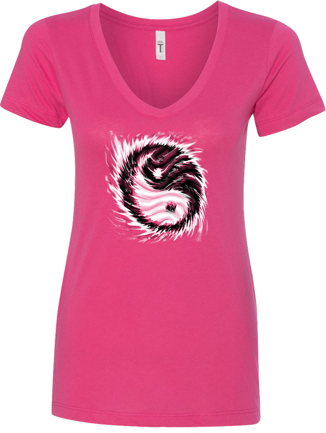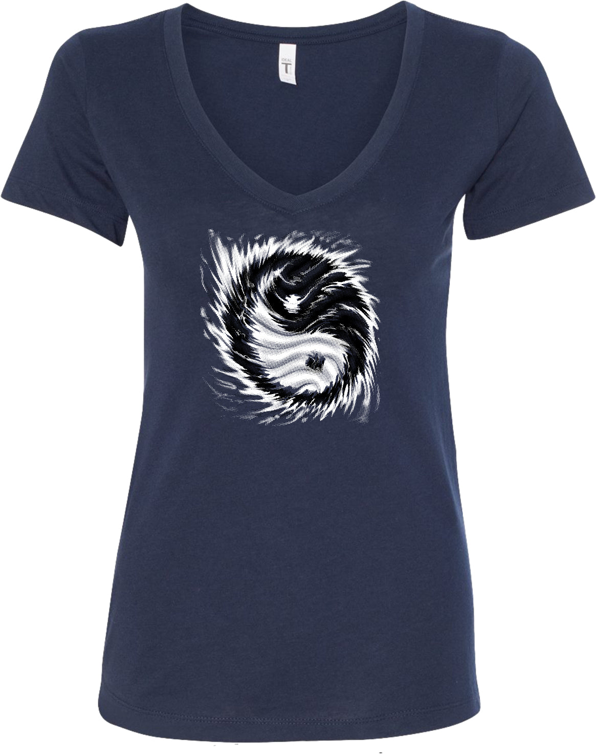 - A ladies blended v-neck t-shirt featuring the yin yang sun