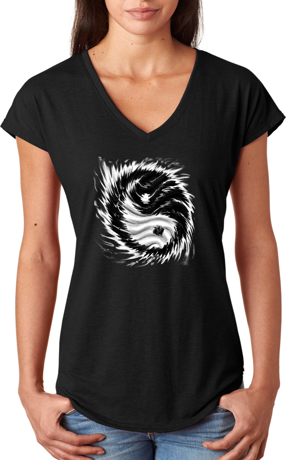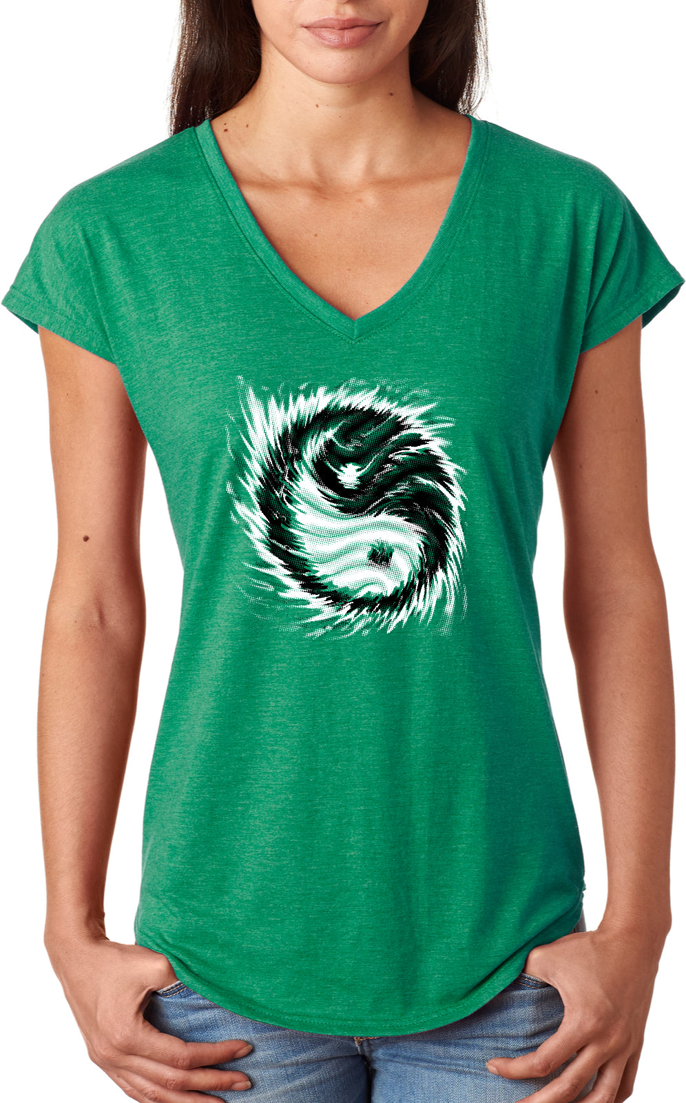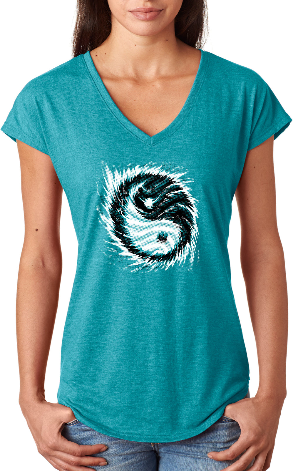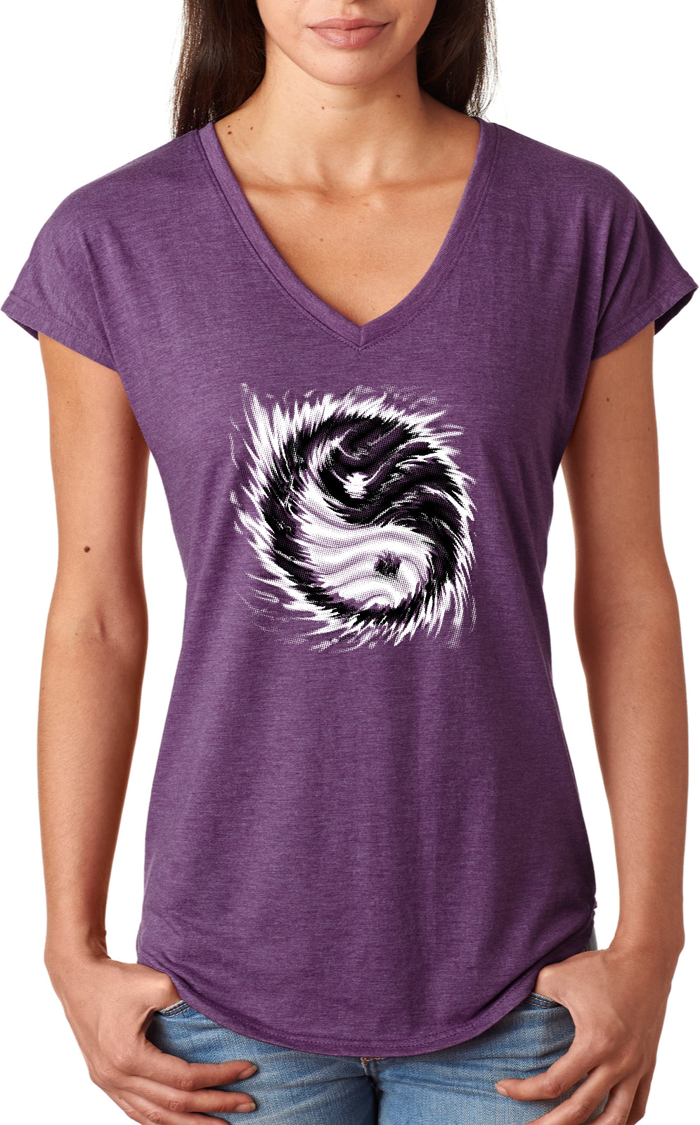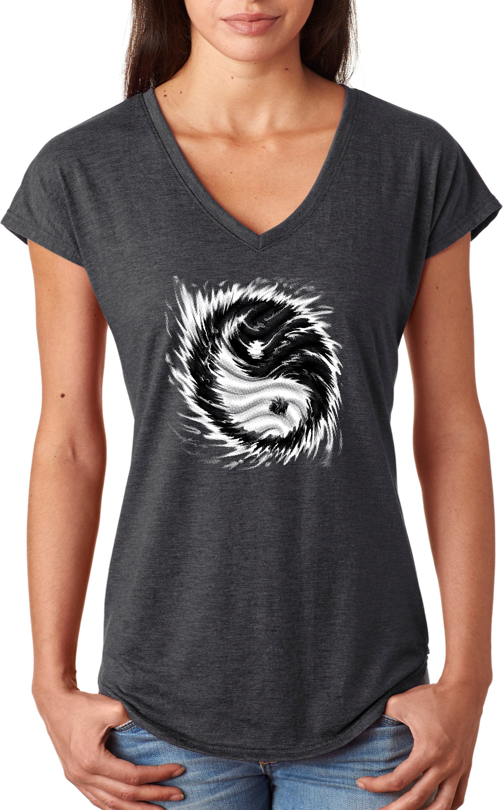 - A ladies tri blend v-neck t-shirt featuring the yin yang sun