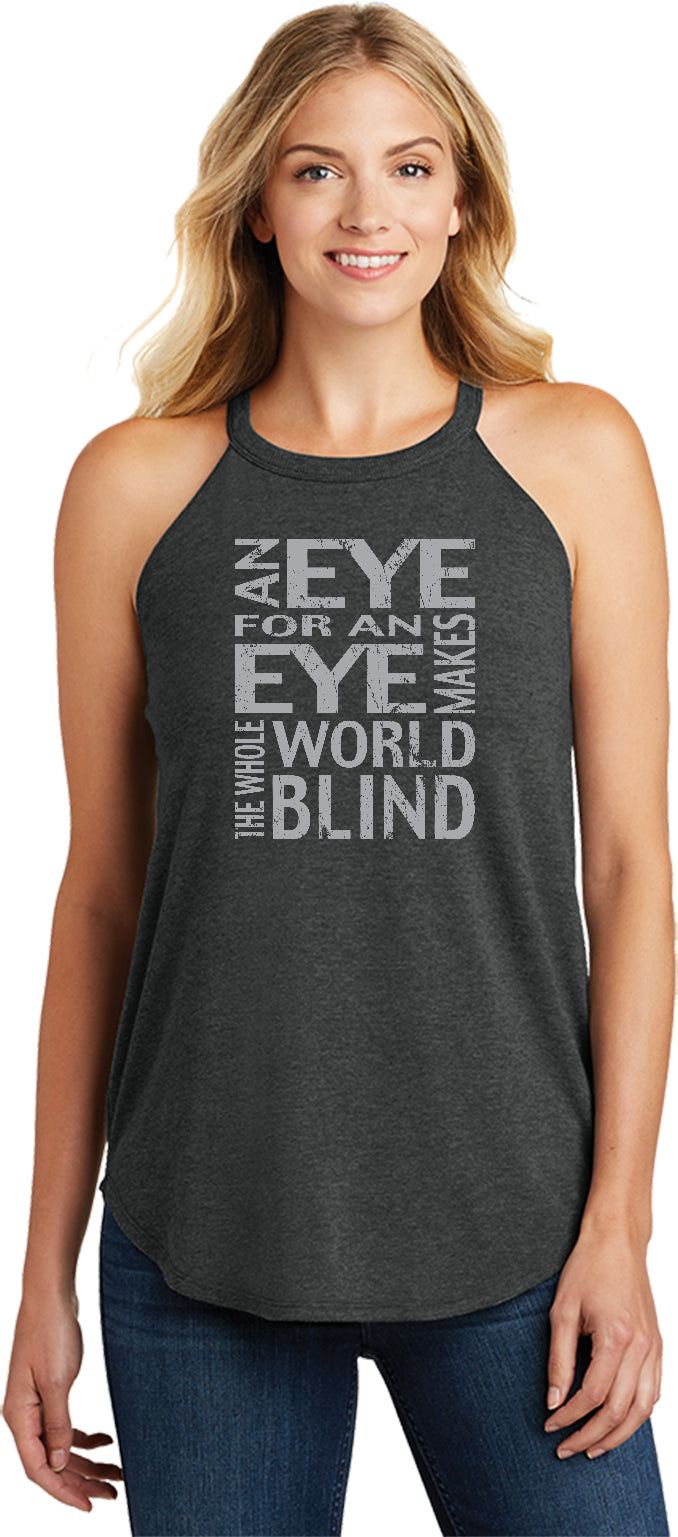 - A ladies tri blend rocker tank top featuring Gandhi's quote: An eye for an eye makes the whole world blind