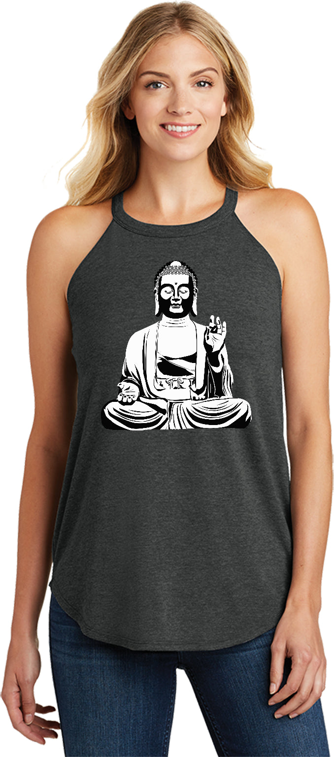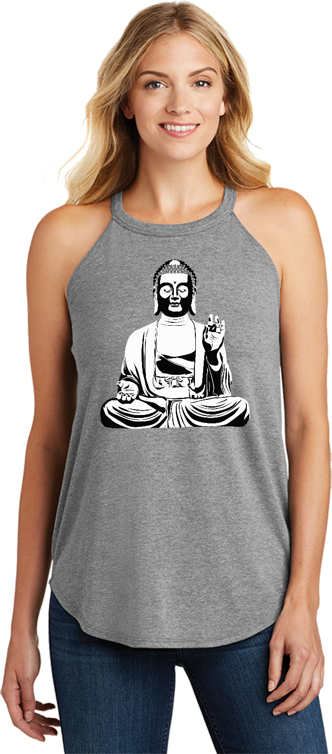 - A ladies tri blend rocker tank top featuring Buddha meditating