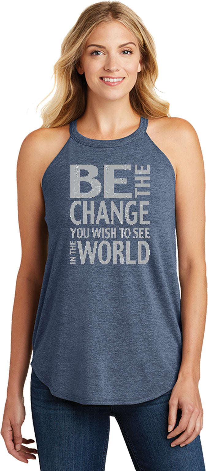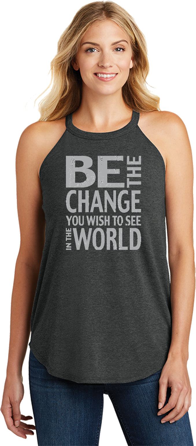- A ladies tri blend rocker tank top featuring the inspirational saying by Gandhi: Be The Change You Wish to see in the World