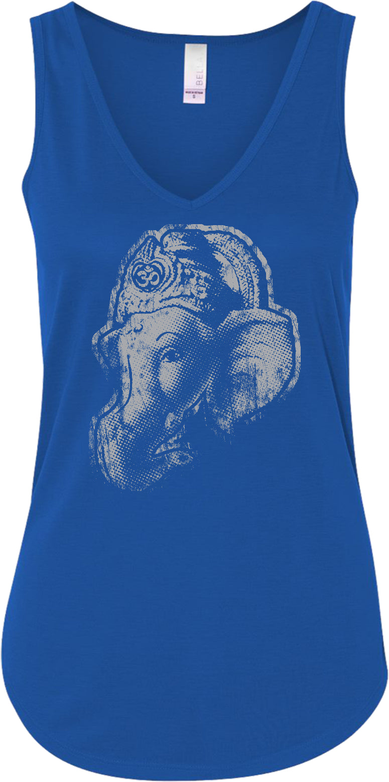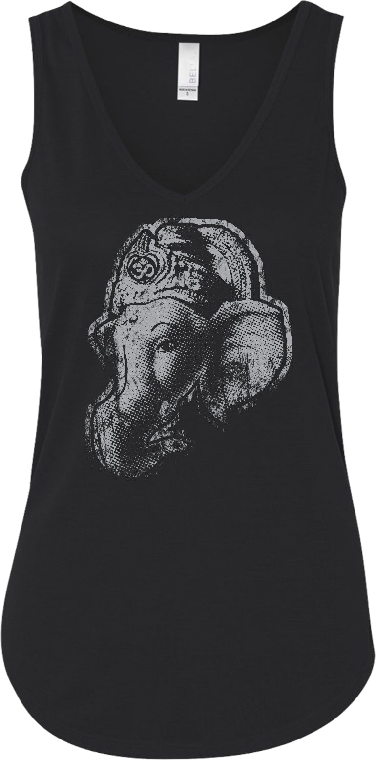 - A ladies v-neck tank top featuring a side profile of the wise Ganesha