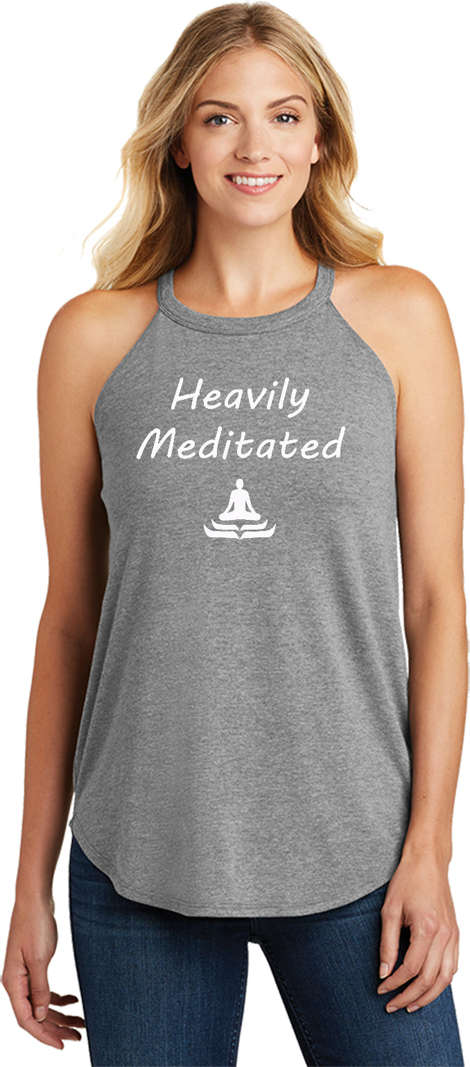 - A ladies tri blend rocker tank top featuring the saying Heavily Meditated