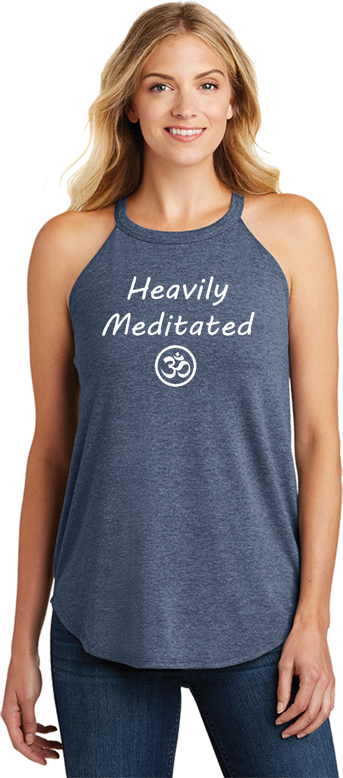 - A ladies tri blend rocker tank top featuring the saying Heavily Meditated with the sacred aum symbol underneath