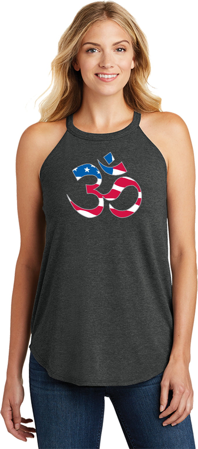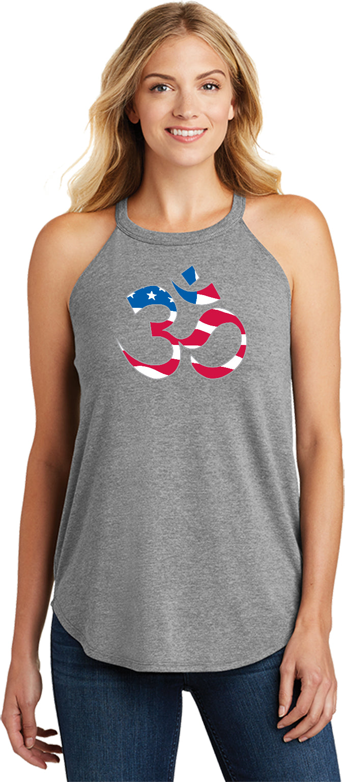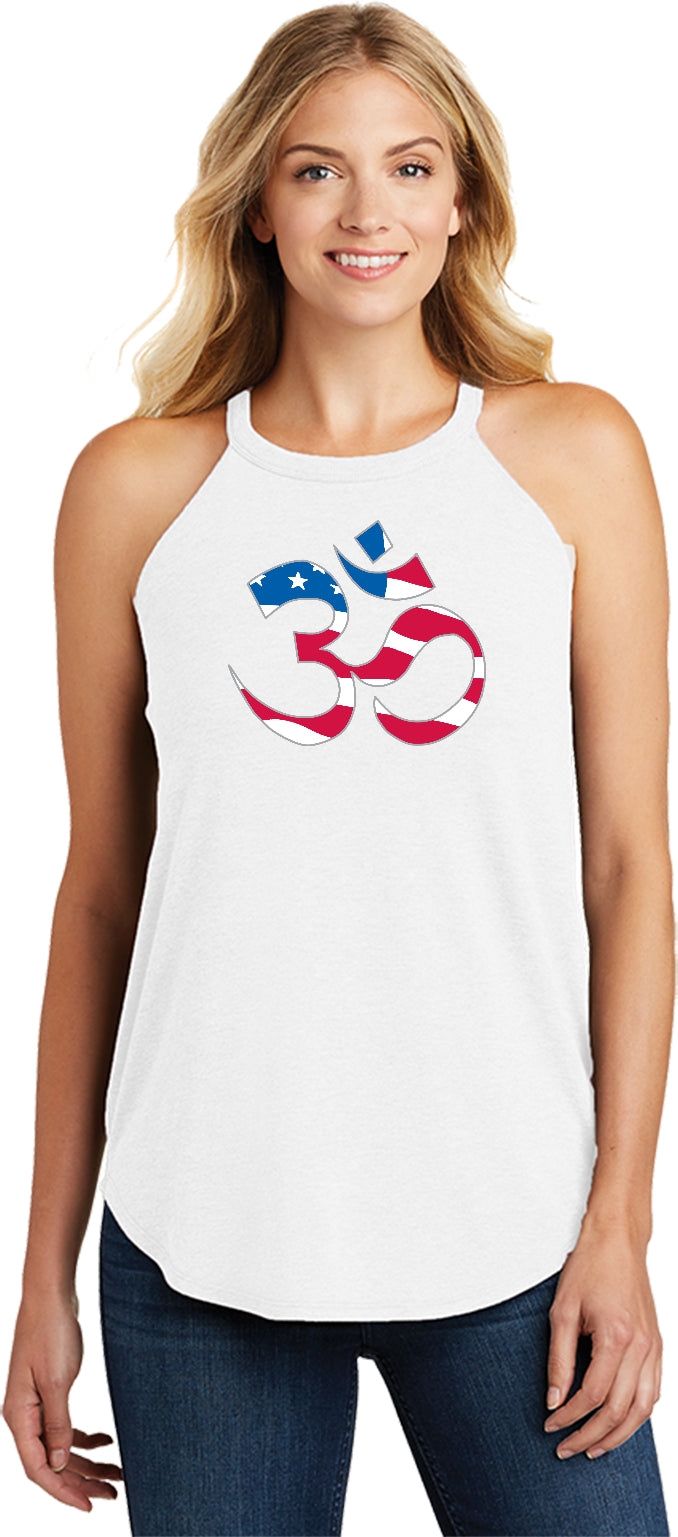 - A ladies tri blend rocker tank top featuring a patriotic aum symbol