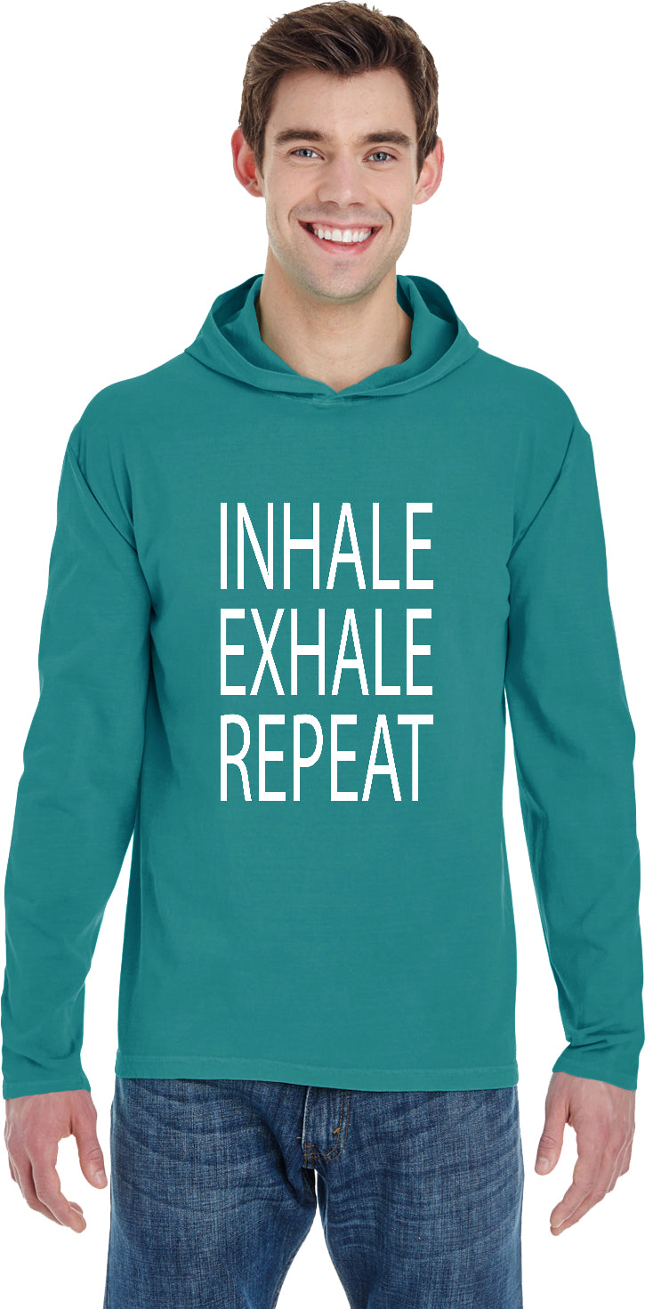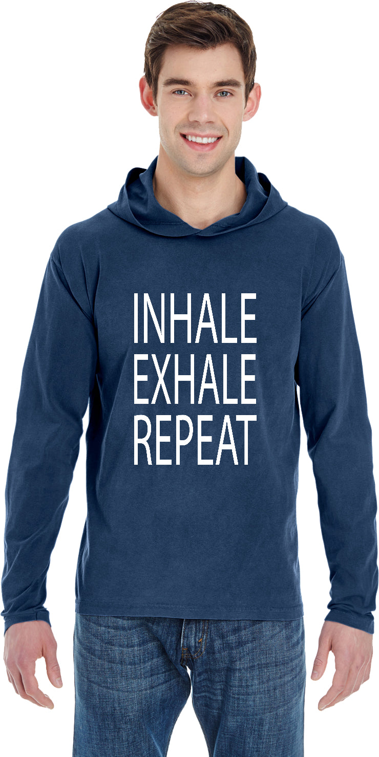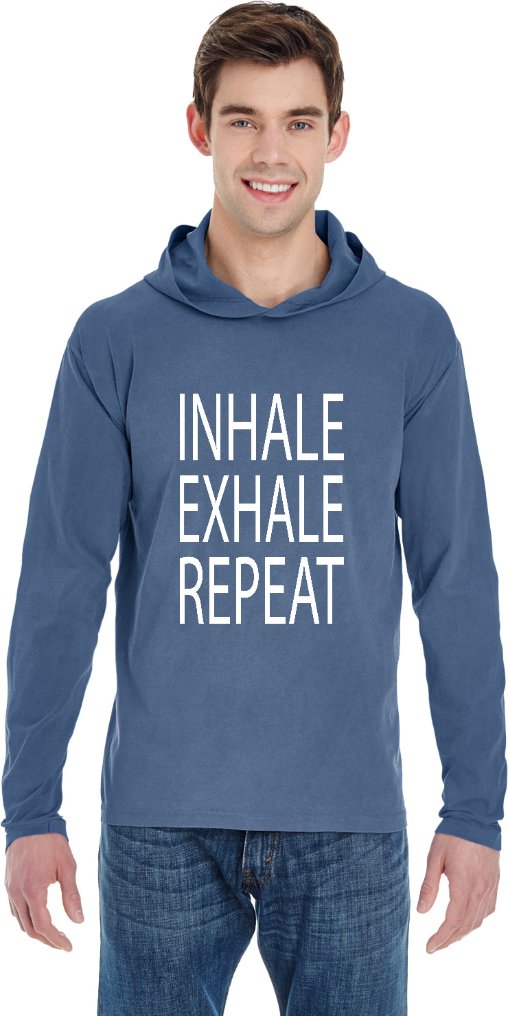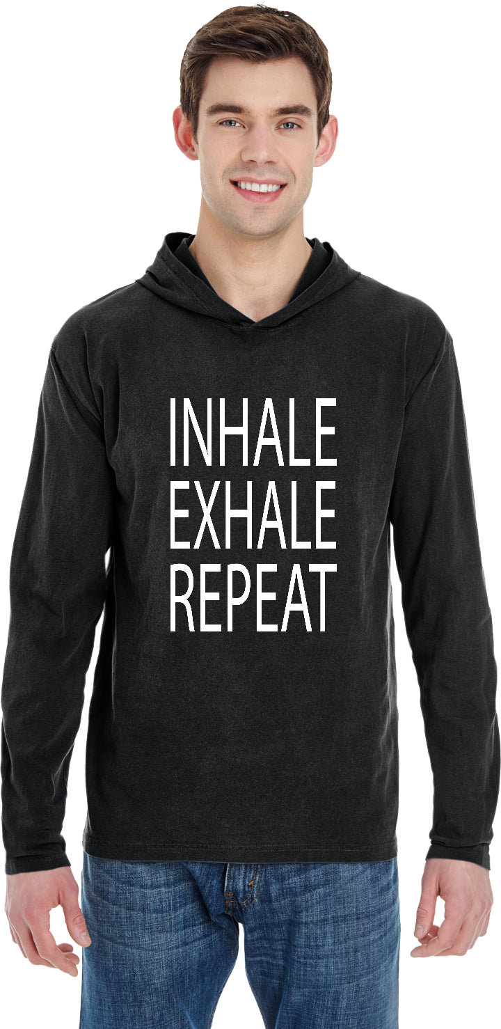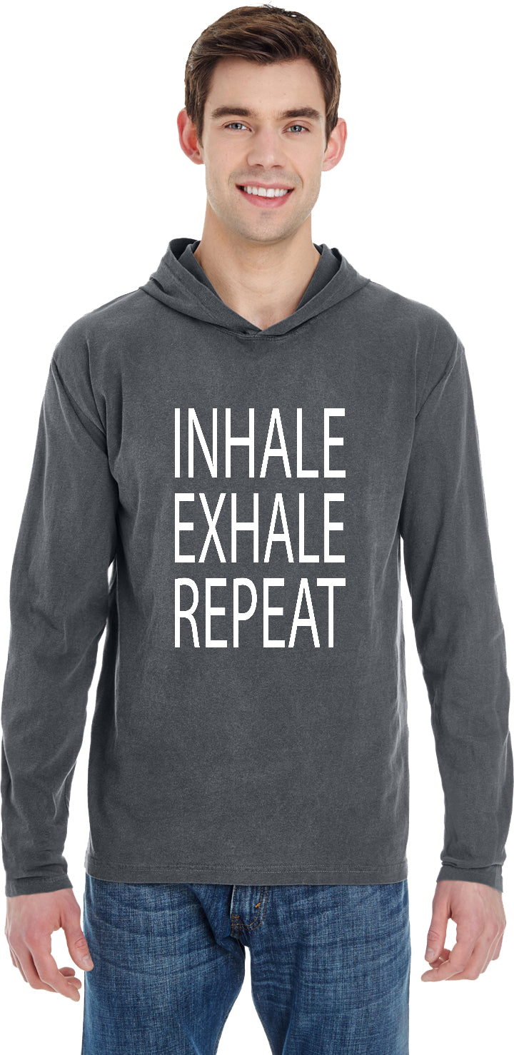 - A men's pigment dyed hoodie featuring inhale exhale repeat