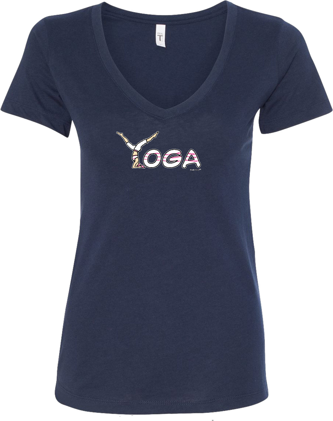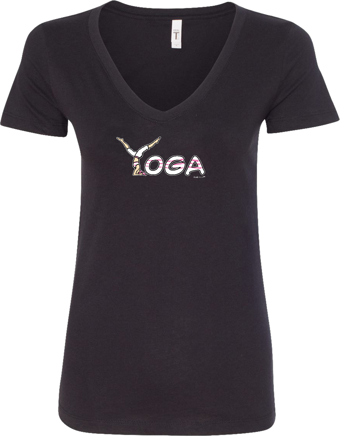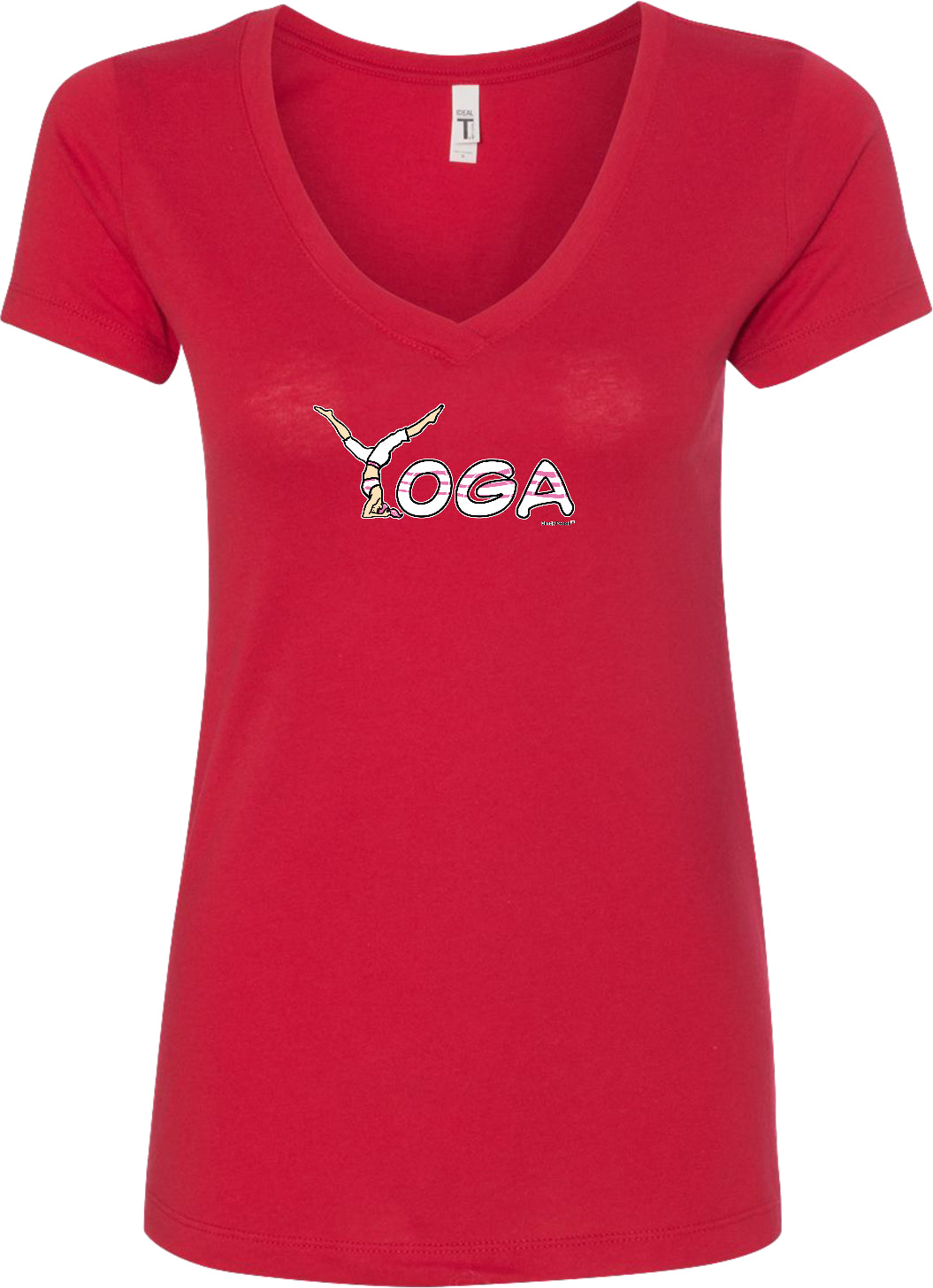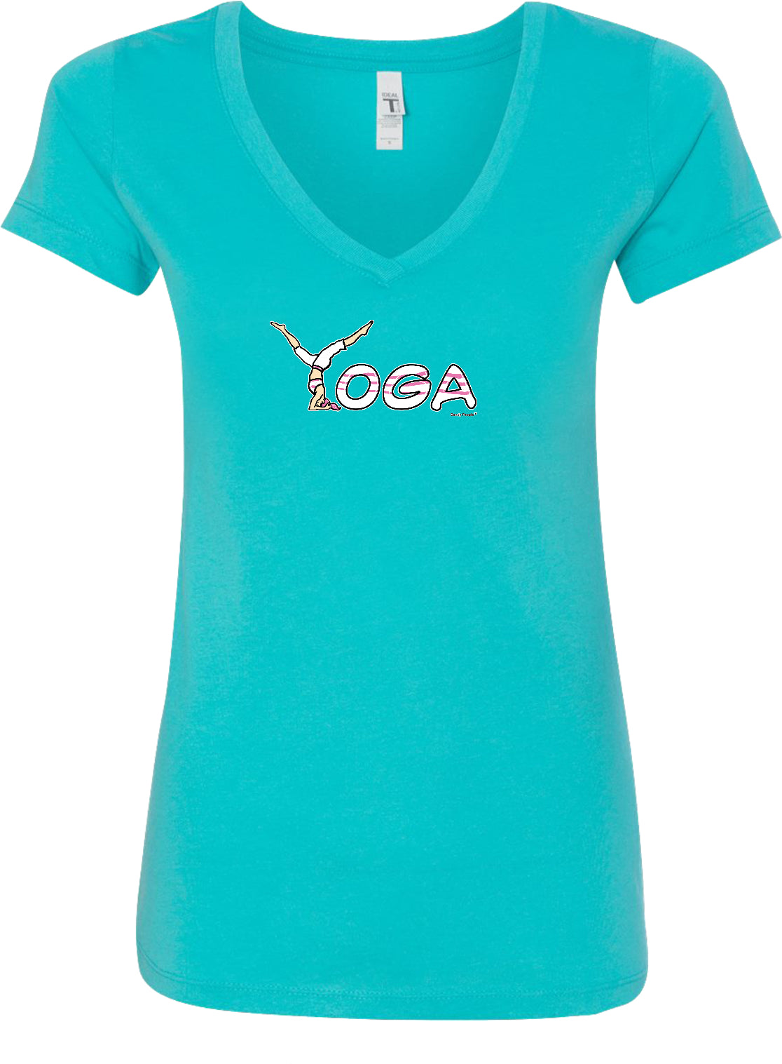 - A ladies ideal v-neck t-shirt featuring yoga spelling