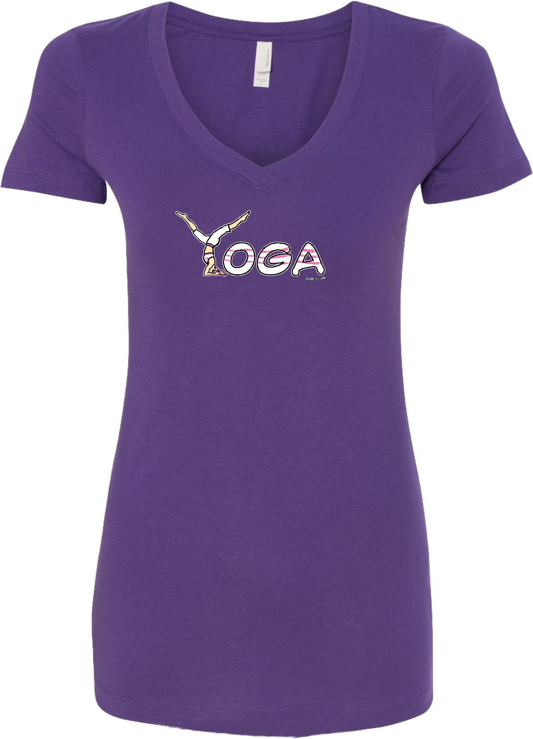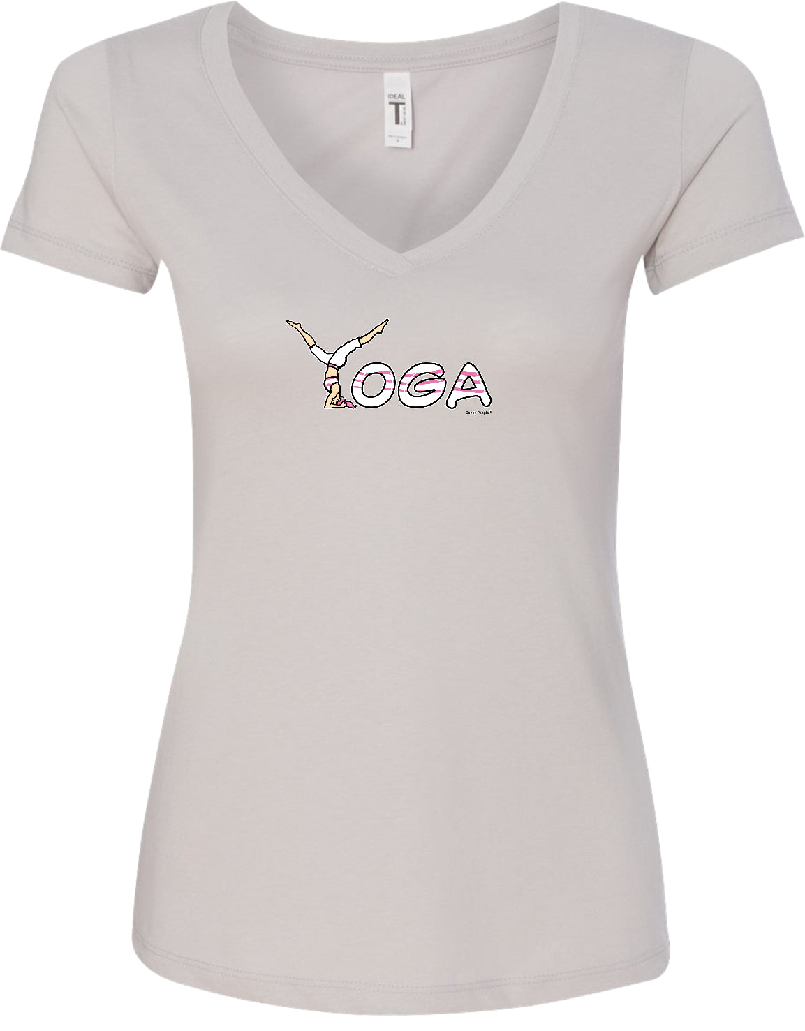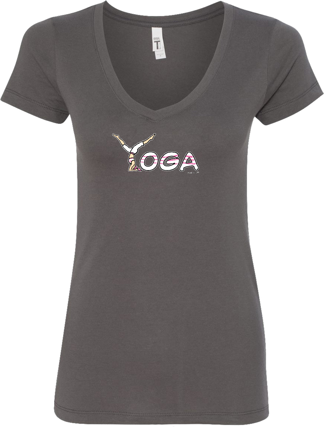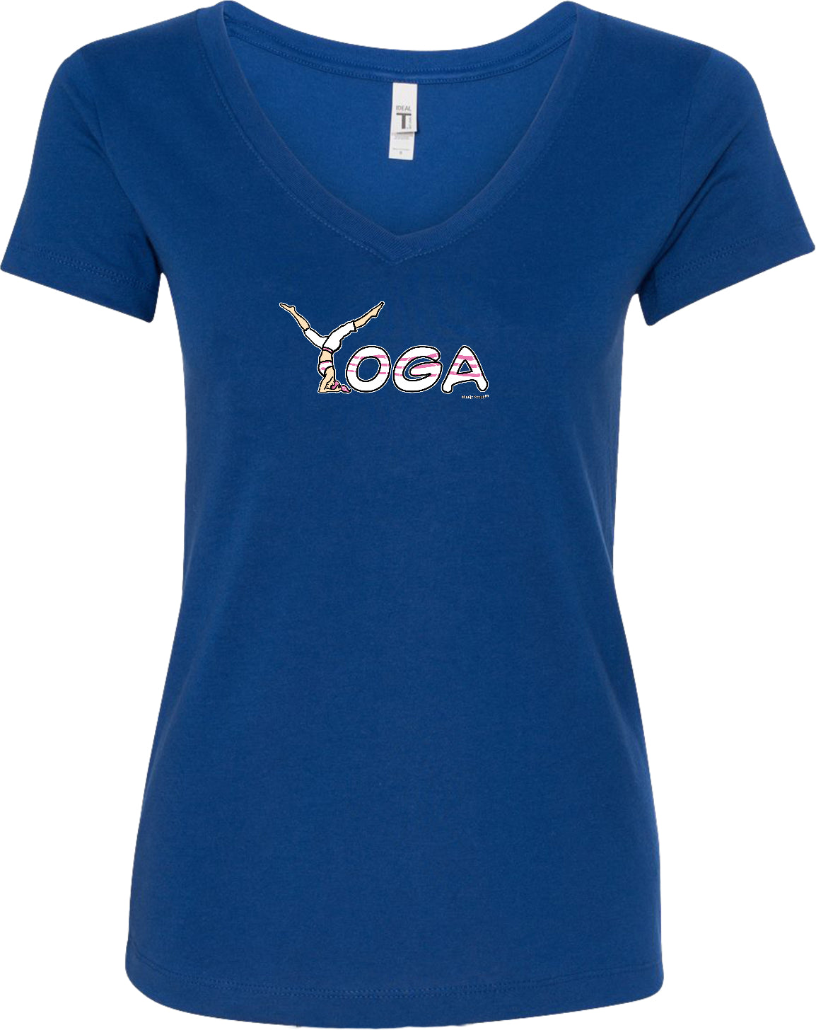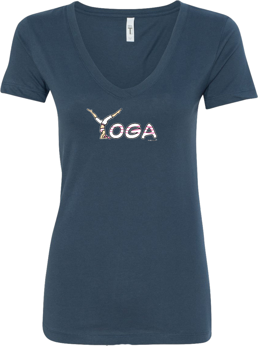 - A ladies ideal v-neck t-shirt featuring yoga spelling
