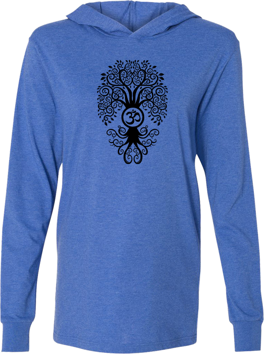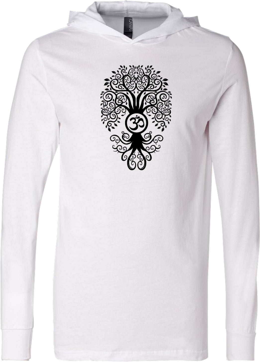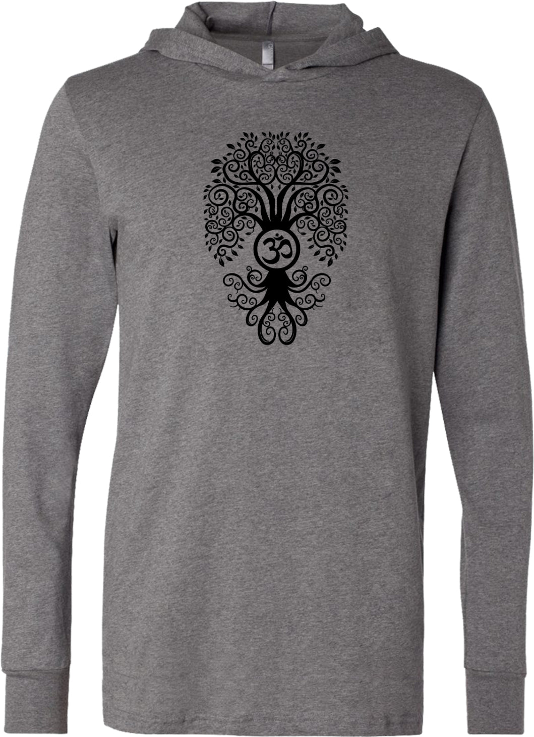 - A men's lightweight hoodie featuring a black bodhi tree with the sacred aum symbol in the center