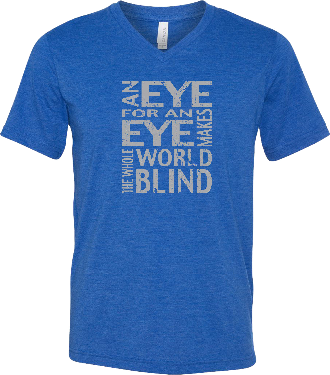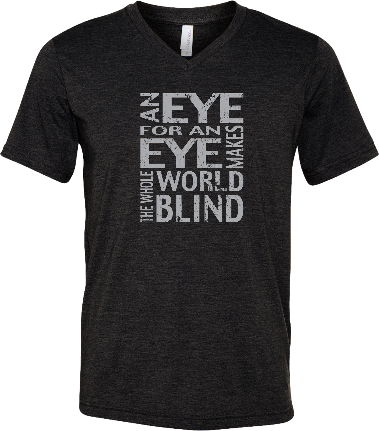 - A men's tri blend v-neck t-shirt featuring Gandhi's quote: An eye for an eye makes the whole world blind