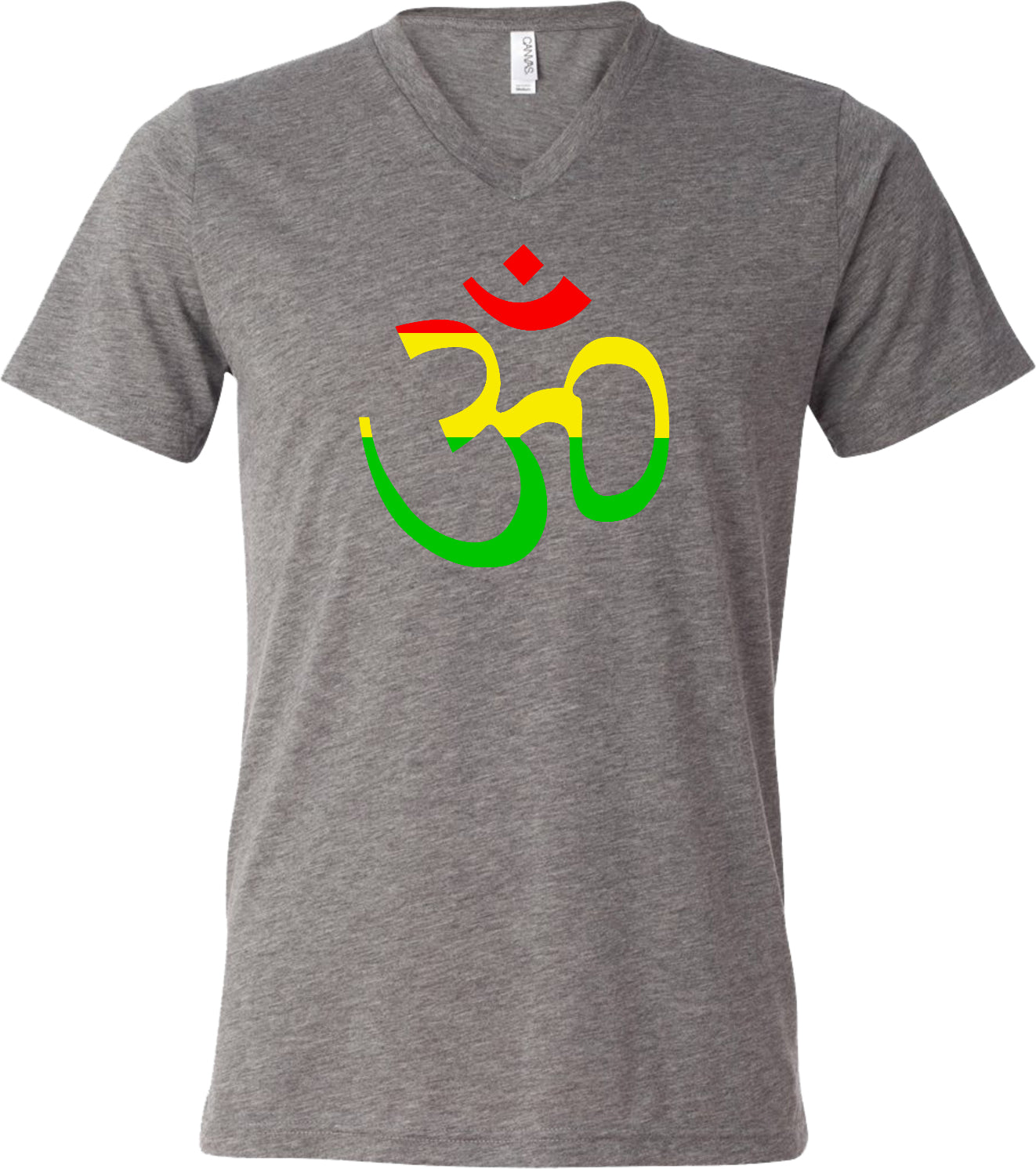 • A mens tri blend v-neck shirt featuring a rasta colored aum symbol