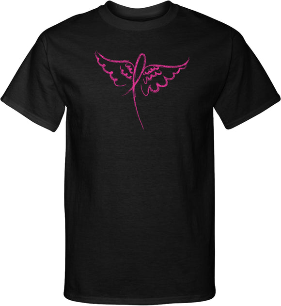 - A Breast Cancer Awareness Tall T-shirt featuring a pink ribbon surrounded by angel wings