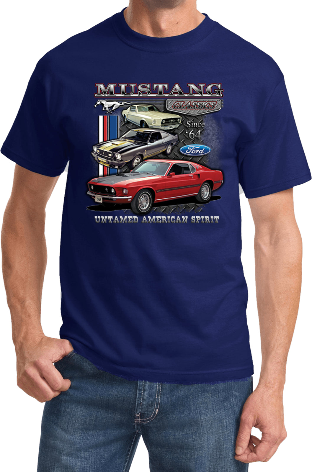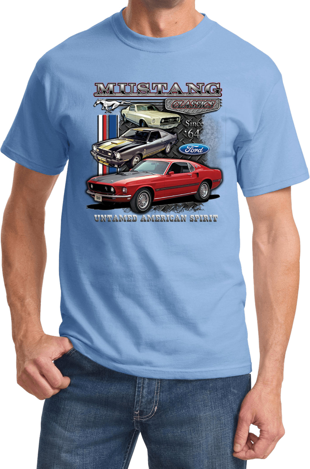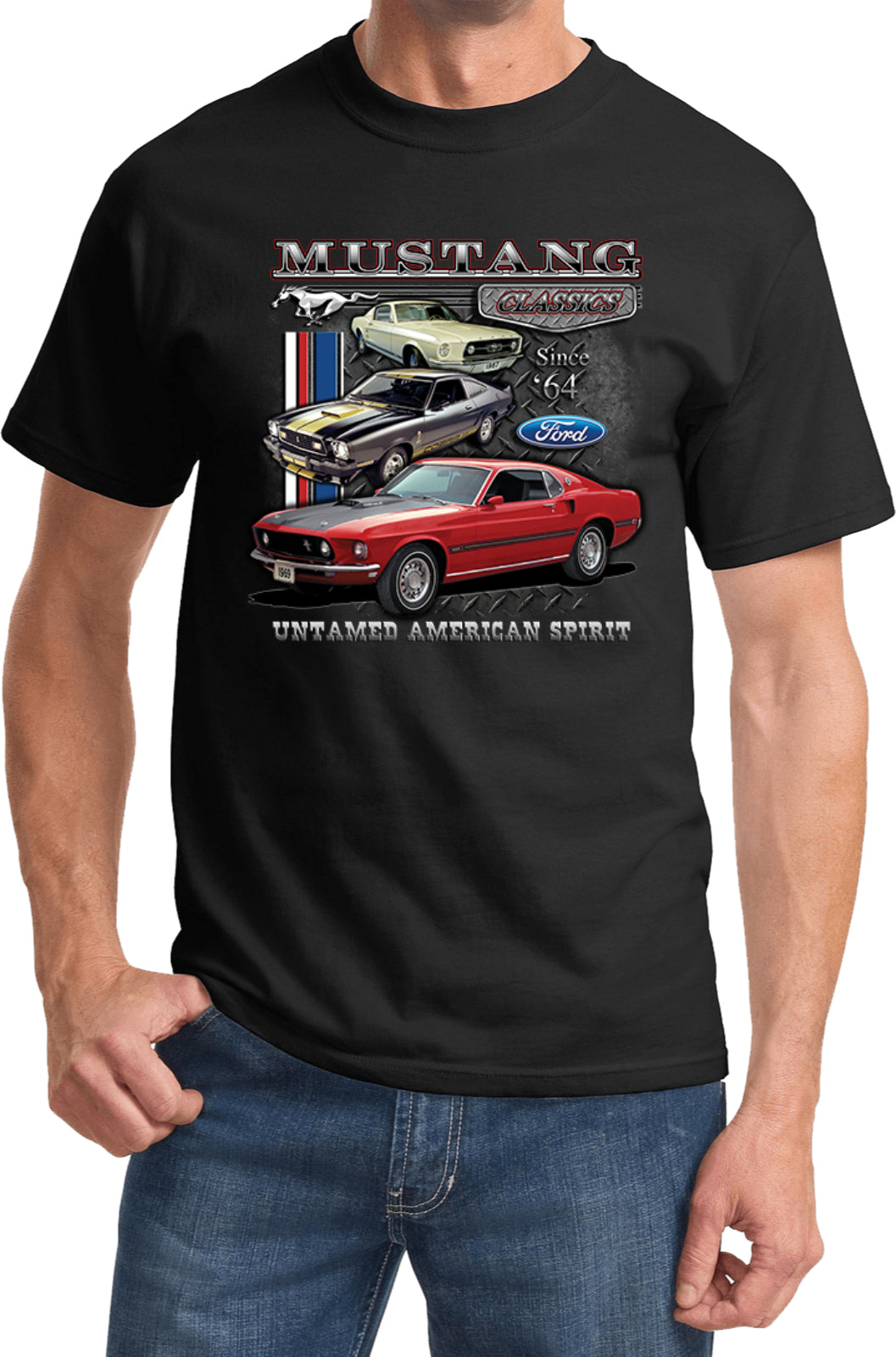 • A mens t-shirt featuring a collection of classic Ford Mustangs Since 1964