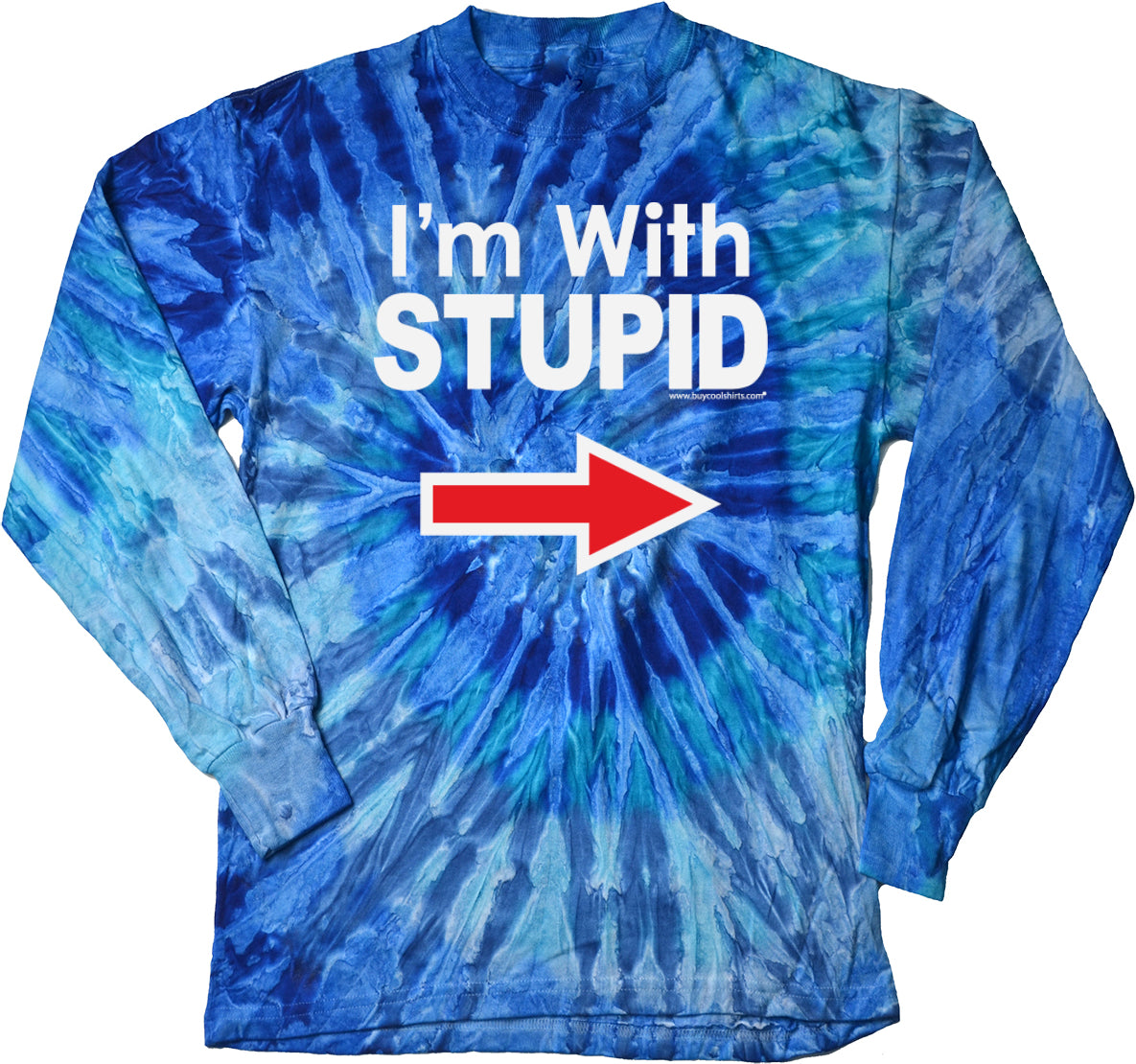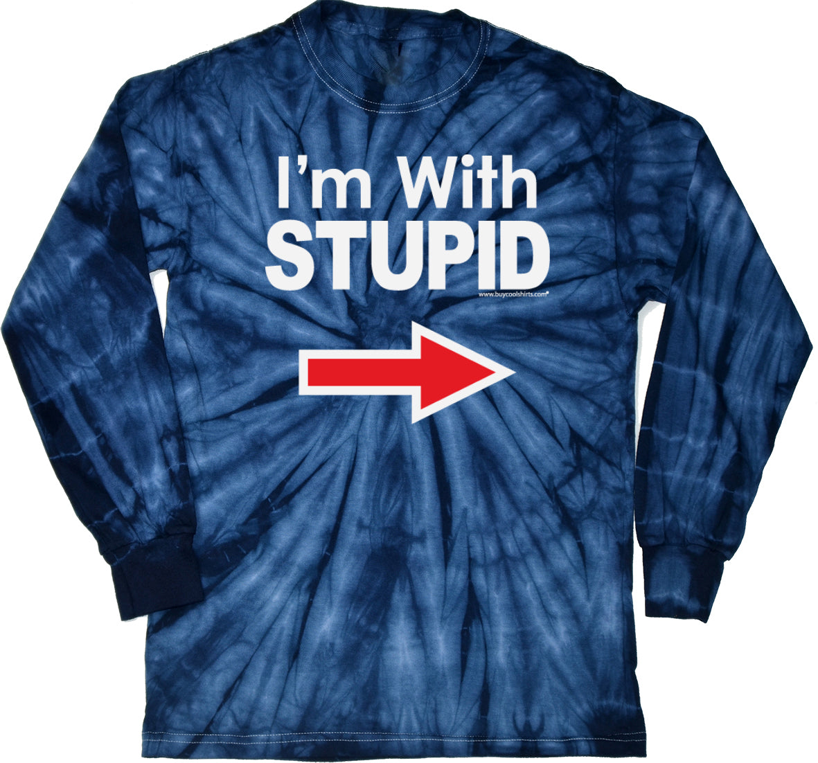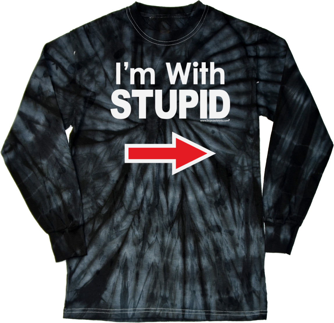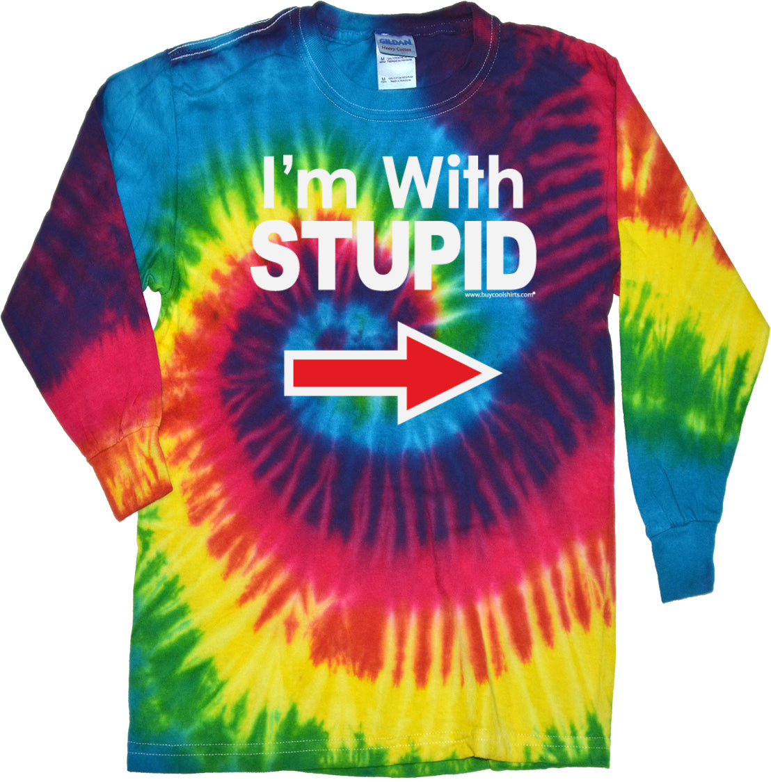 • A long sleeve tie dye shirt featuring I'm With Stupid