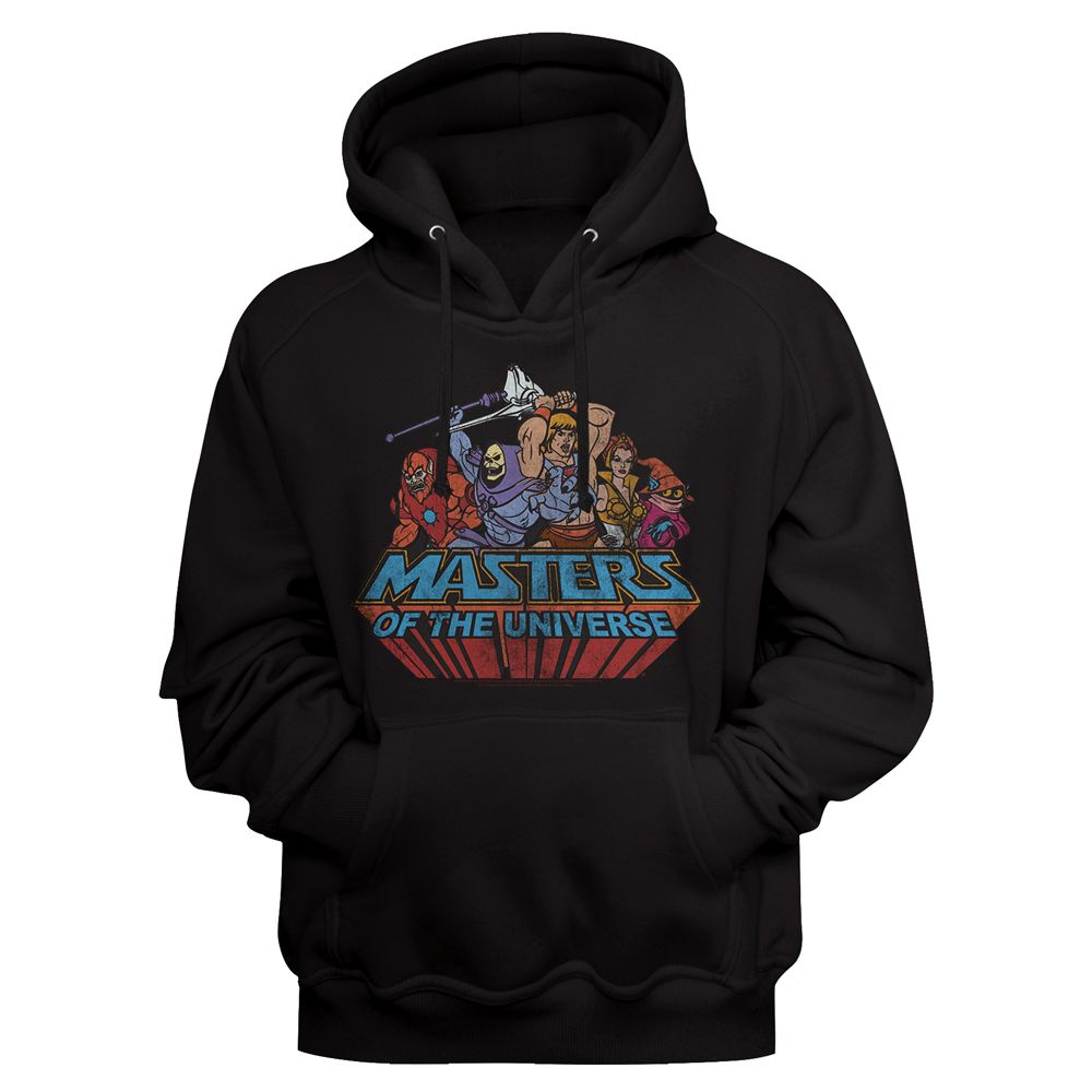 An officially licensed Masters of the Universe pullover hooded sweatshirt that fits both men and women with its traditional silhouette. Made from a comfortable blend of cotton/polyester. The hoodie features a group photo with the logo shown below. Masters of the Universe is an animated film and tv series from the 80s centered on He-Man the powerful hero who defends Castle Grayskull from evil lord Skeletor. This hoodie makes the perfect gift for fans and is great for comfortable every day wear.