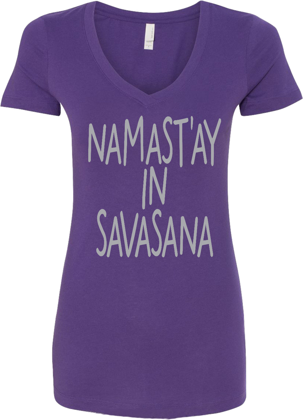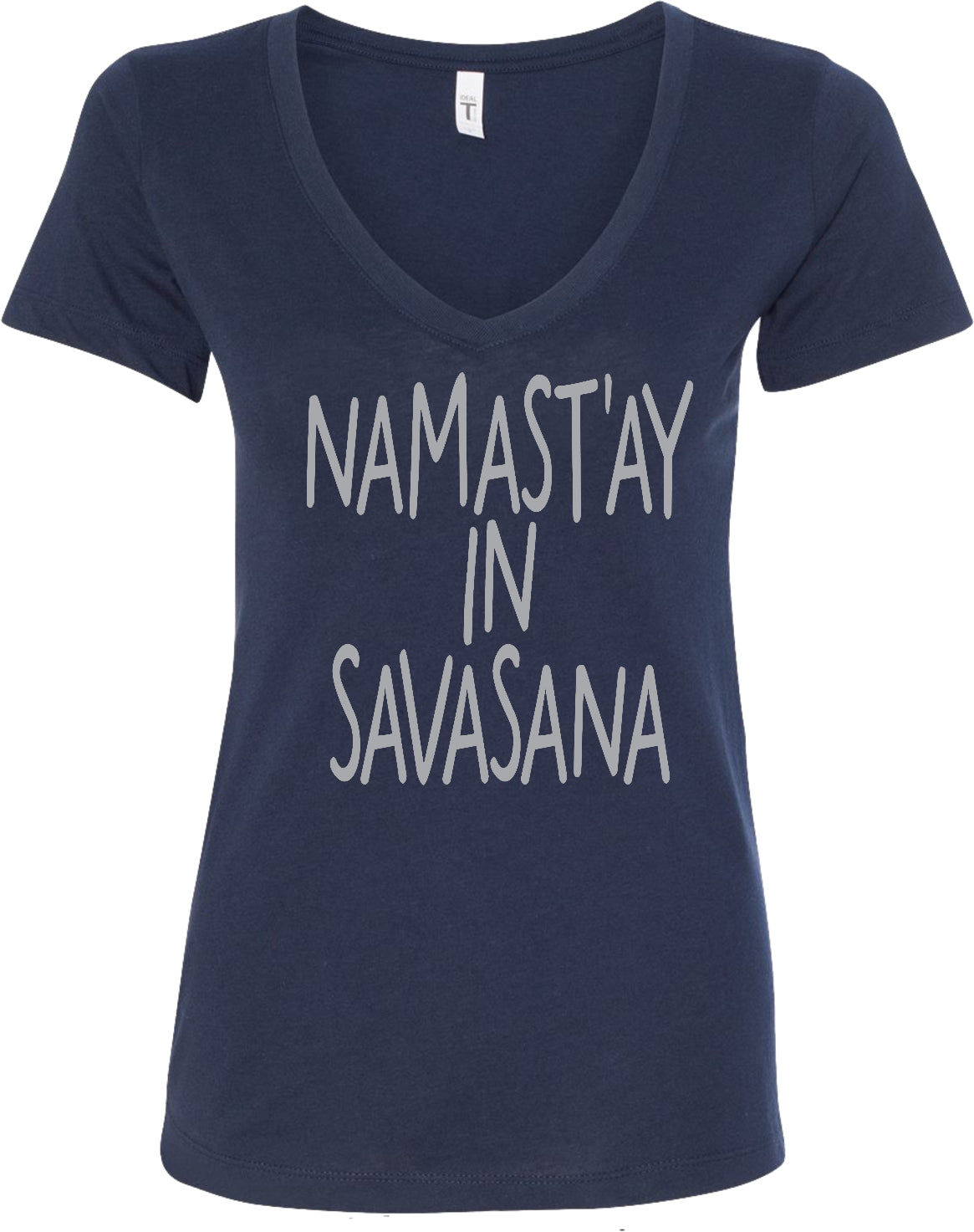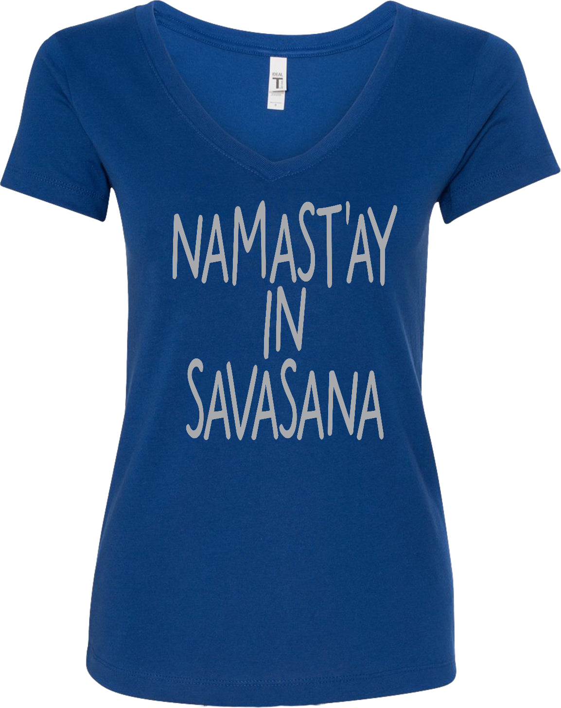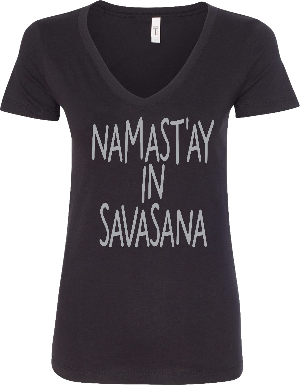 • A ladies v-neck shirt that reads Namastay in Savasana
