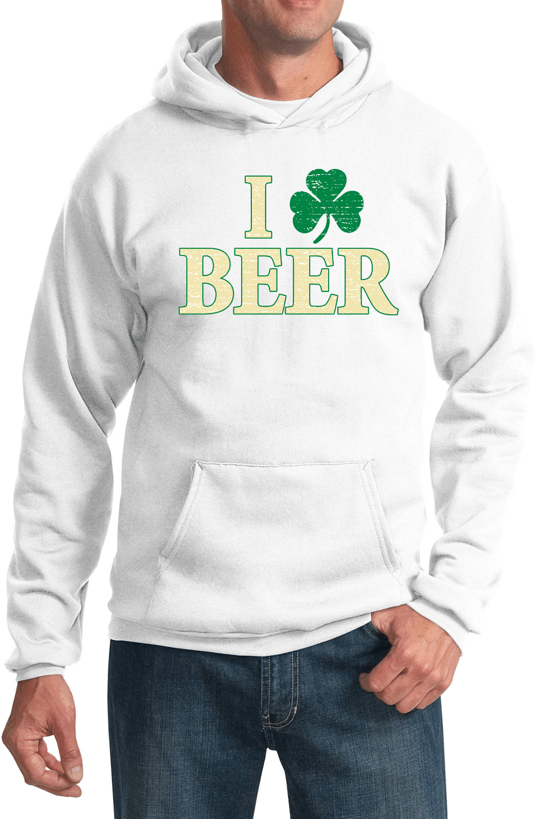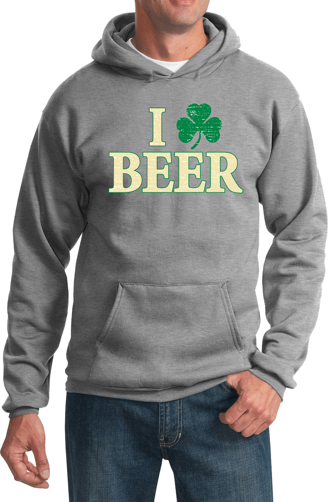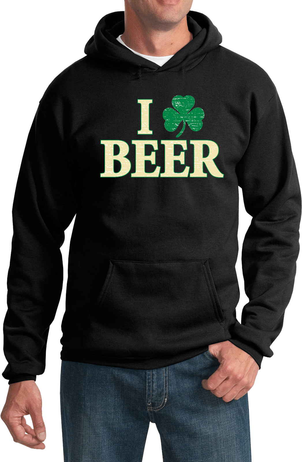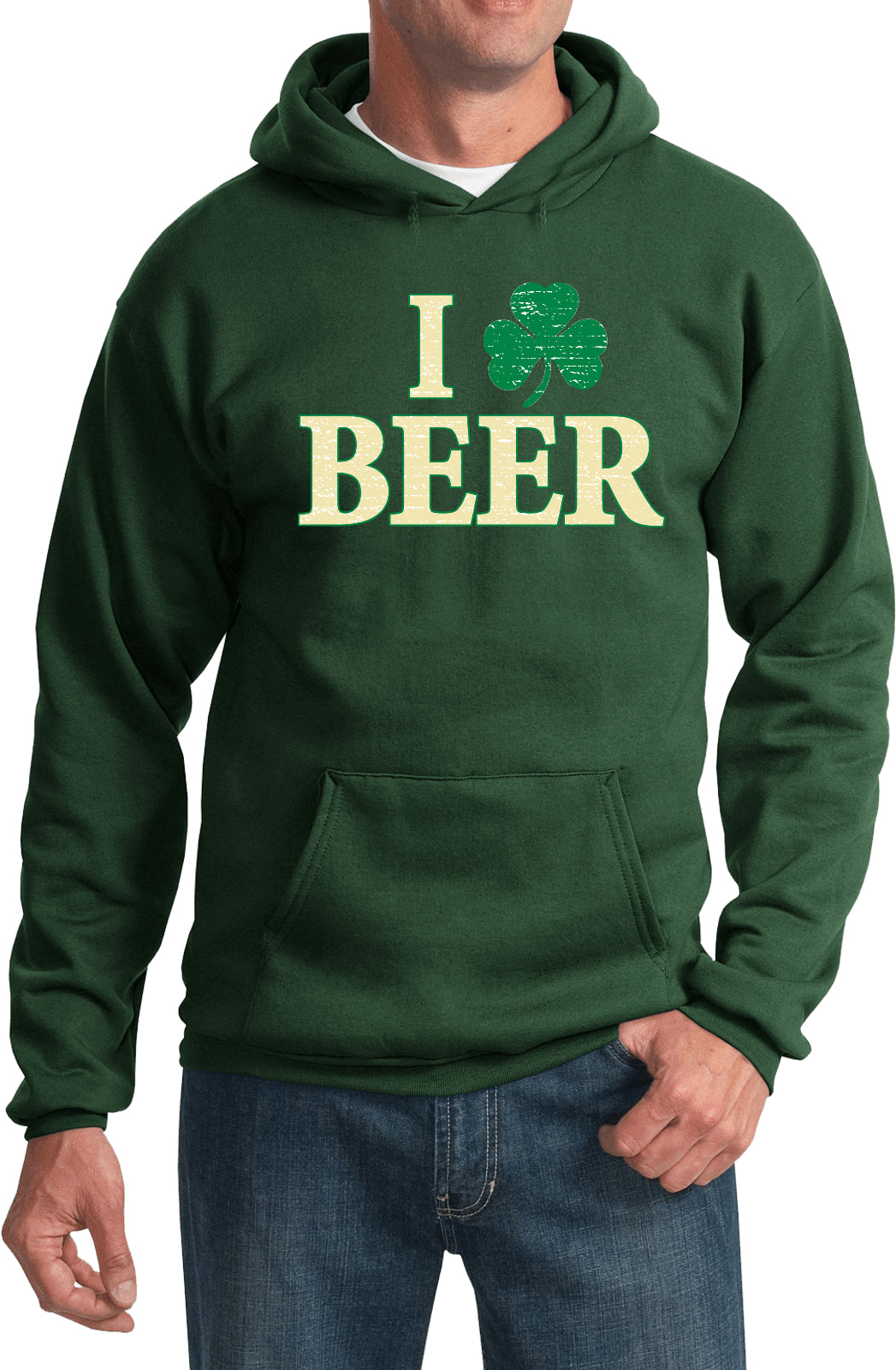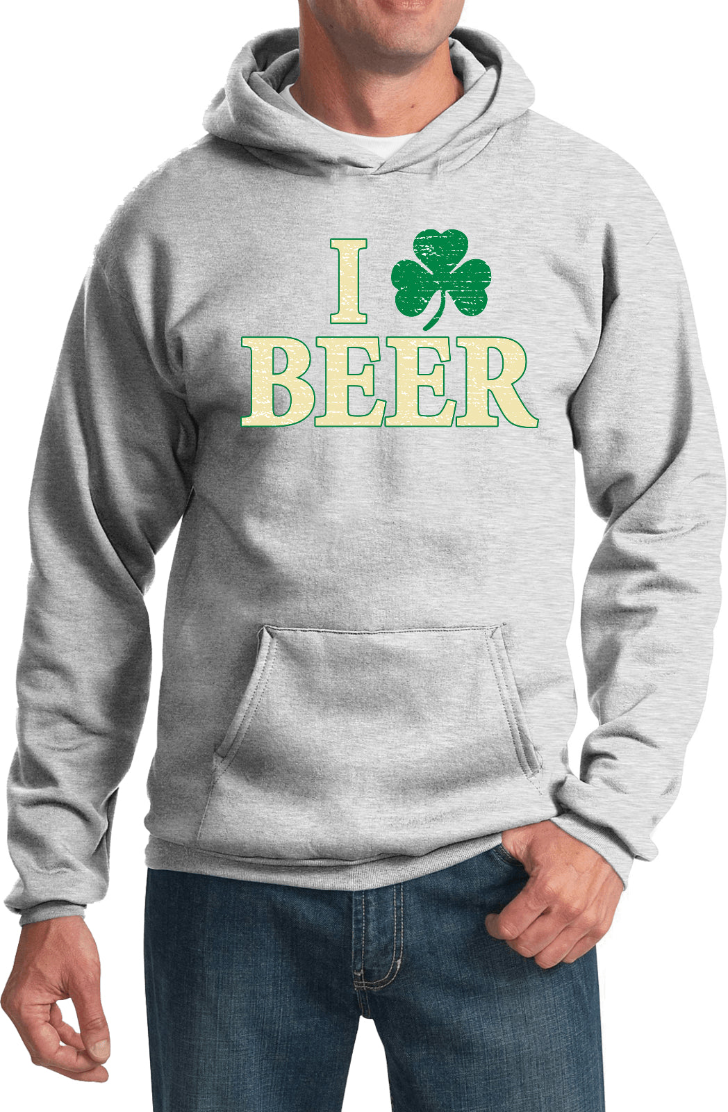 - A St. Patrick's Day hoodie featuring I Love Beer with a shamrock replacing the heart