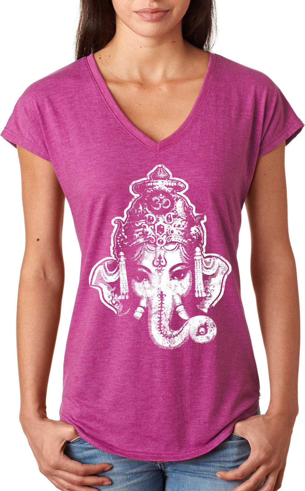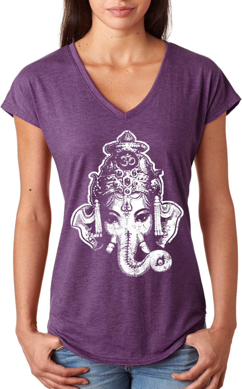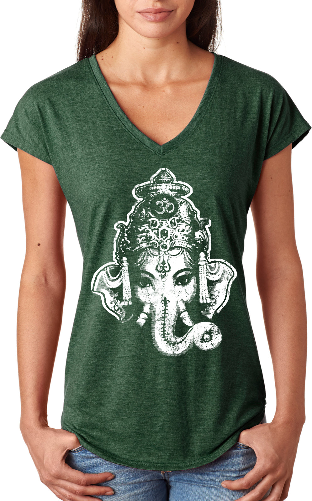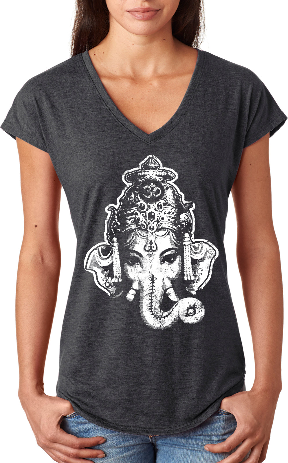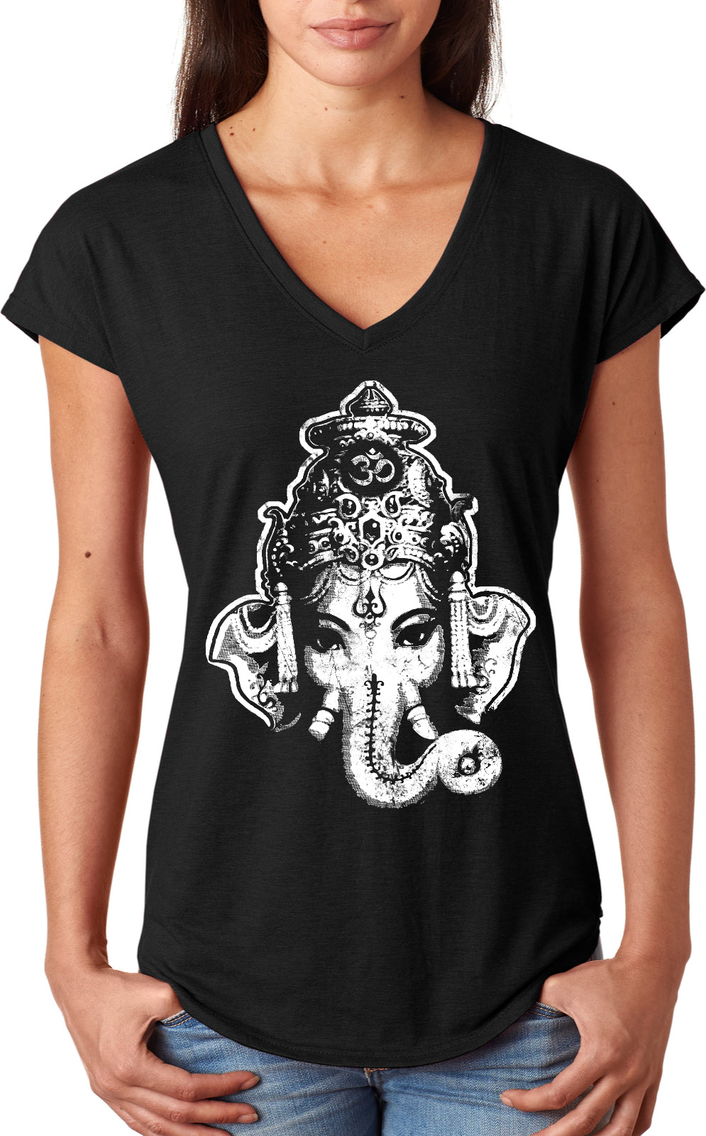 - A ladies tri blend v-neck t-shirt featuring a vintage Ganesha head design