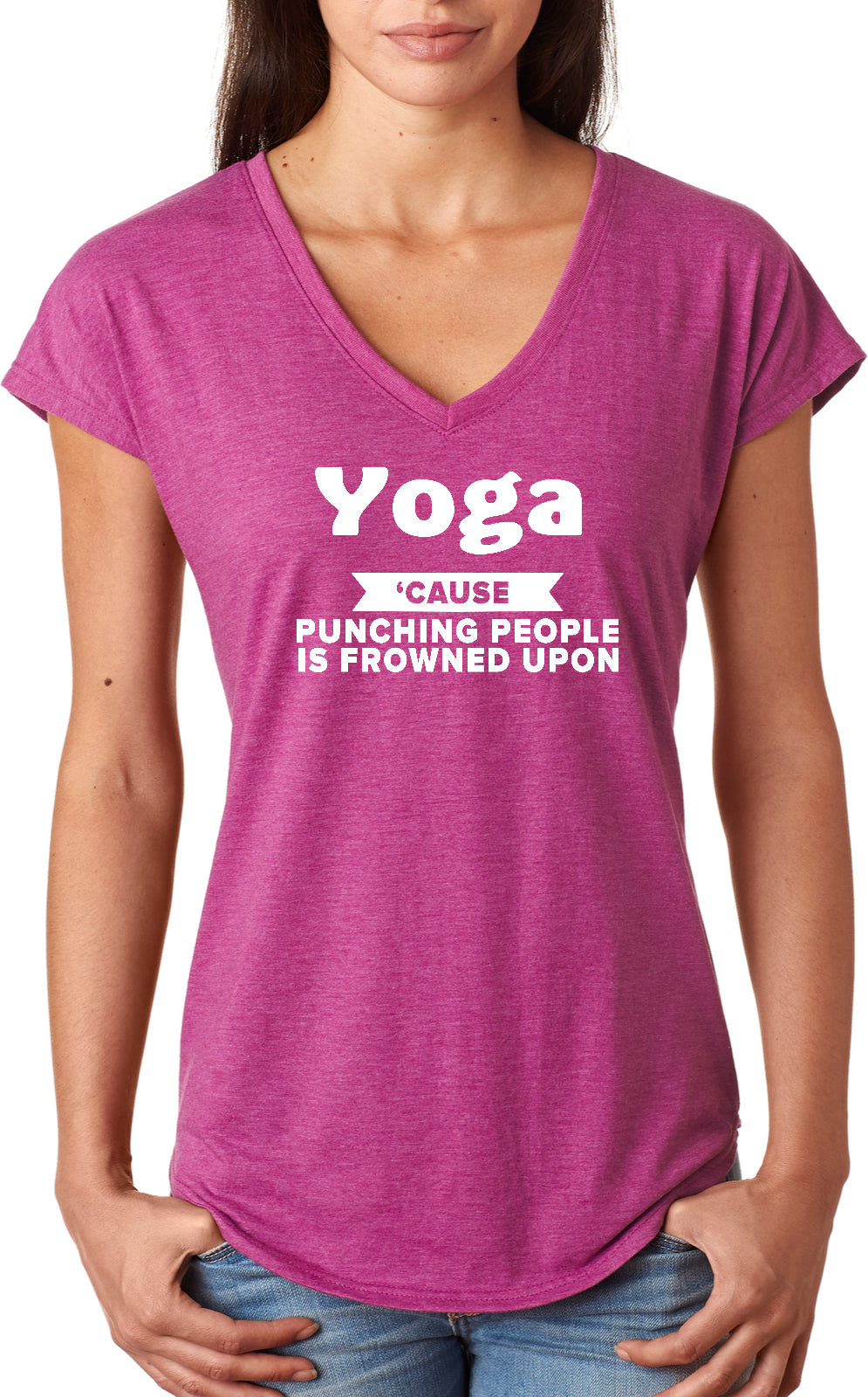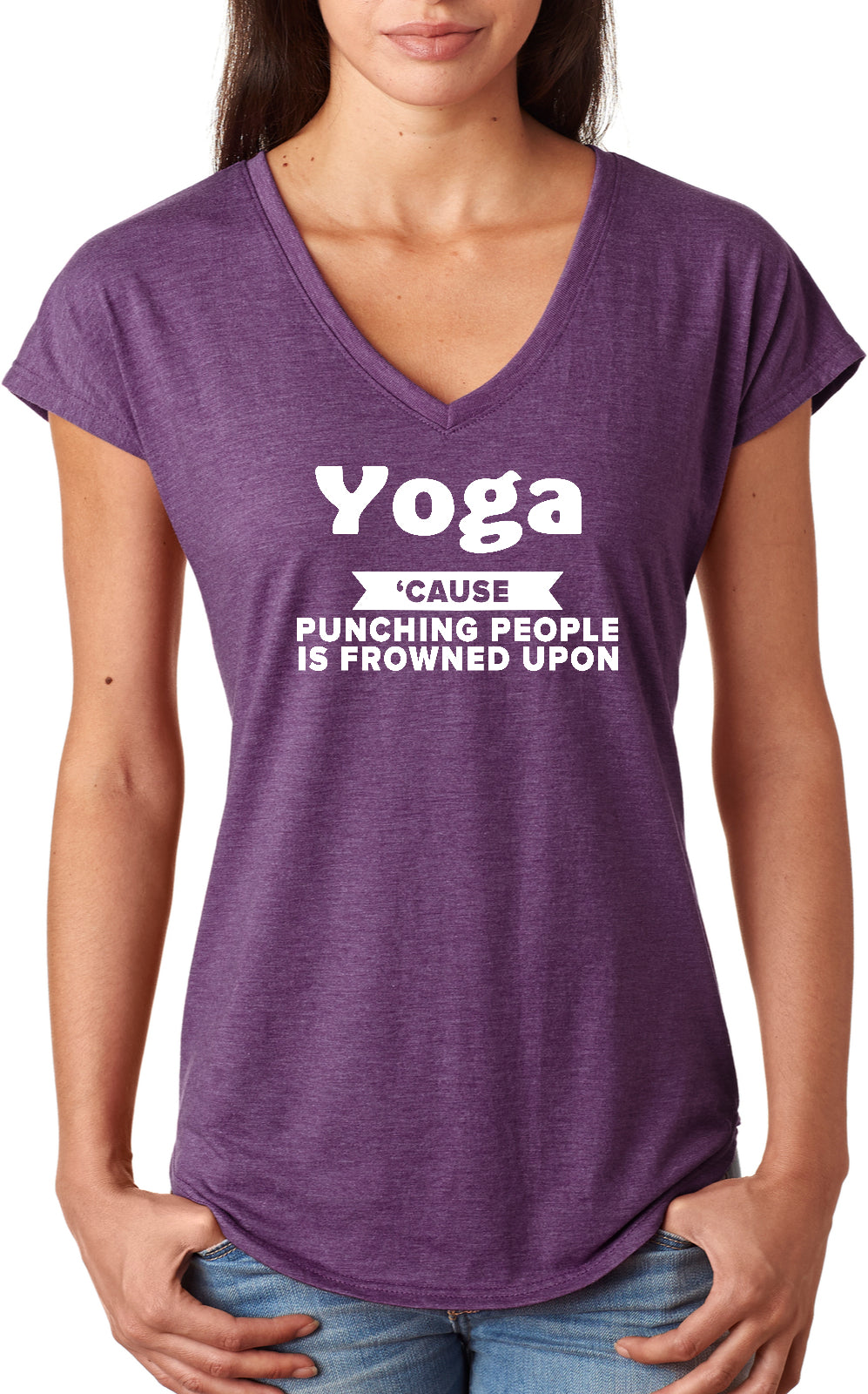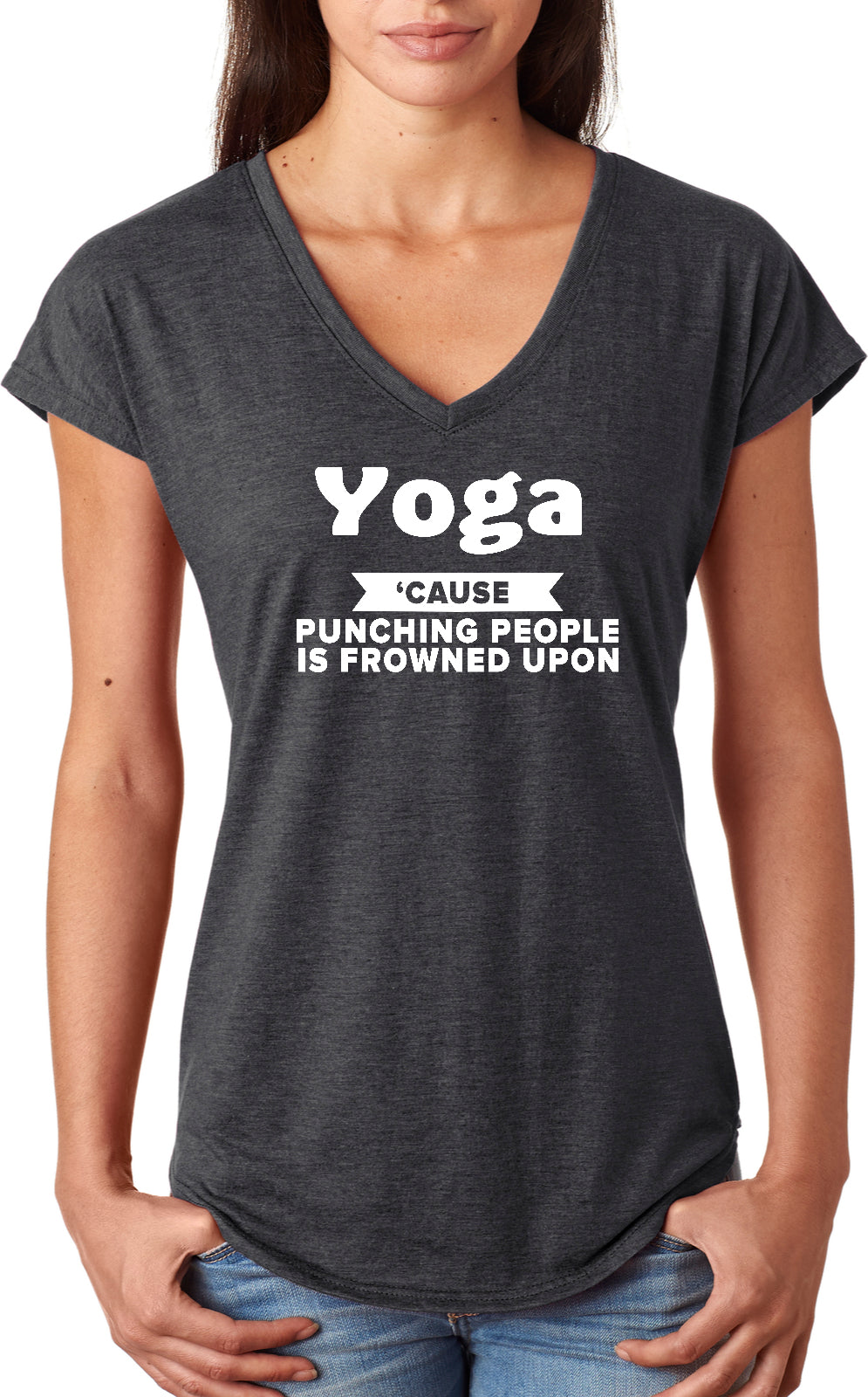 - A ladies tri blend v-neck t-shirt featuring the funny yoga saying: Yoga 'Cause Punching People is Frowned Upon