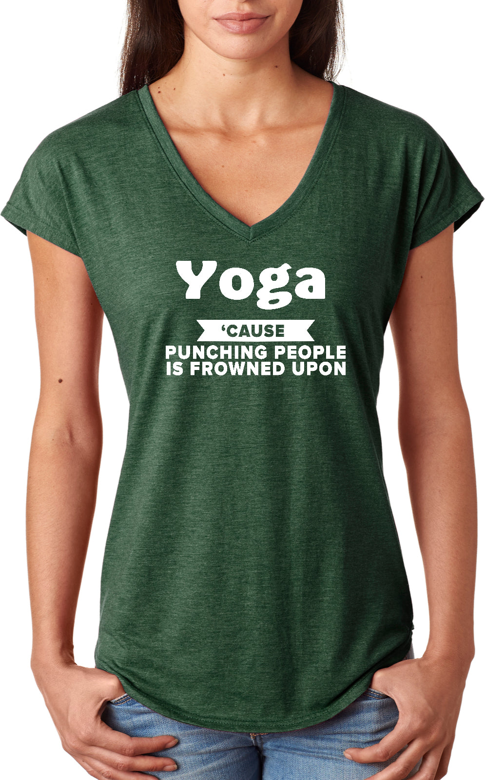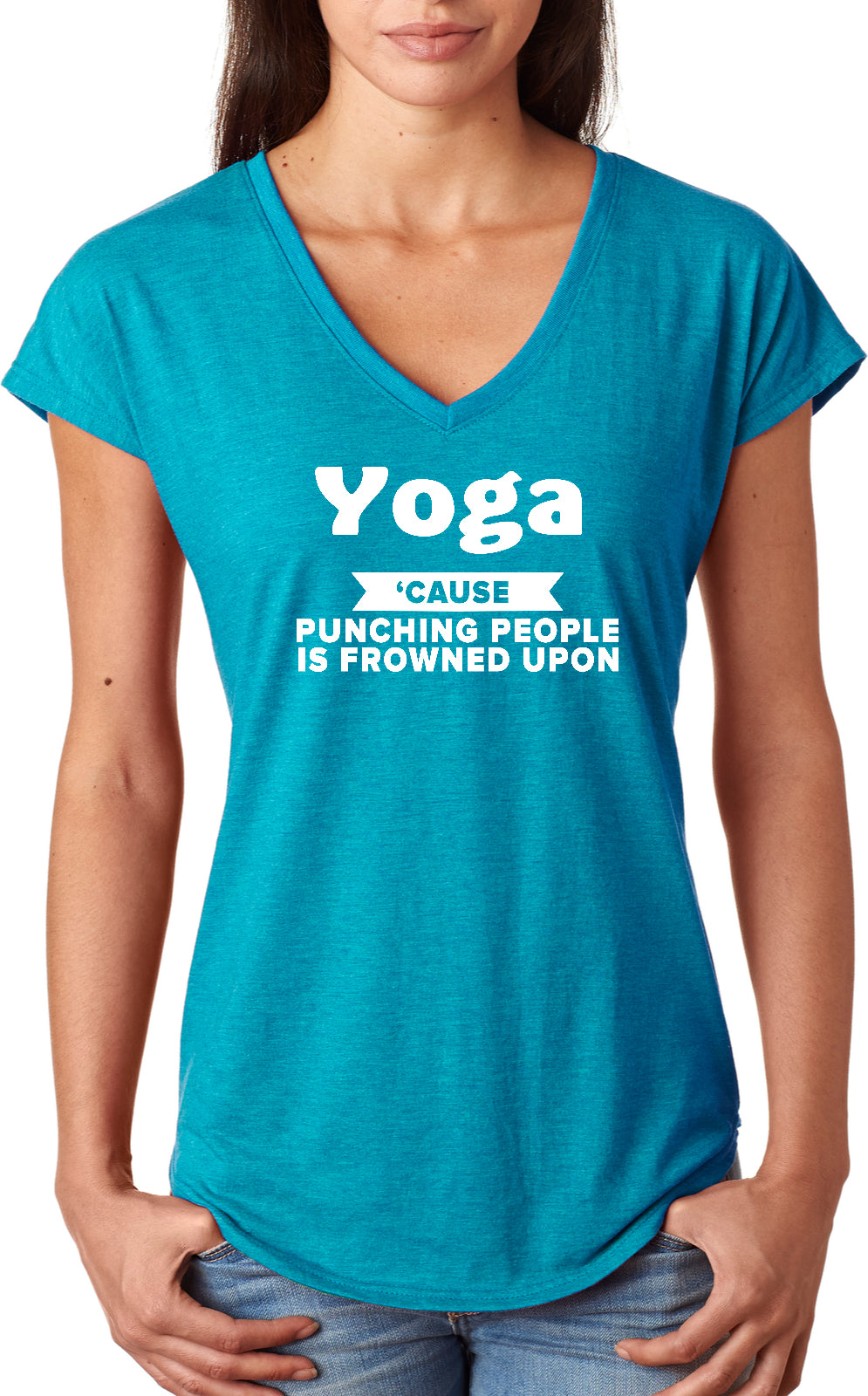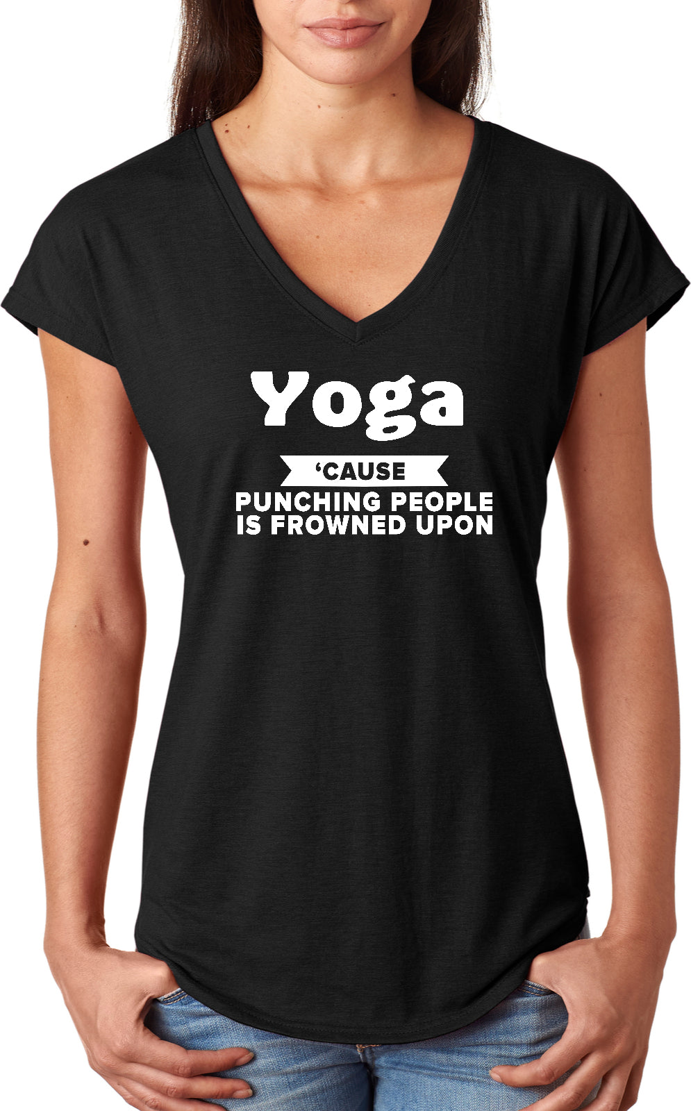 - A ladies tri blend v-neck t-shirt featuring the funny yoga saying: Yoga 'Cause Punching People is Frowned Upon