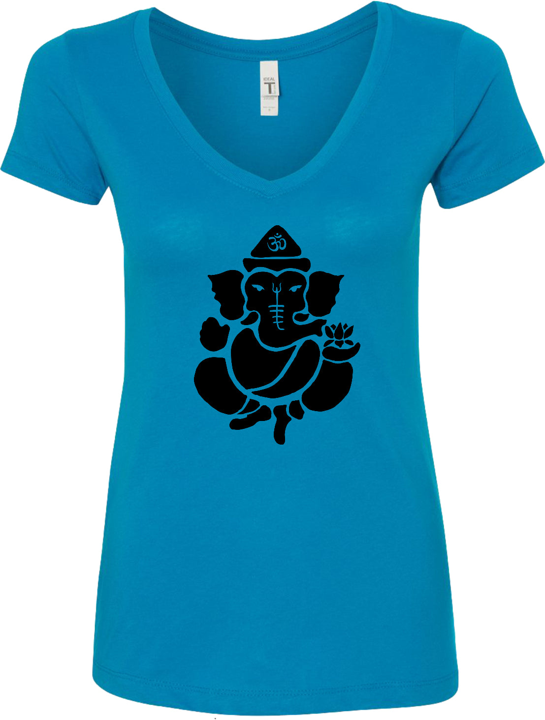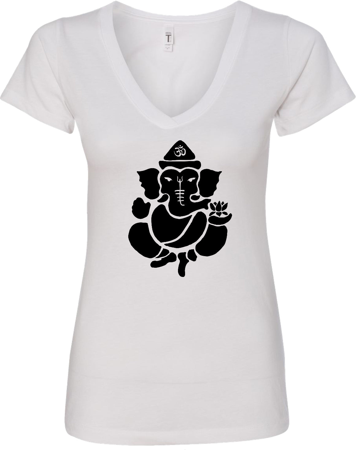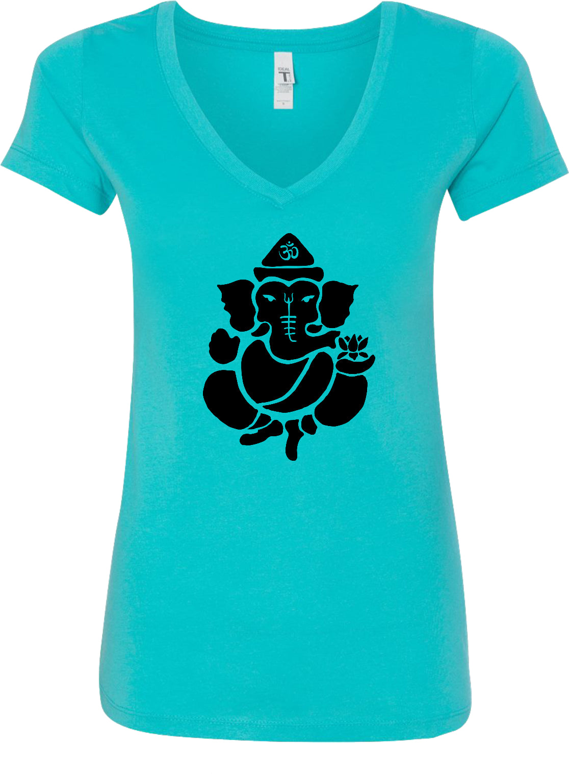 • A ladies blended v-neck t-shirt featuring the wise Ganesha