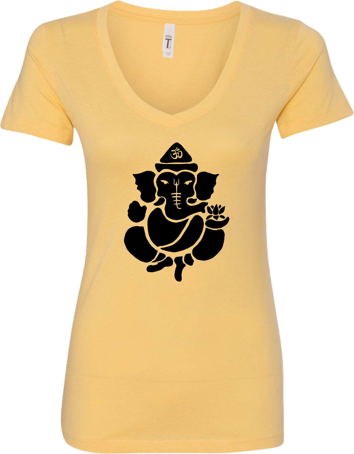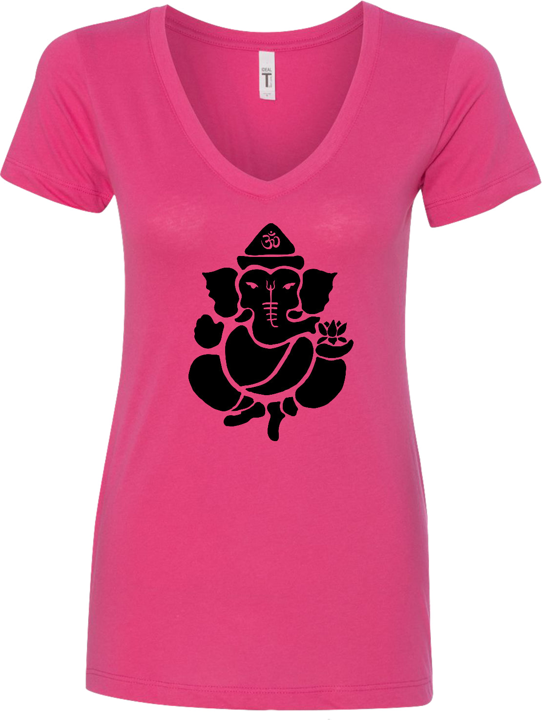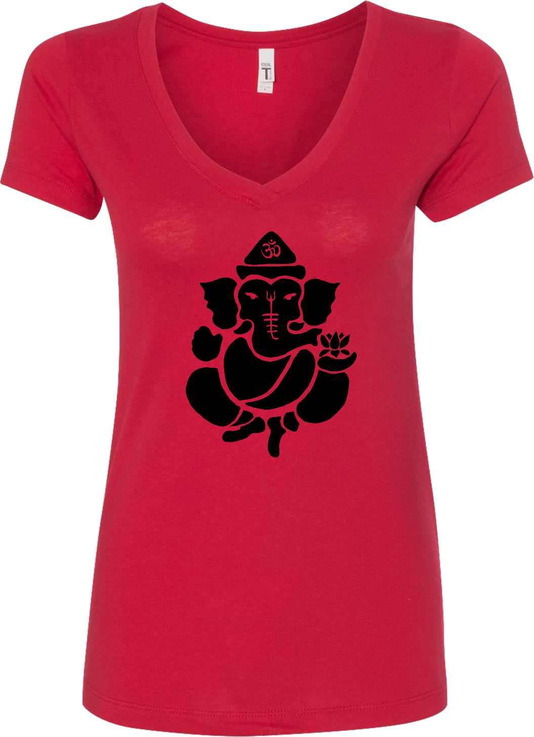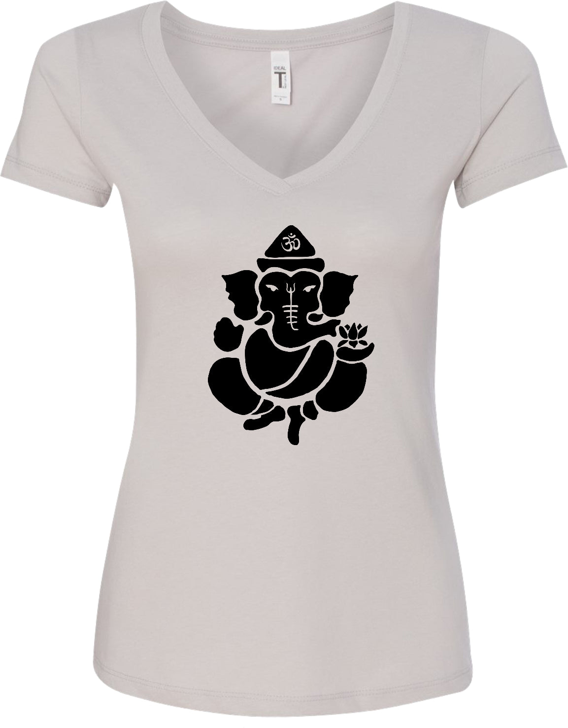 • A ladies blended v-neck t-shirt featuring the wise Ganesha