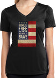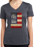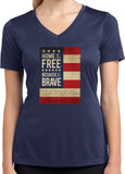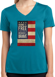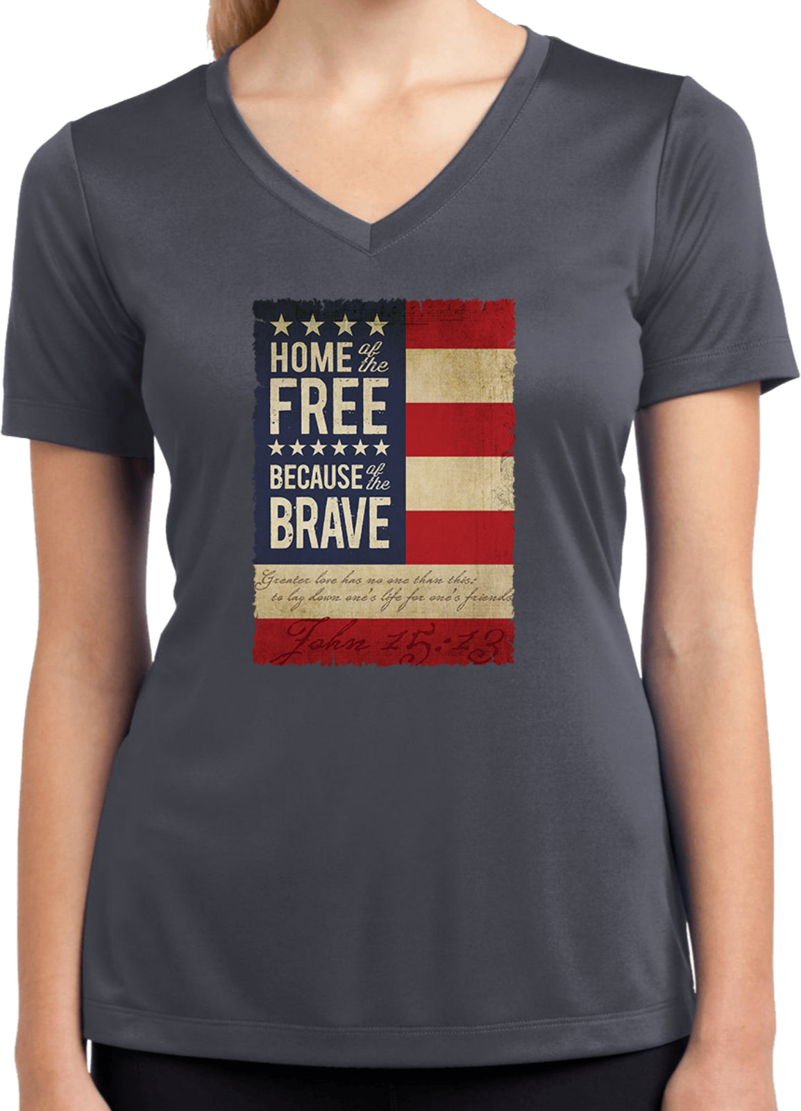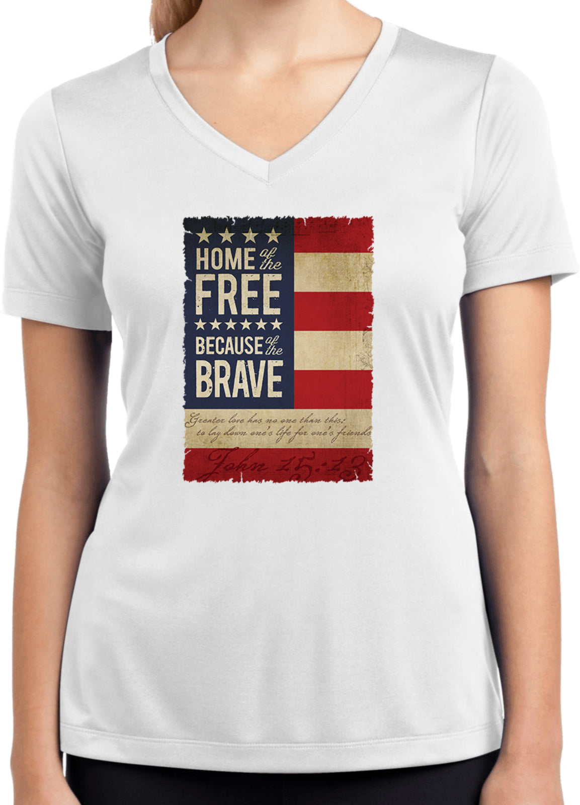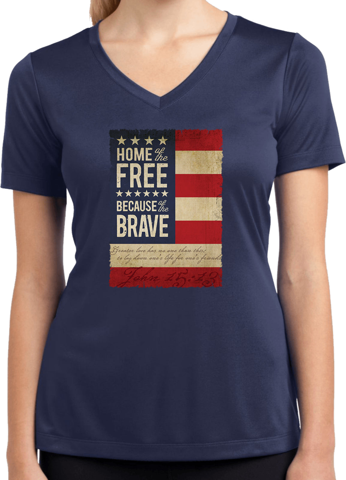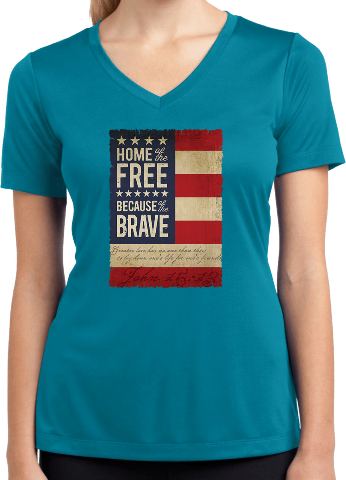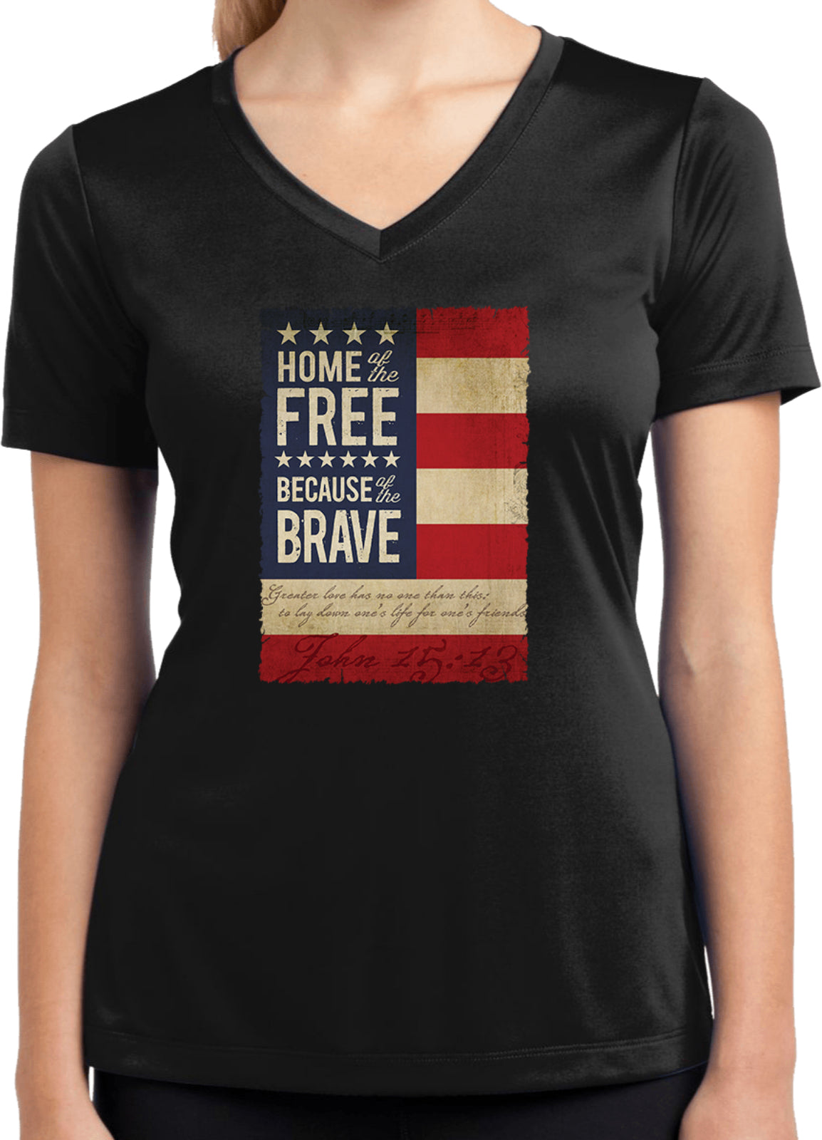 - A ladies dry wicking v-neck featuring Home of the Free Because of the Brave