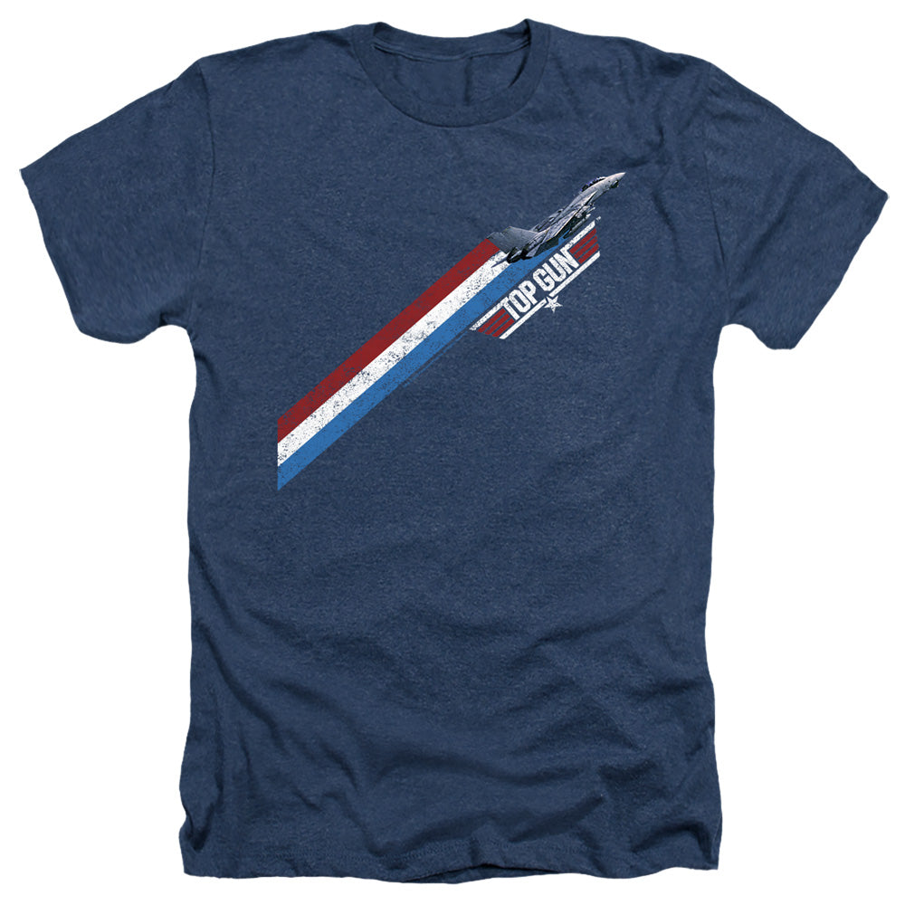 An officially licensed Top Gun heather shirt that fits both men and women. Made from comfortable cotton/poly. This tee makes a great gift for birthdays, holidays and even just to treat yourself. The design features a vintage photo of the F-14A Tomcat taking off and leaving behind red, white and blue stripes.