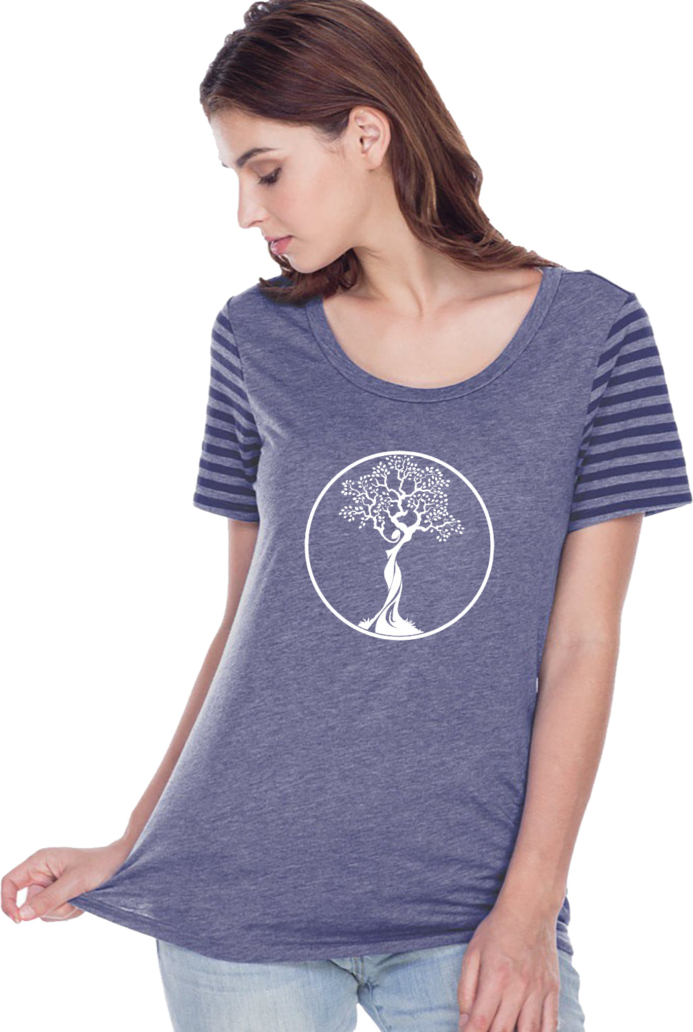 • A ladies striped multi-contrast t-shirt featuring the white tree of life circle