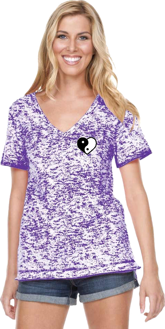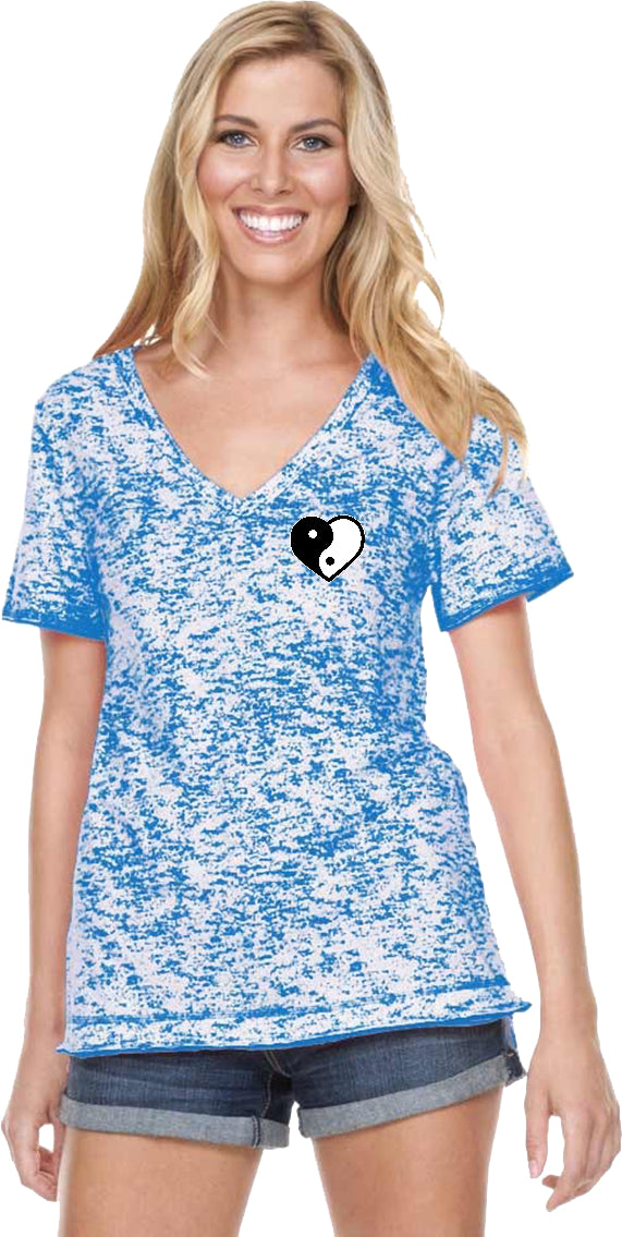 - A ladies burnout v-neck t-shirt featuring the yin yang heart pocket print