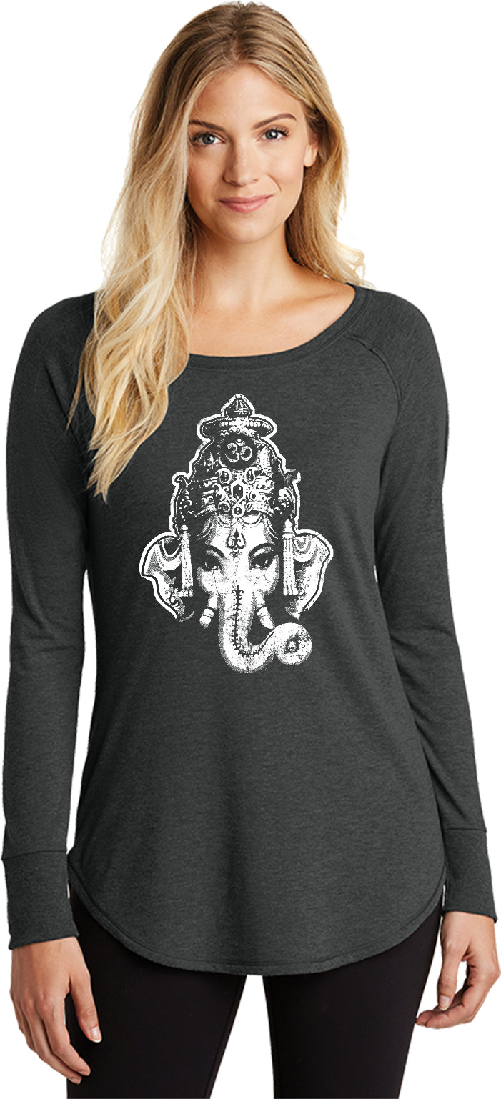 - A ladies long sleeve tunic t-shirt featuring a distressed image of Ganesha