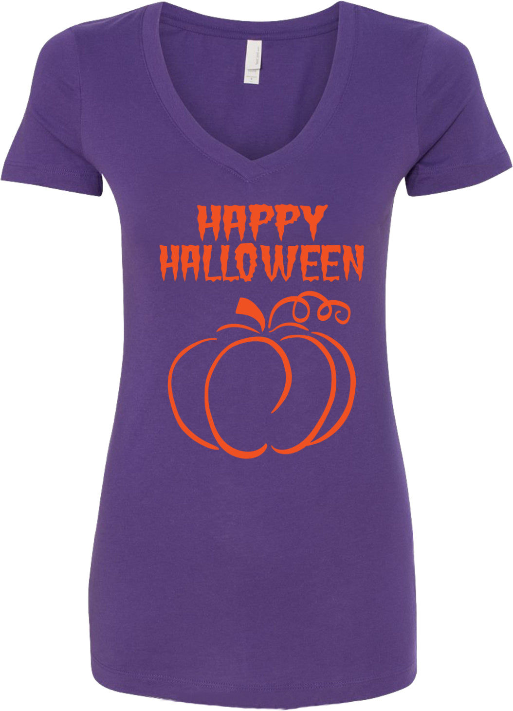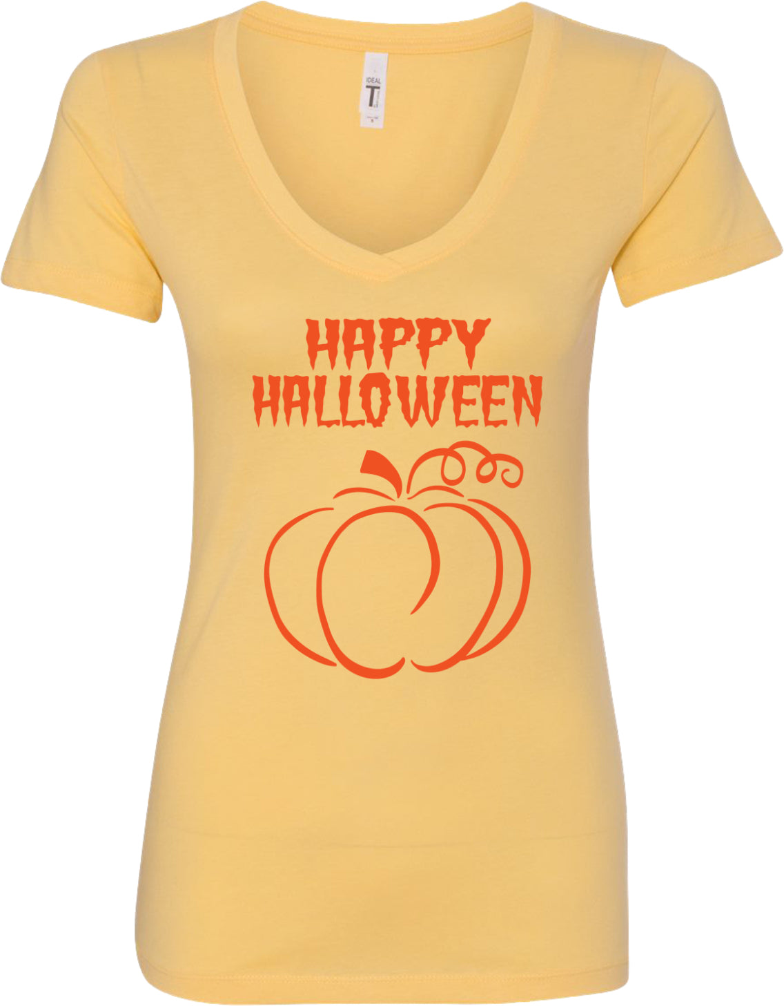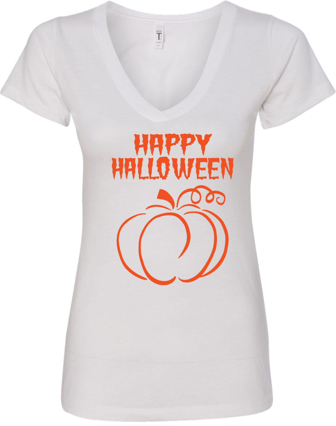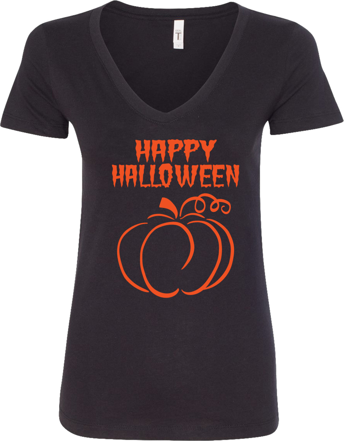 - A ladies v-neck shirt that reads Happy Halloween with a sketched pumpkin underneath