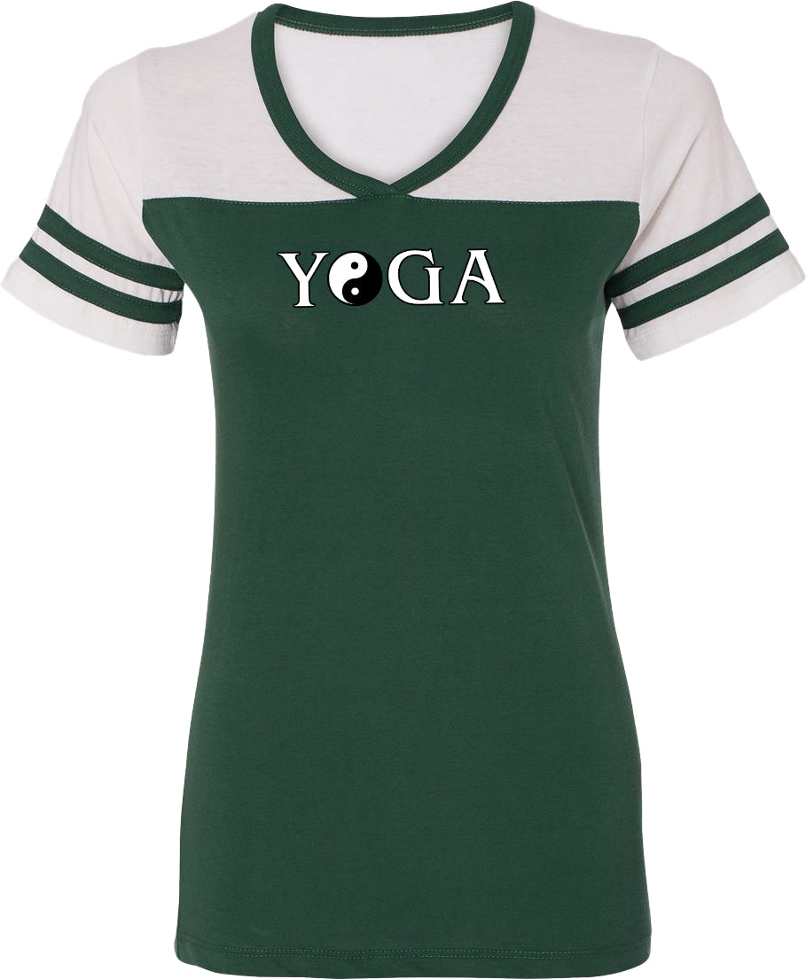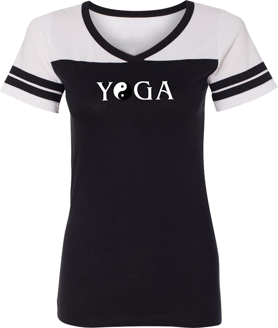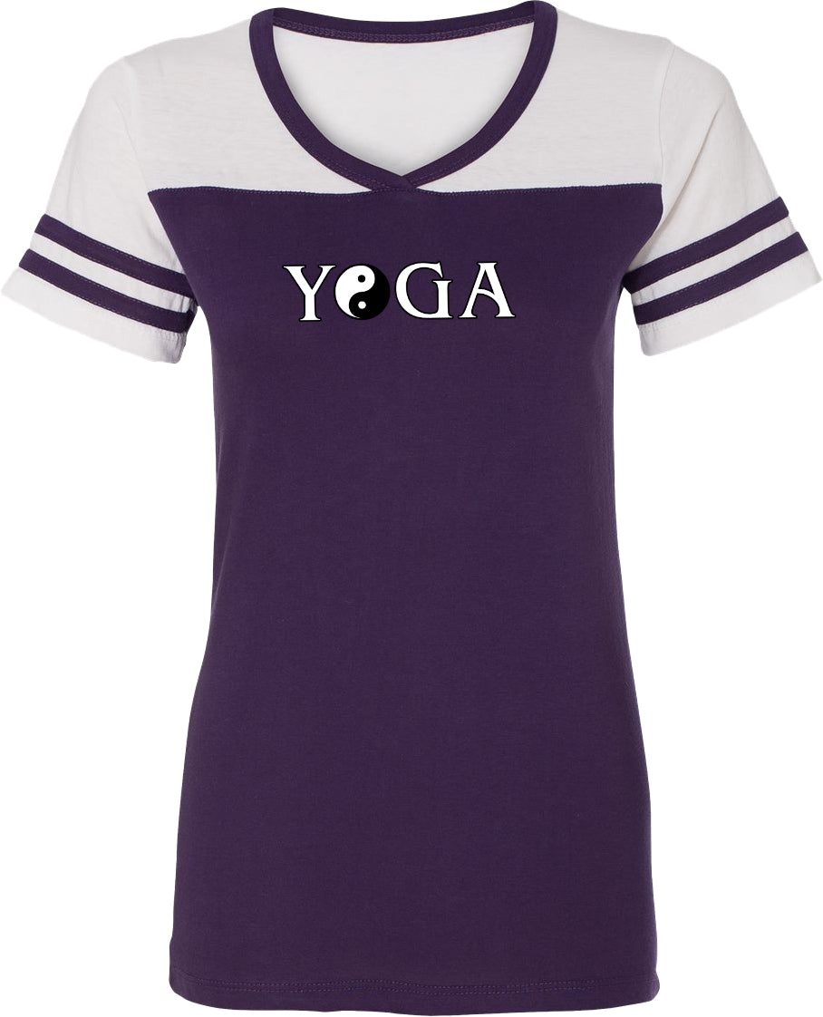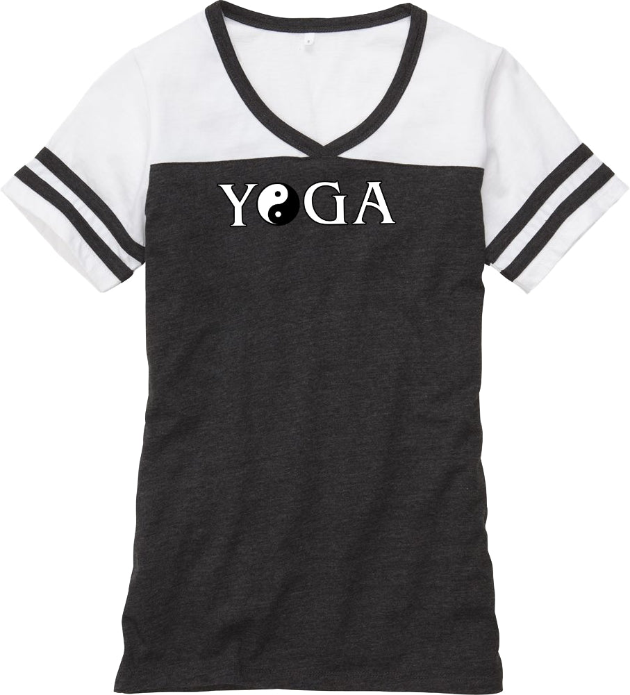 - A ladies powder puff t-shirt featuring yin yang inside of the yoga text