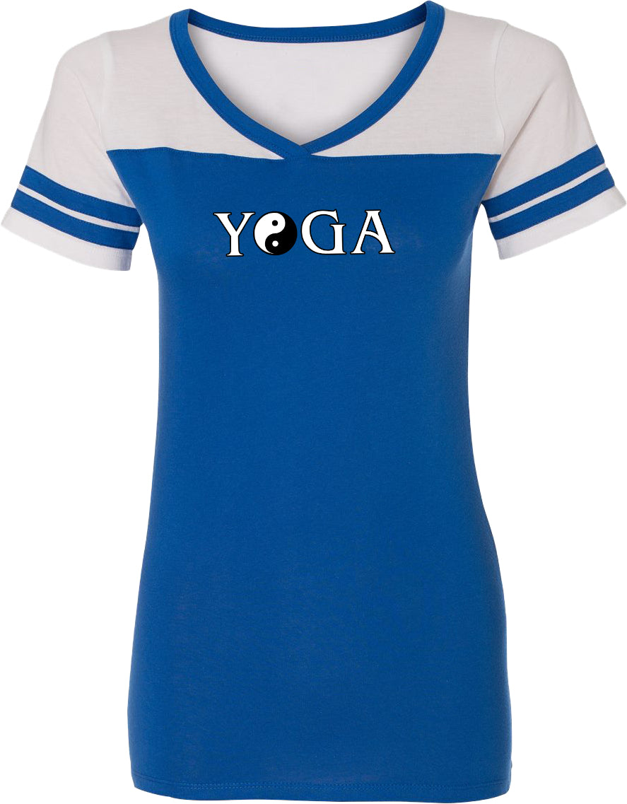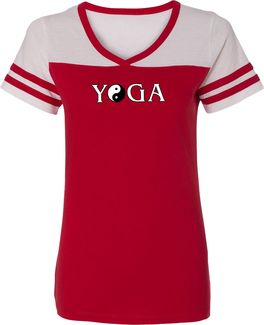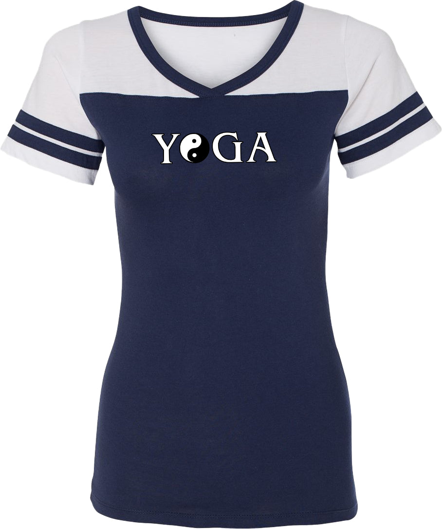 - A ladies powder puff t-shirt featuring yin yang inside of the yoga text