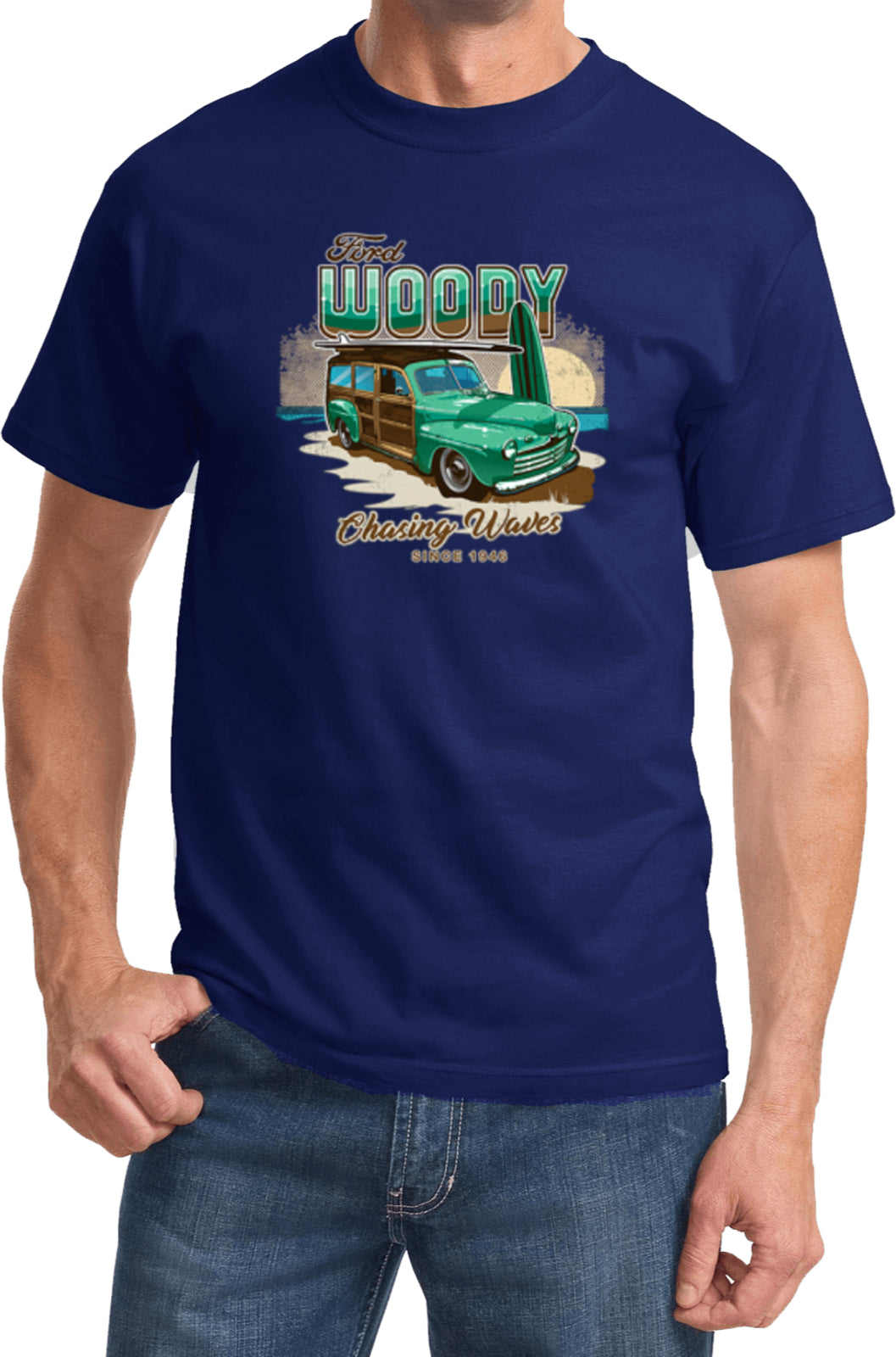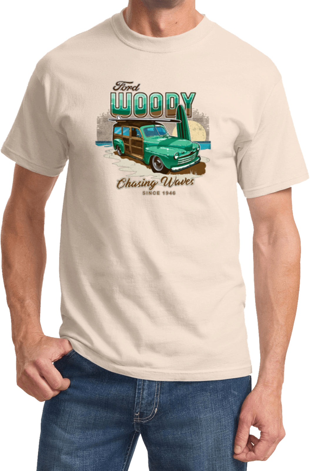 A unisex adult t-shirt that fits both men and women with its traditional silhouette. It is made of 100% cotton with the exception of Ash which is made with a blend of cotton/polyester. The design features a picture of a classic Ford Woody and reads Chasing Waves Since 1946. This tee makes a perfect gift for birthdays, holidays or even just to treat yourself.