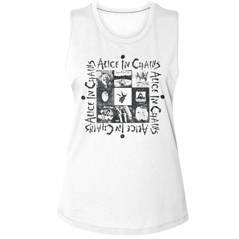Alice in Chains Vintage Album Collage Ladies Sleeveless Muscle White Tank Top